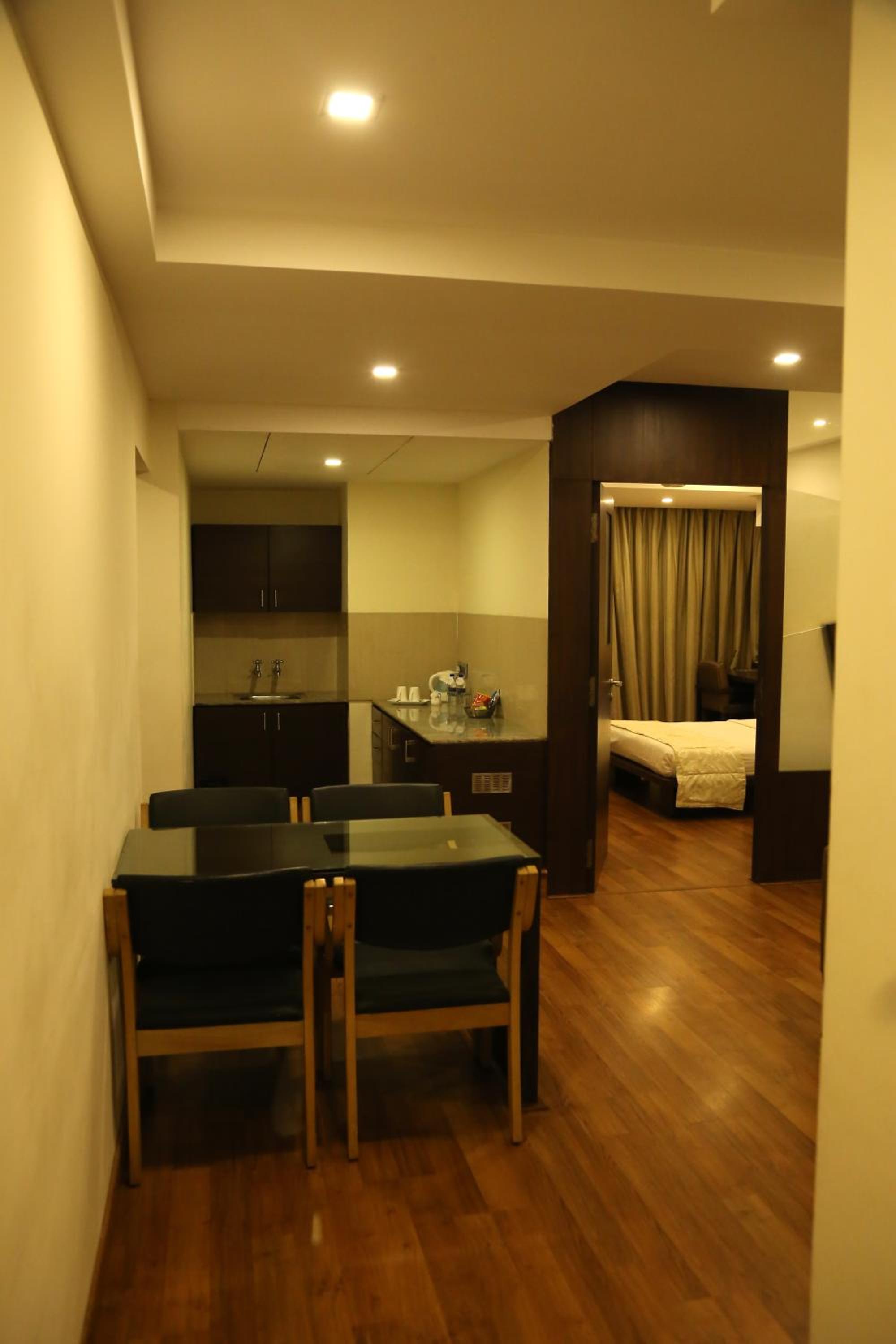 Starting with the room's floor and walls, there was spilt gravy on the dining table and the floor underneath around the couch area. The sink contained brown water (we didn't shower or brush our teeth, using bottled water instead). The pot and pot lid had dried fungus stains. The pillows were stained and dirty despite having white pillowcases. The curtains did not have blinders, so we were forced to wake up by 6.00 am. The TV had no entertainment channels except for some regional language channels. The carpets were not vacuumed, as they used a cloth broom to sweep the room. The floor was mopped with an old and dirty mop. I called the staff a couple of times to clean, and they promptly assisted. The pictures on Booking.com and other websites are completely misleading. I stayed in and booked many hotels, but this was the worst. Zero maintenance. Zero value for money.