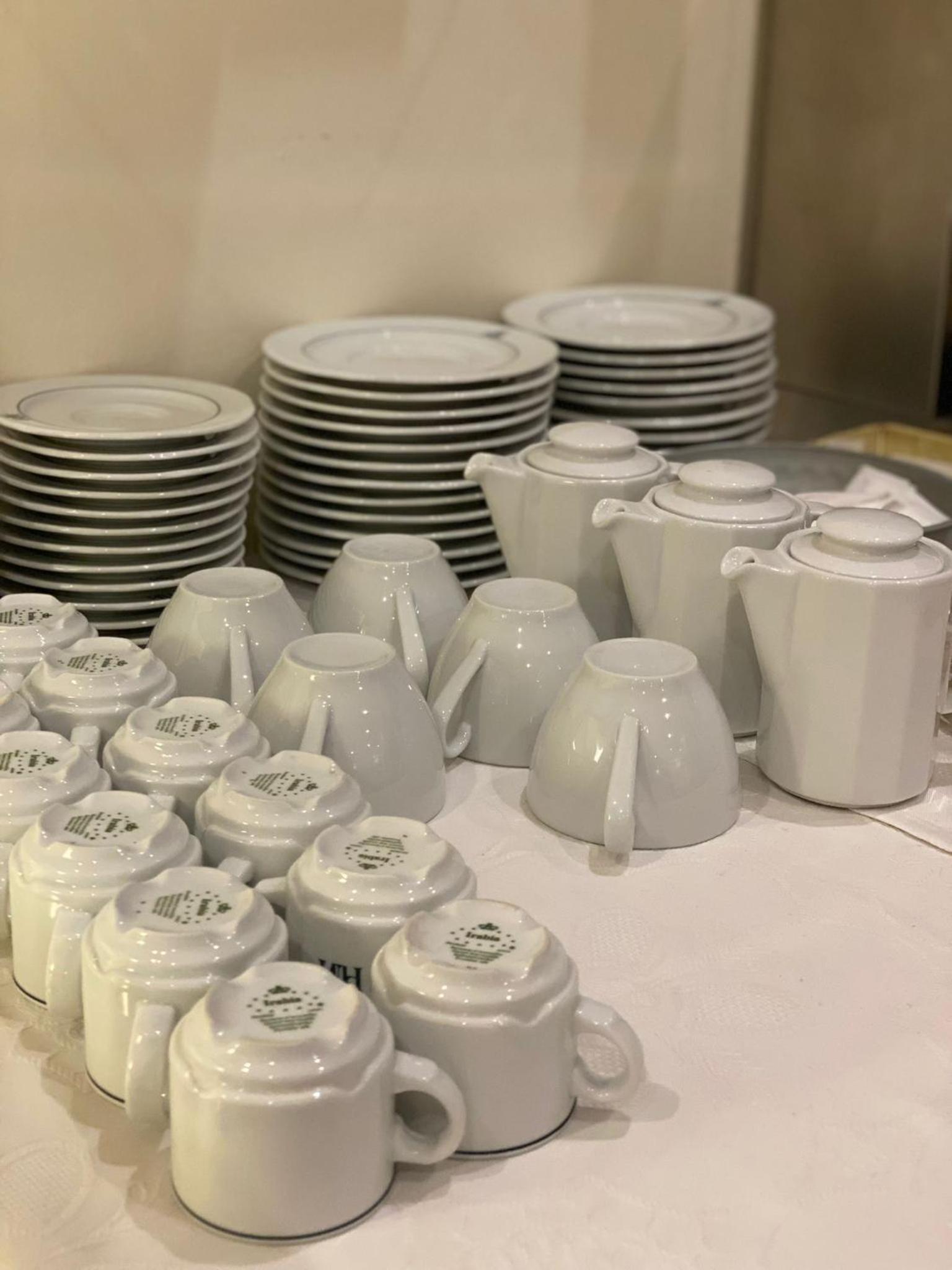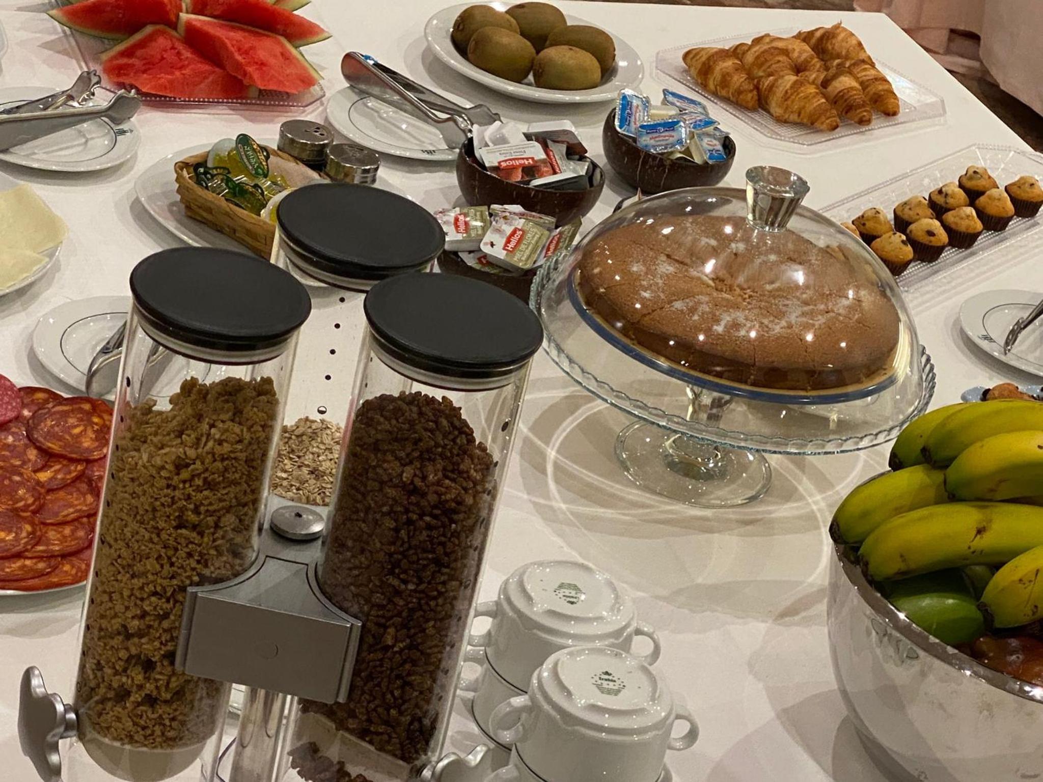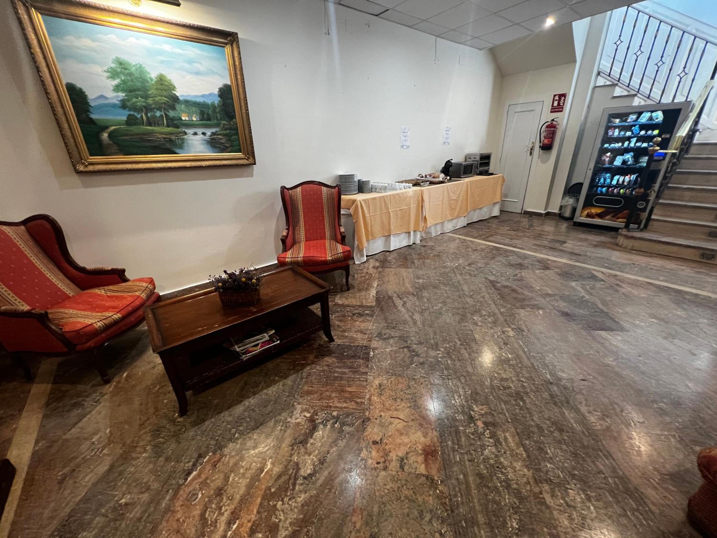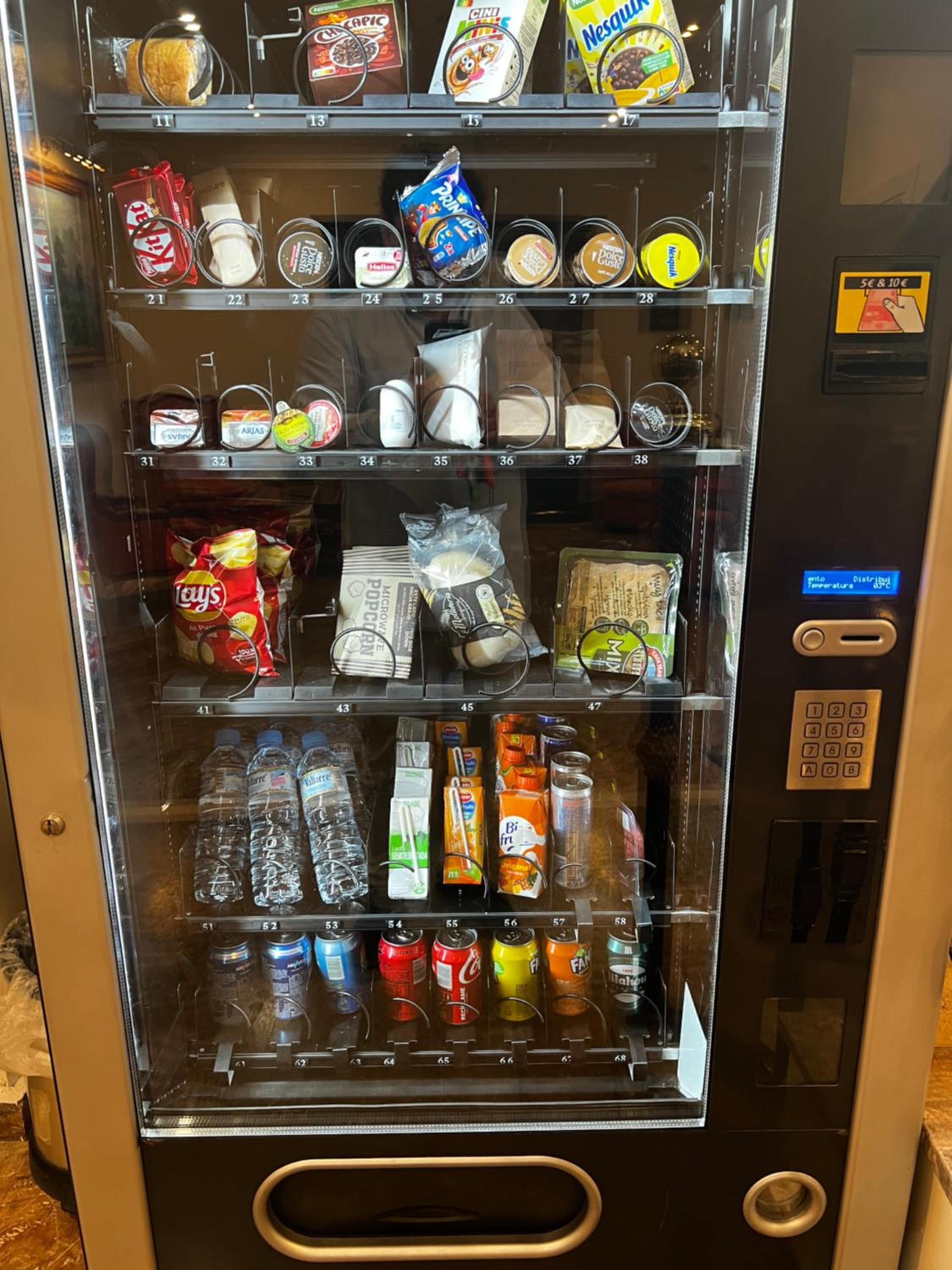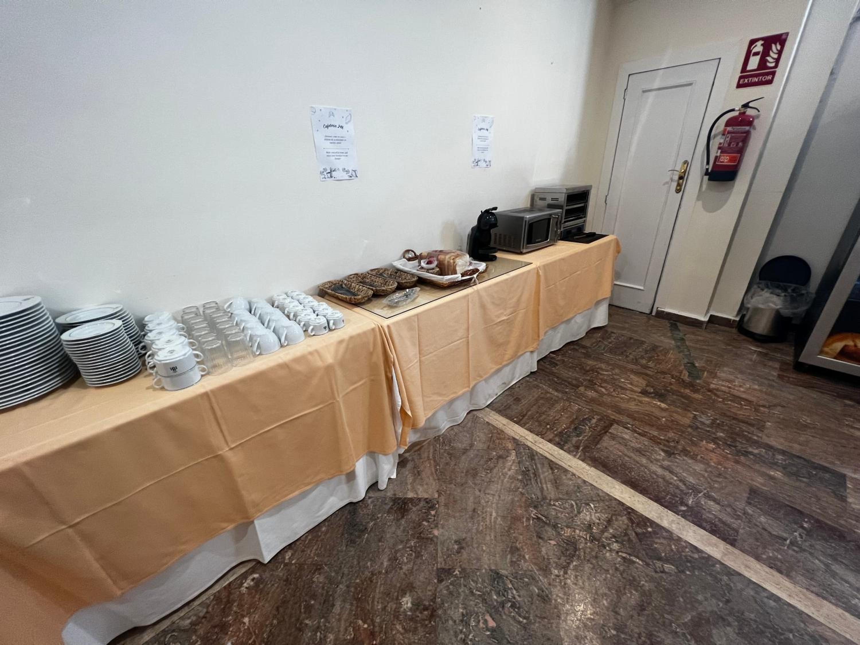 Hotel venido a menos, la cafetería en un sótano y sin servicio, tienes que servirte tu mismo, tienes las cápsulas de café en una máquina vending y la cafetera allí para hacerte tú mismo el café.