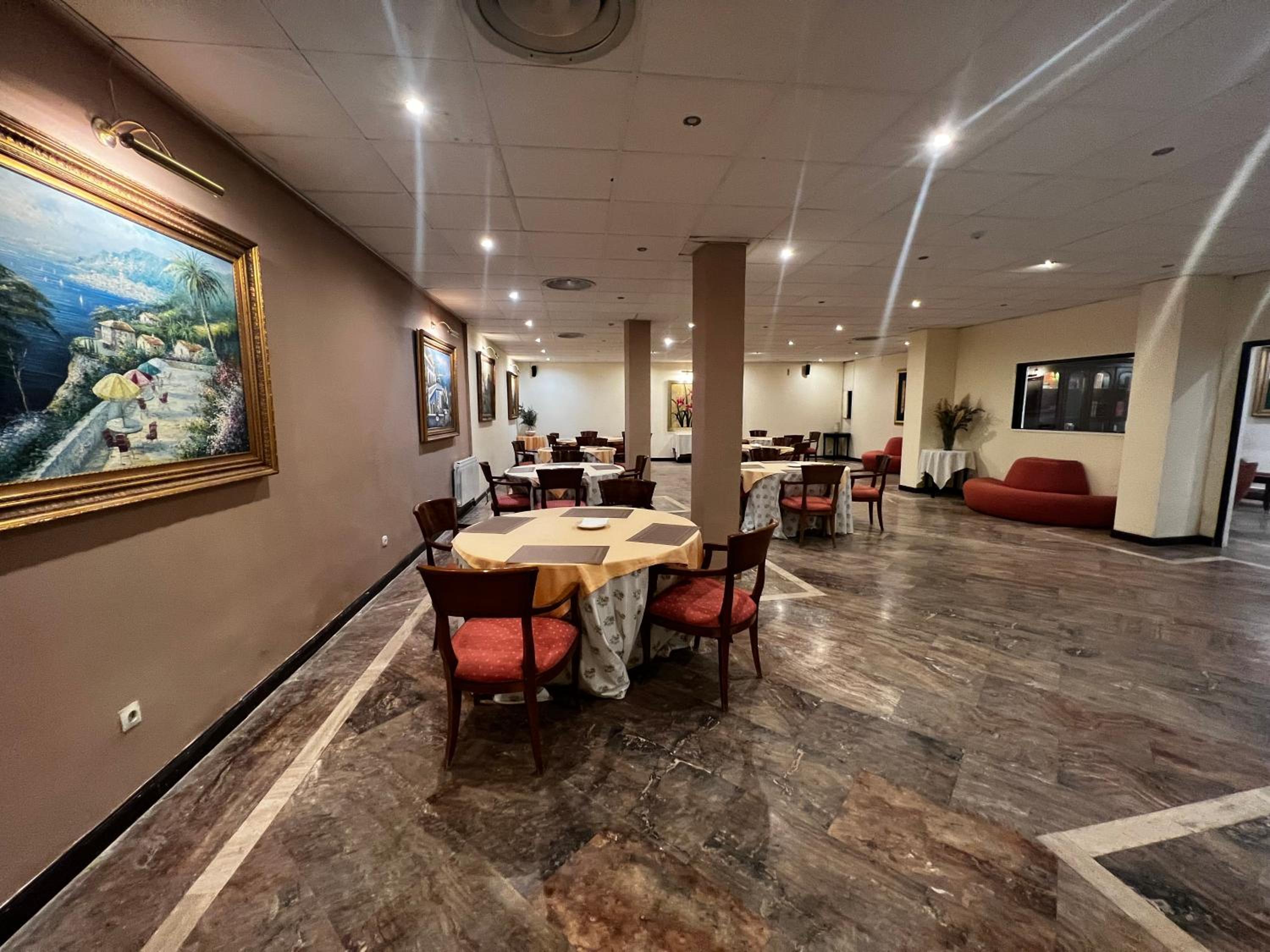 El local de la cafetería se nota que tuvo tiempos mejores, radiadores con los cables tirados por encima y rotos, bolsas de basura en una esquina del comedor