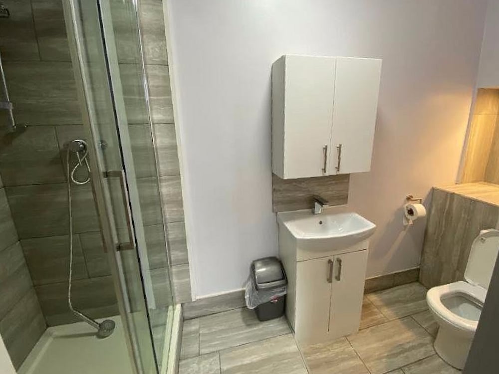 Really basic room. The shower is in the corner of the room and it's shared toilet. No wardrobe. Just a few kitchen cupboards.