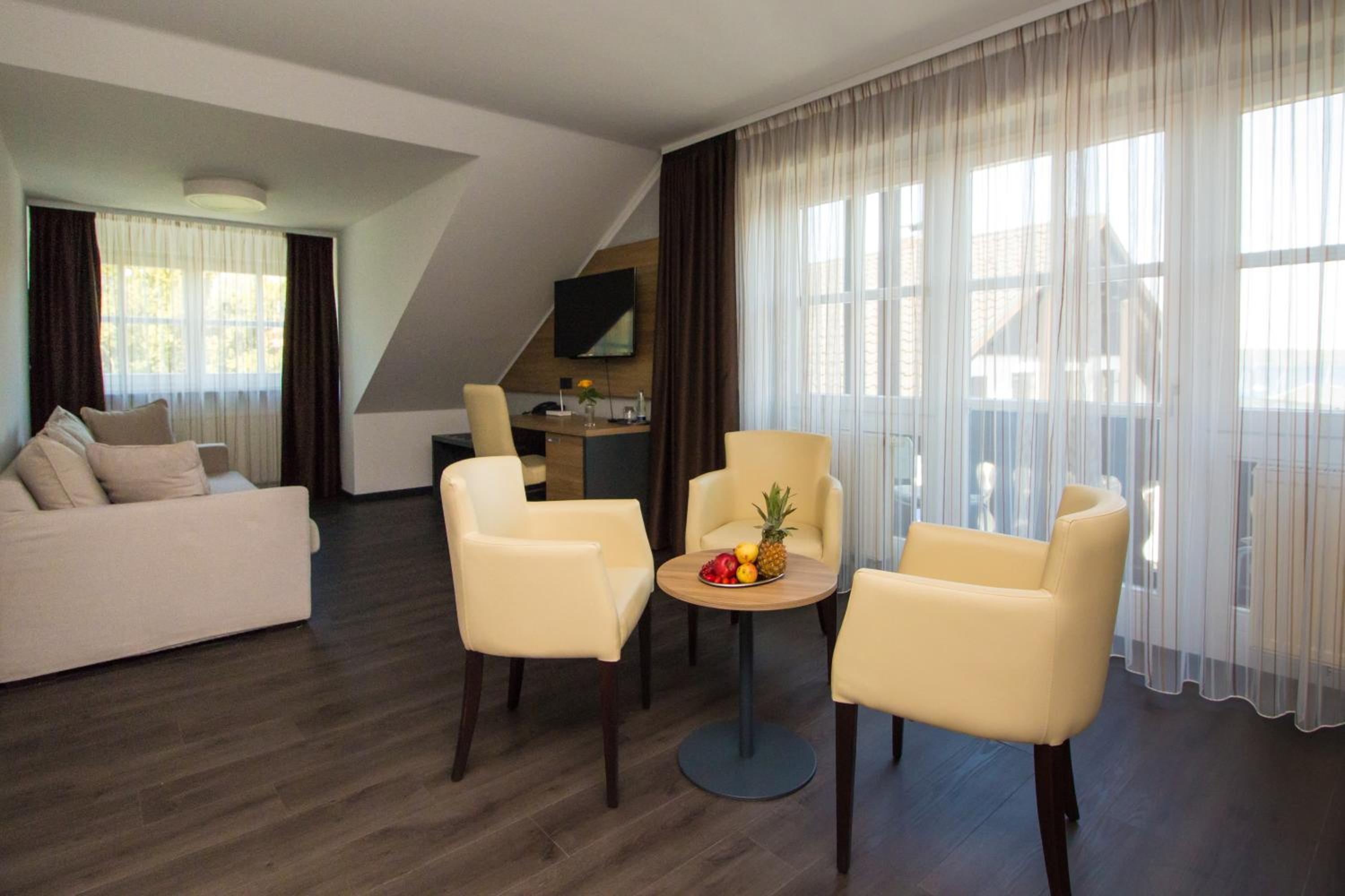 Each room at Hotel am See features a flat-screen TV, cozy seating area, wooden floors, and a private bathroom, ensuring a comfortable and charming stay.