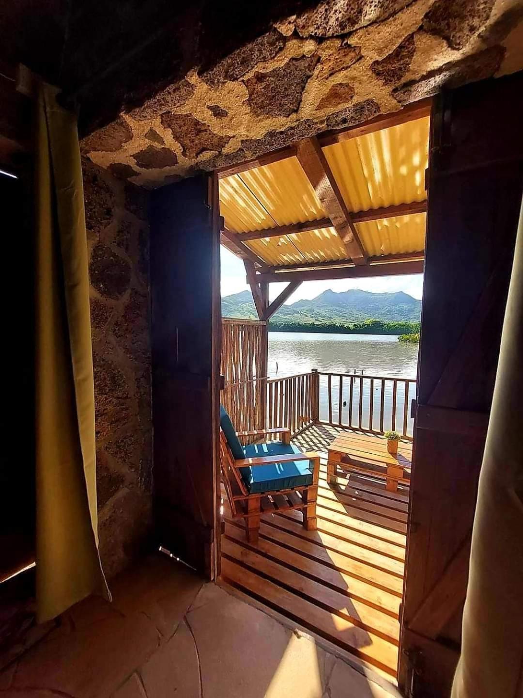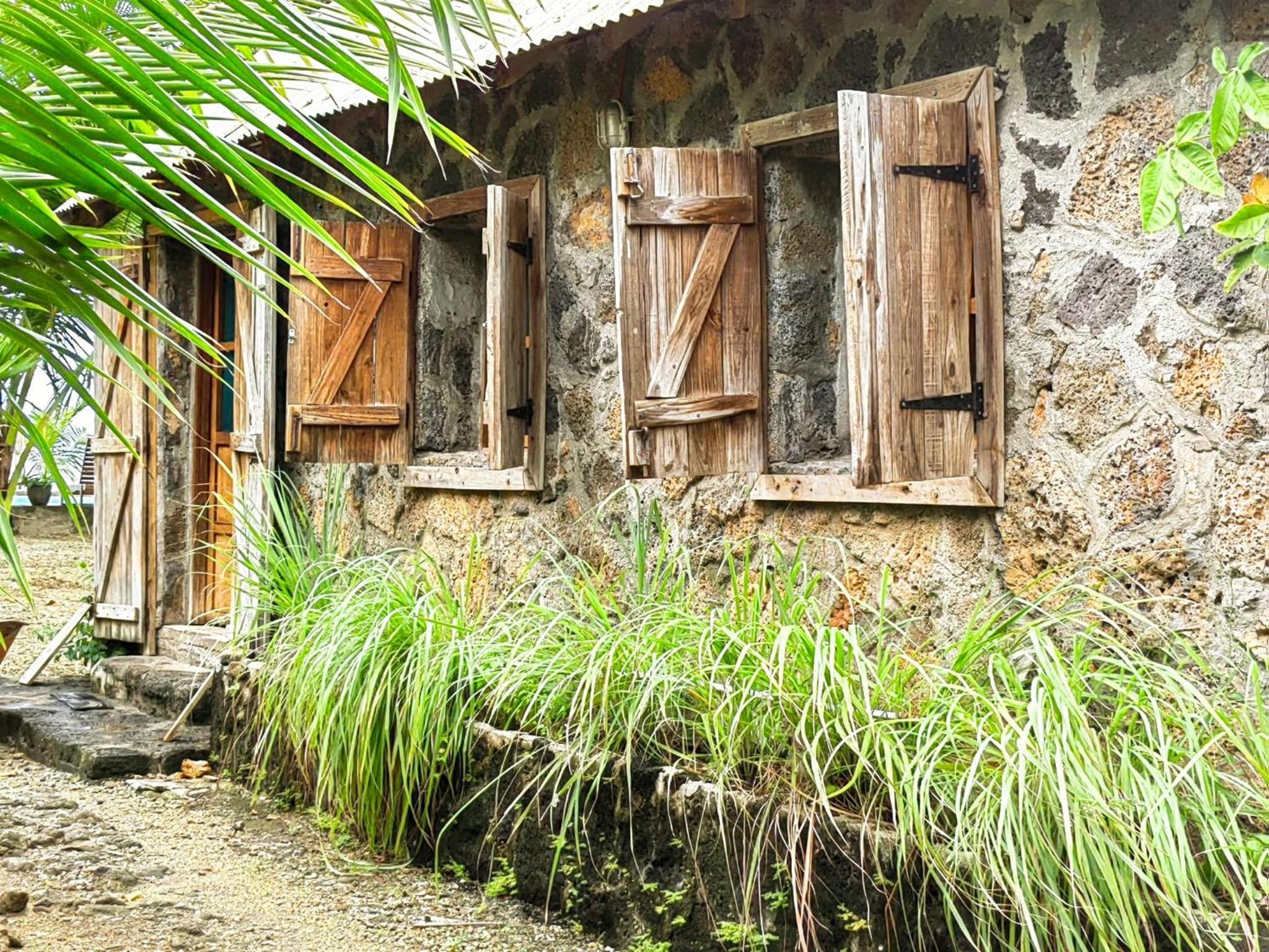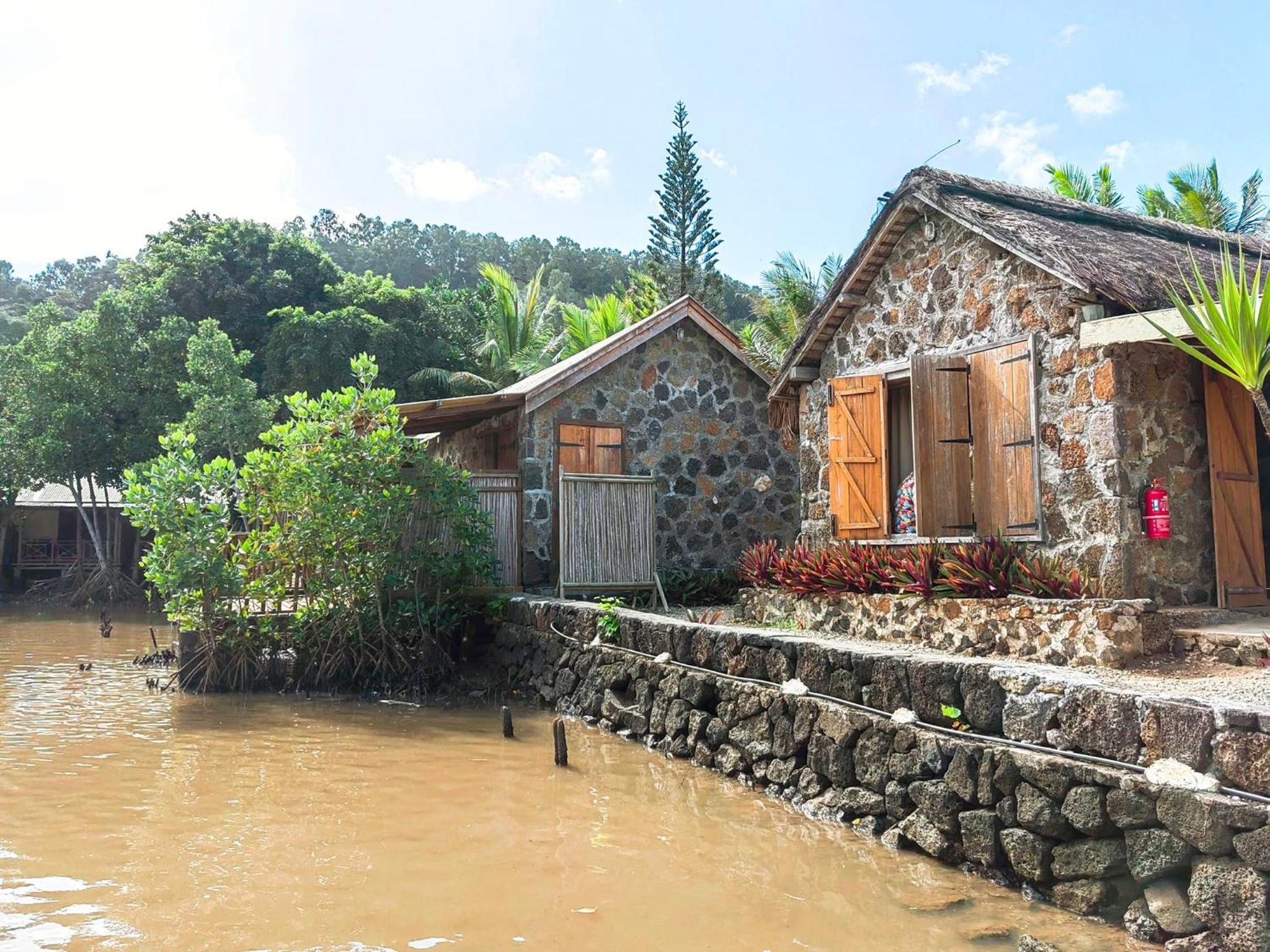 Ambiance surprenante : bois brut, volets rustiques, les pieds dans la mangrove.