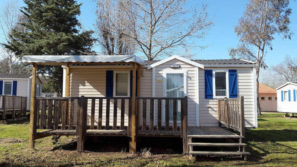 Hébergement peu ombragé, comme la plupart des mobiles home. La terrasse n'est pas couverte (très chaud à midi), avec un tout petit parasol.