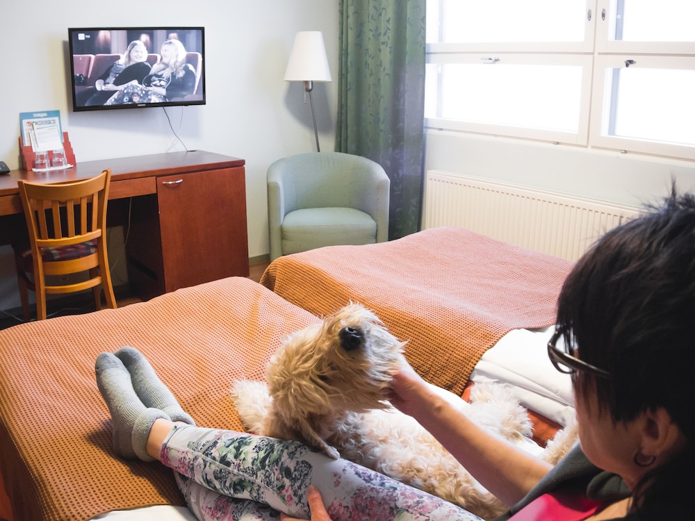 The hotel room is old and the room was smaller than we expected. We had 2 single bed room. there is also a crack on the floor. The beds are smaller as well and since it is an old hotel the bed is a bit run down. There were small hairs on the bed sheet. We appreciated that they place baby cot and potty for our child . The bathroom is clean it has soap dispenser but there is no shampoo and conditioner available unlike other hotels so better bring your own. The only plus is that they have warmer stand that dries your bathing suit and towel 👍. We added pool access but there is additional fee bathrobes and slippers unlike other hotel so heads up next time. We paid 4€ for slippers bec. bathrobes are 7€ each. The swimming pool is a bit cold. the only warm pool is the kiddie pool. The shower room can only accommodate 8persons so its nice that it’s not crowded when we got there. you need to pay 0.50€ for locker. The food is super basic Finnish breakfast it is not appetizing. There is not much choices to choose from. It would be better if there were choices with some additional fruits and yogurts as well. The oatmeal is ok. there is more meatballs than the small sausages and the meatball doesn’t taste good👎. So my child wasn’t able to eat that much. The only perk for this hotel is having moomin ice cave below it and you get discount since your their guest. Overall considering the price we paid for a night, it is below the standard & can do better services in the future.