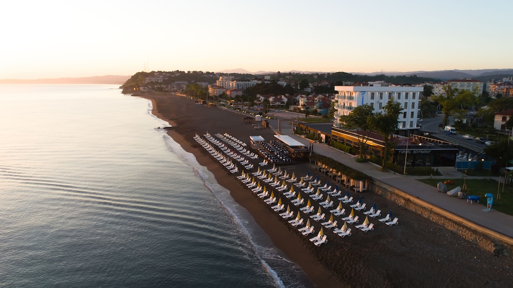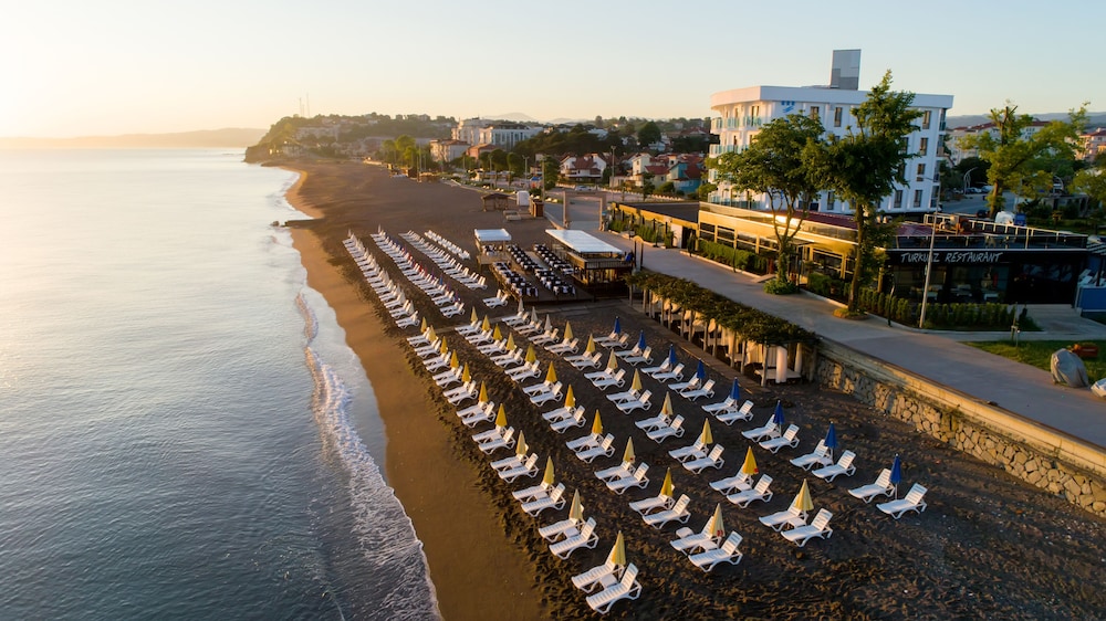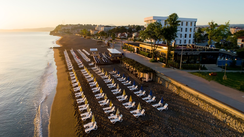 Beachfront Relaxation: Enjoy a private beach, outdoor pool, and complimentary beach shuttle at Turkuaz Beach Hotel.