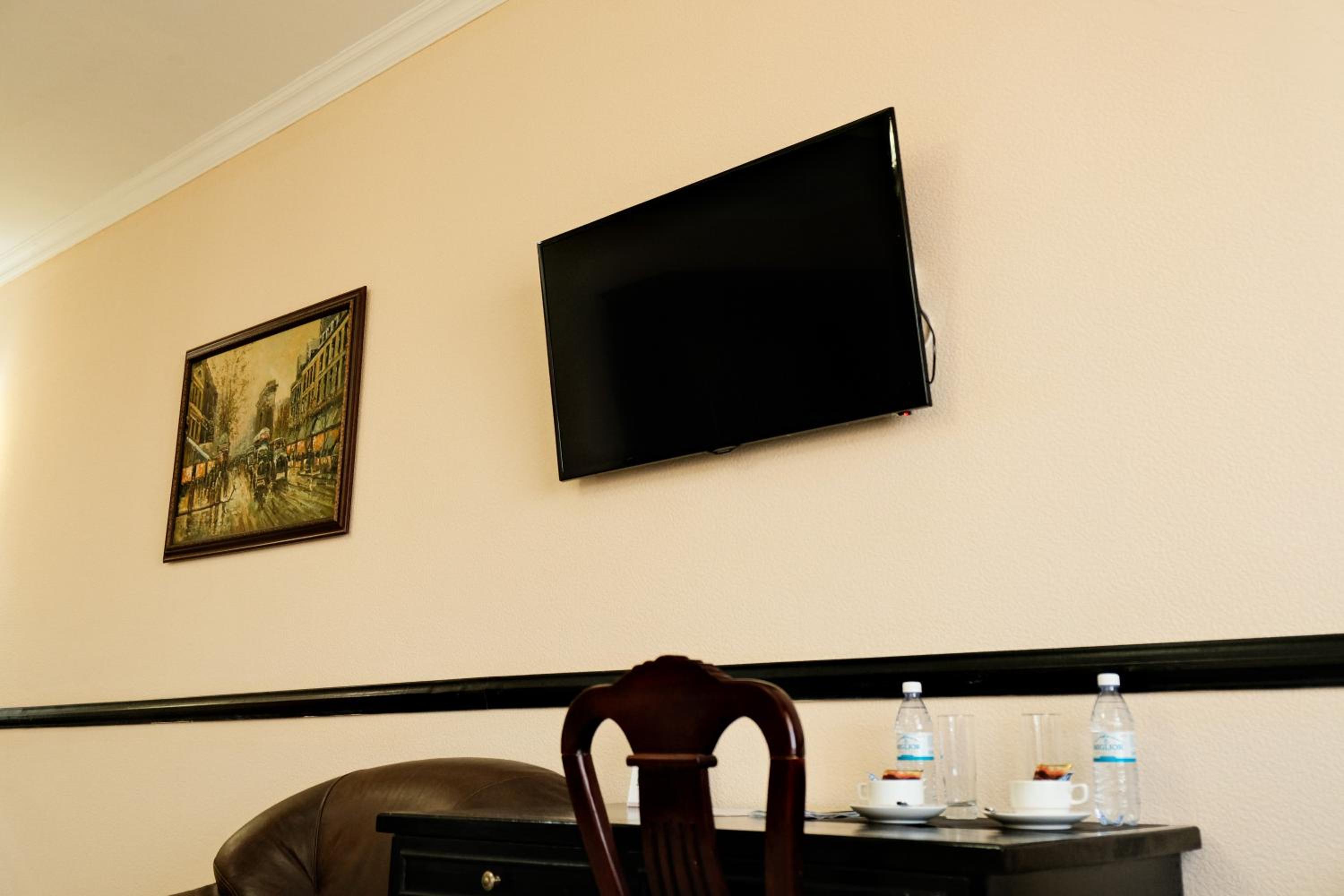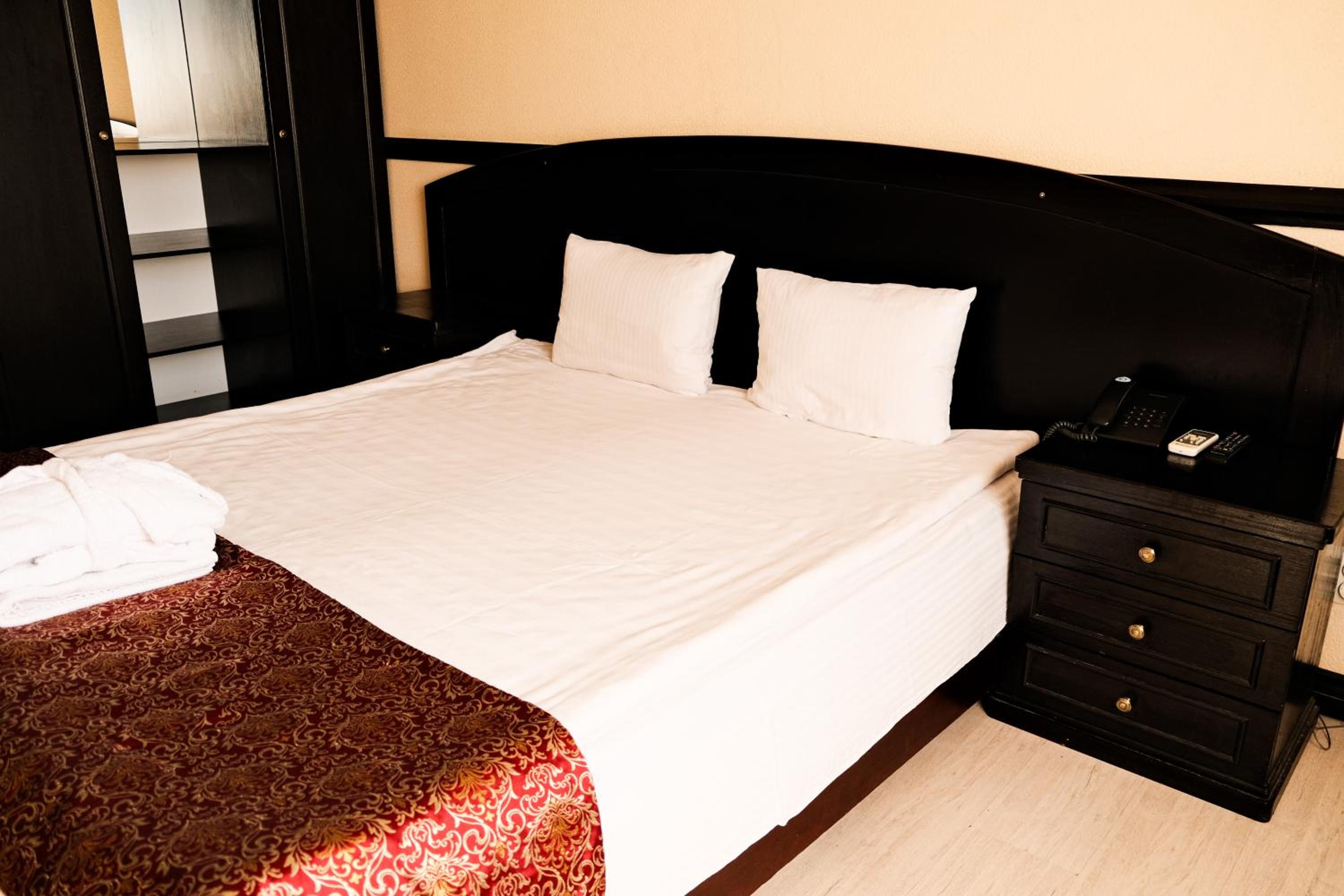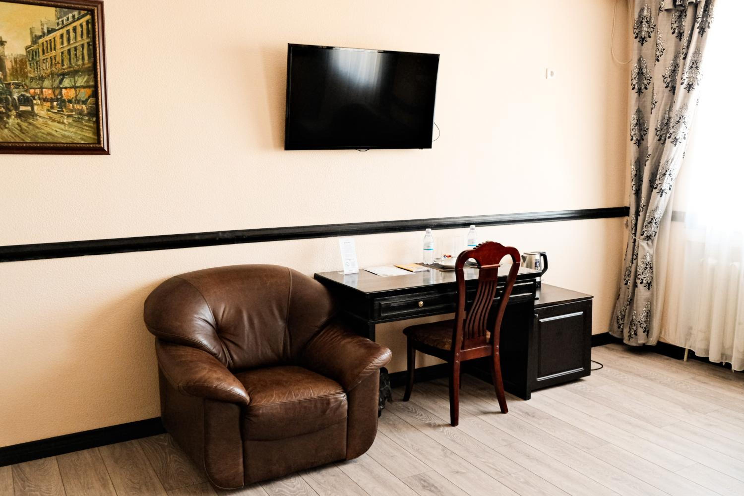 Step into our bright rooms with warm-colored interiors, each equipped with a TV and a fridge for your convenience and comfort during your stay.
