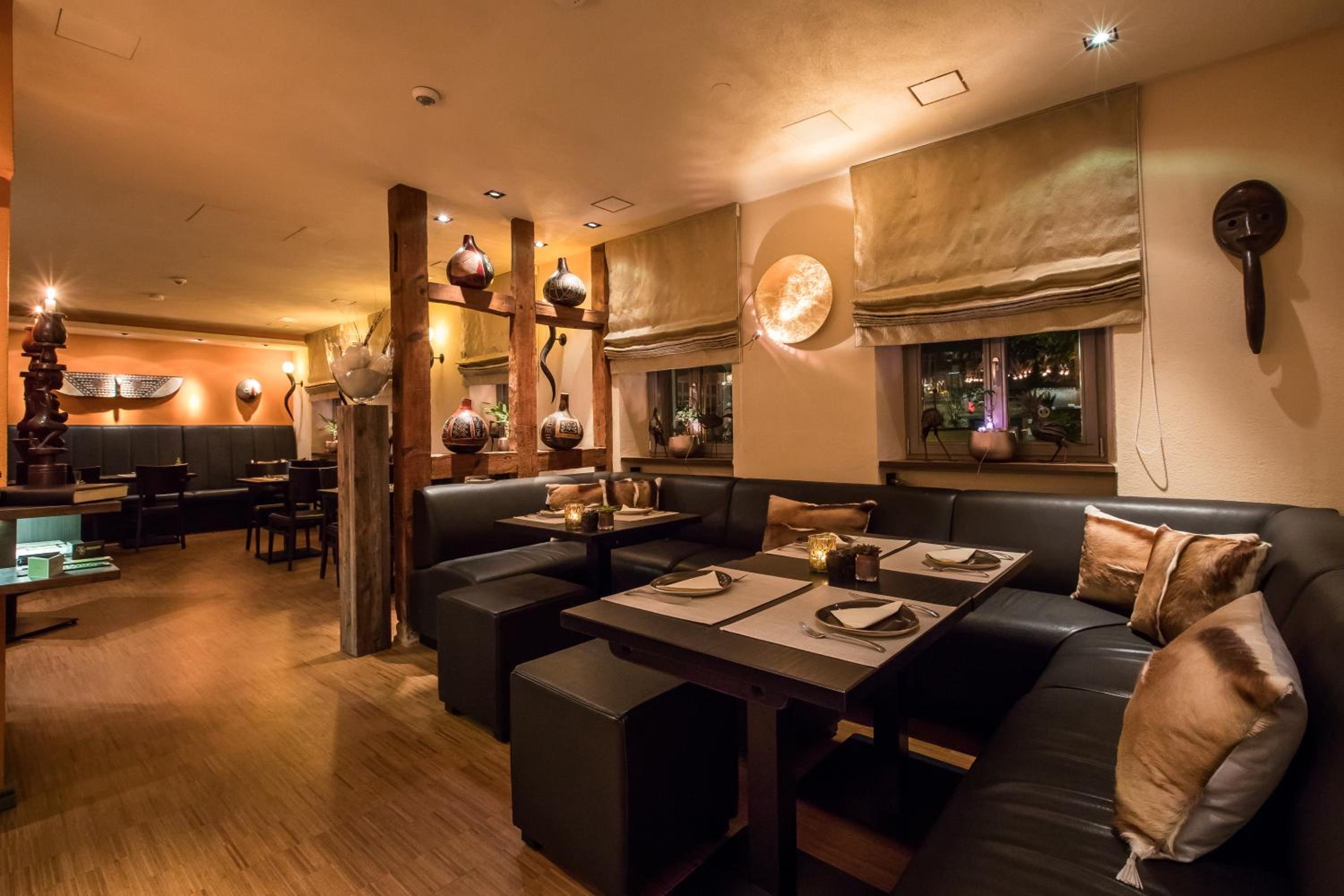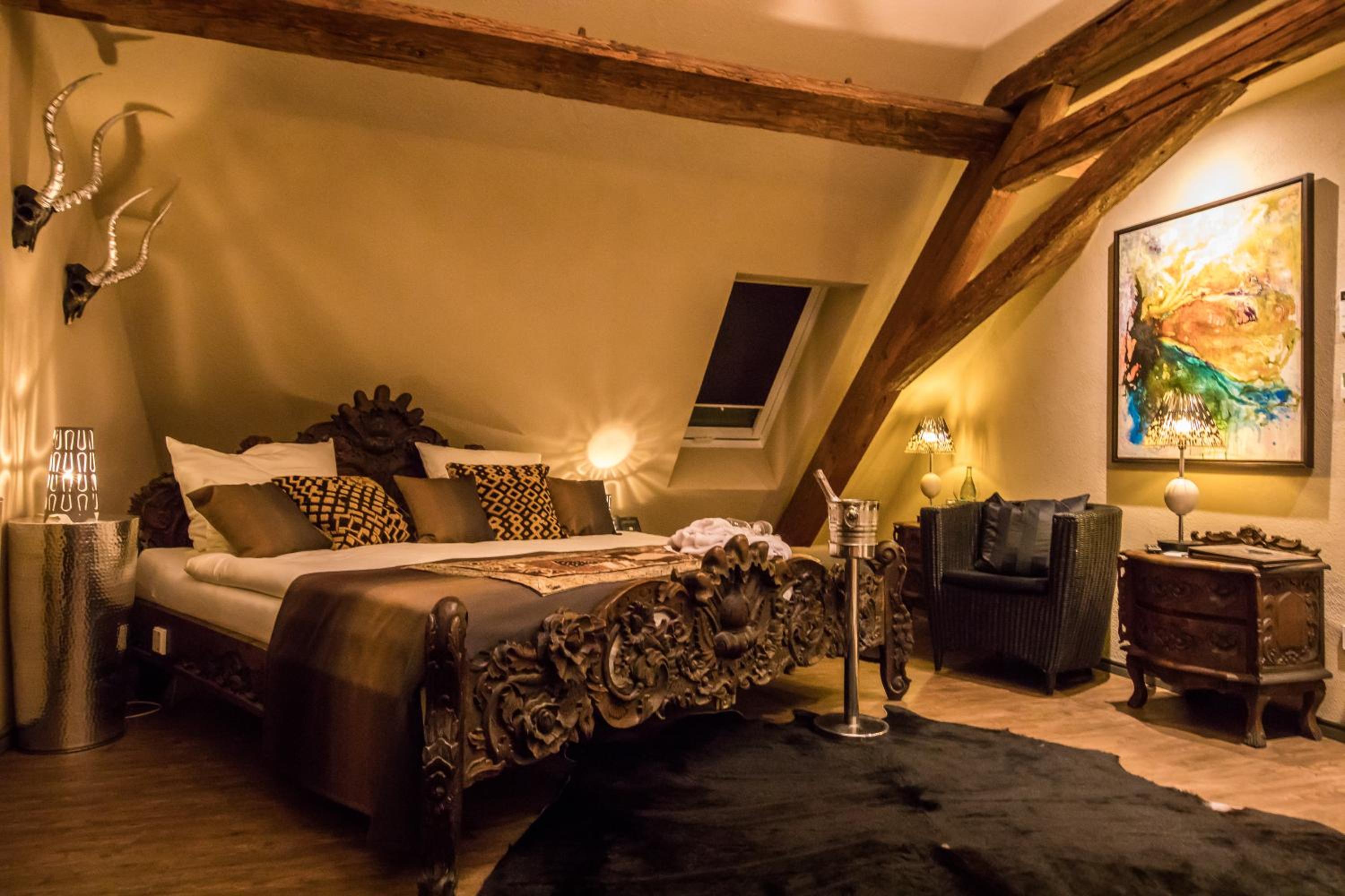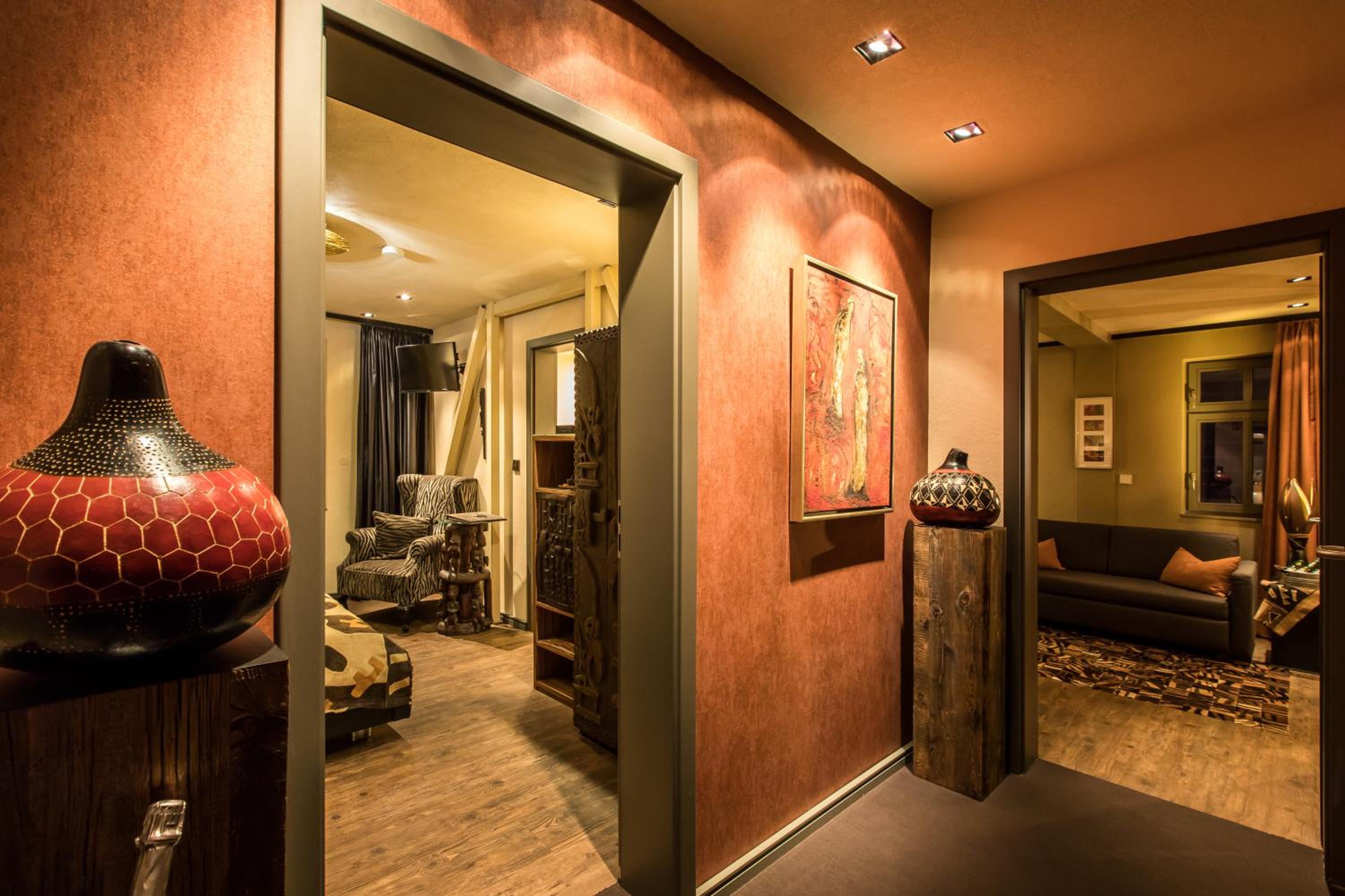 Experience the unique charm of Farmerhaus-Lodge with its captivating African-themed decor that immerses you in a world of exotic elegance.