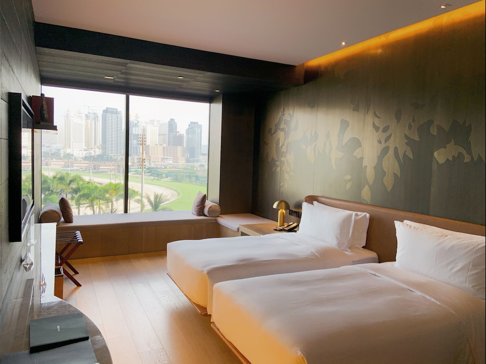 Stayed one night. Wouldn't mind the location away from the main strip but next to Taipei's residential area. My room has a very good view toward Hengqin China. I do not like the layout of the reception and lobby. Need to walk a U turn to access the guest room elevators, passing through 3 to 4 retails, and seems no security. The interior design of the hotel is too much in motifs and patterns. Very dark design. The guest room is far from enough lights level and walls are in black color. Bathroom walls are in black marbles with relief patterns that looks like some kinds of ritual motifs. Bed side table/tops, work tops are too narrow that you can't put anything after the house phone, hotel's promotional leaflets, etc. Anyhow, bed, air conditioning, shower are good. Funny thing is, the hotel would hold your check-in room deposit for a month after checking out if you pay by credit card.