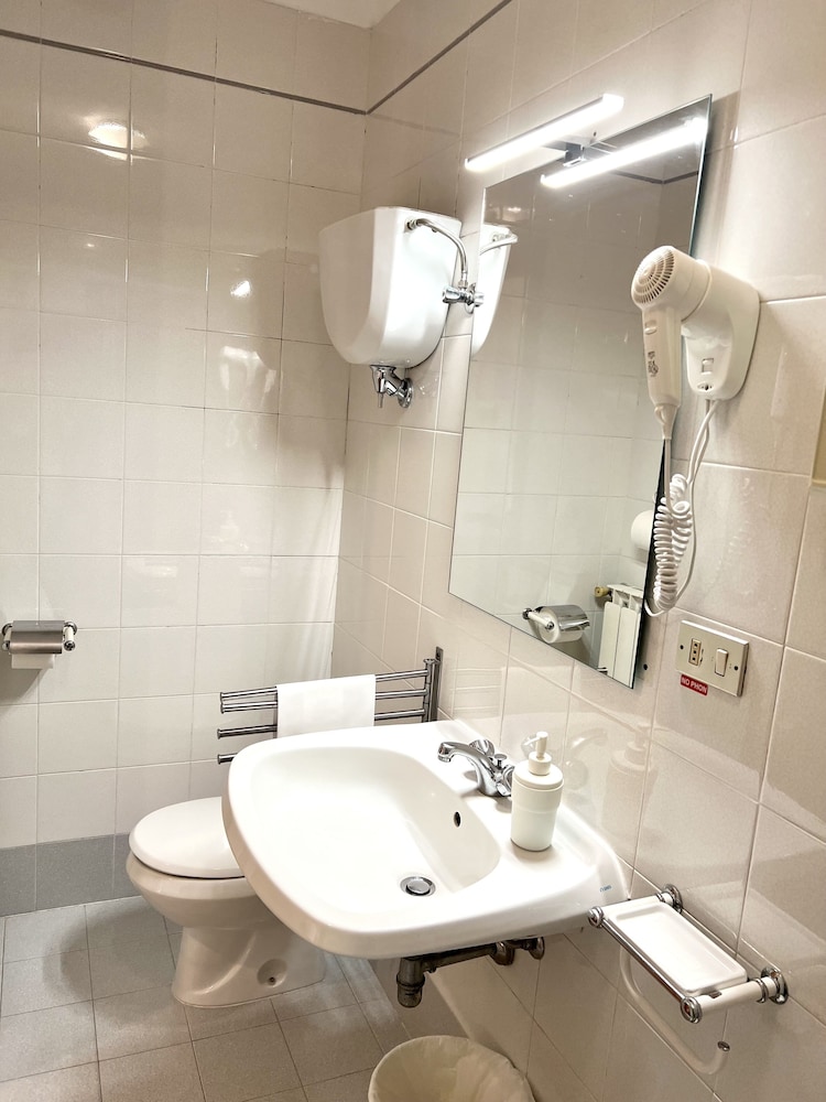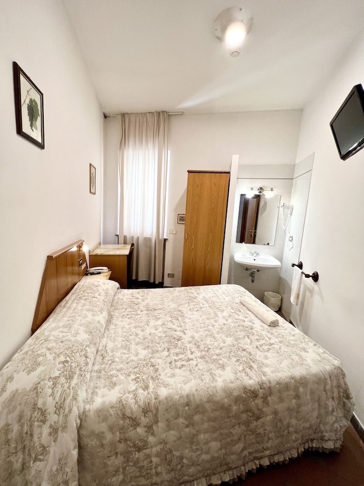 Inexpensive small hotel in great location for visiting the main sights. Tiny bathroom but serviceable. Main issue was noise at night. Room faced the street and (drunk?) shouting groups passed by until 2 or 3am then delivery trucks began at 7am. Windows closed did not block the sound. Would start again but not on the street side.