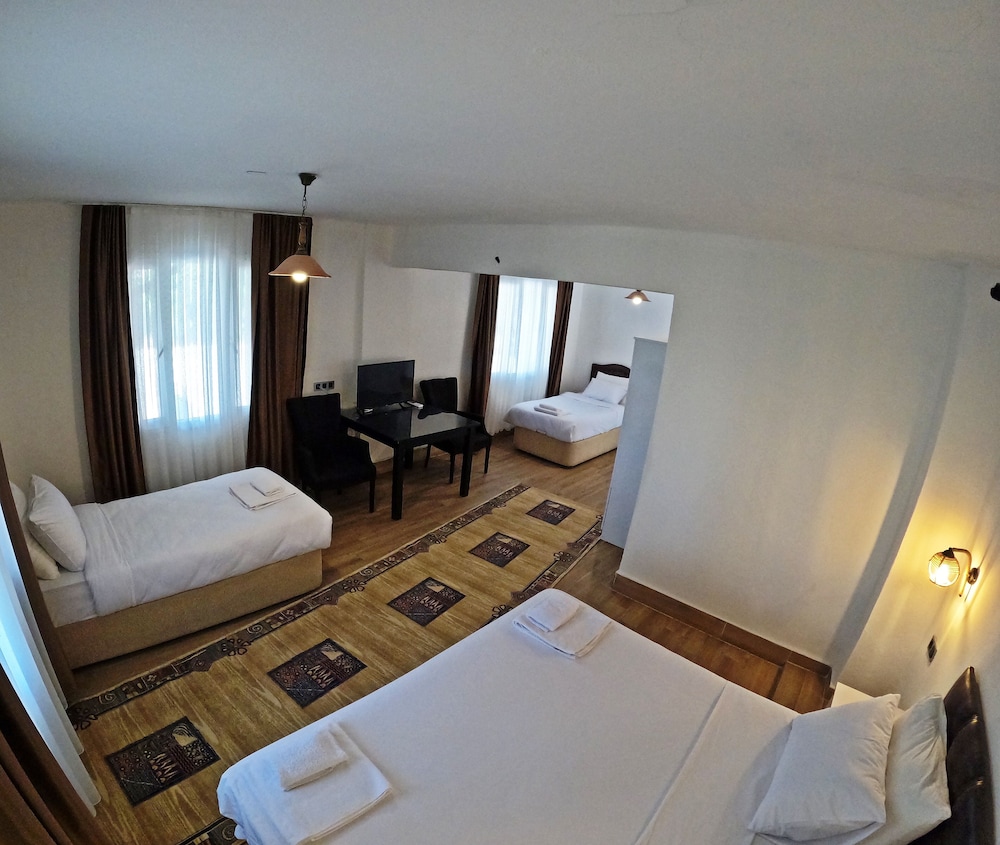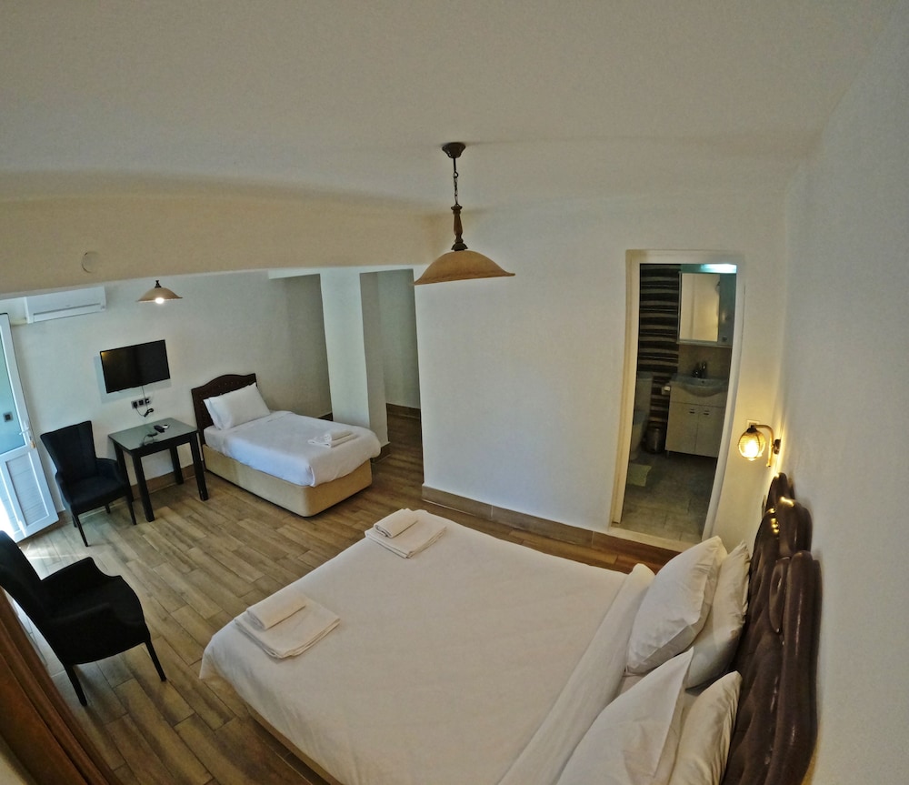 Otel güzel ama sahibi olduğunu düşündüğüm yaşlı adamı sevmedim. Size, sanki yazlığına misafir gelmişsiniz gibi davranıyor. Biz paramızla kalıyoruz ama sürekli bir tuhaf bakışı var sanki bir şeyleri yanlış yapıyormuşsunuz gibi hissettirmeye çalışıyor.Odada buzdolabı yok küçük su koymuşlar ve günde bir kere yeniliyorlarmış dolap da alıp kullanabileceğiniz bir su veya sebil yok. Kendileri sattıkları için su koymuyorlarmış bir de diyor ki her otel de böyle sanki ilk kez otele geldik bir şey bilmiyoruz bizim de butik otelimiz var😂Suya da 70 tl diyor gidip dışardan alınmasını istemiyor dışardan bir şey sipariş etmesi yasakmış ama alınca bir şey yapamıyor tabi. Birde çıkışımız 11’deydi tam çıkacakken kadın 10.50 de falan kapıyı çaldı çıkış 11 de diye??? Saat 11 den önce kapısını çalamazsınız insanların bir gün önceden ya da girişte uyarırsın terbiyesizlik keşke kirli bıraksaydım da temizlemekle uğraşsaydı kadın çok uğraşmasın diye odayı baya temiz bırakmıştım bundan pişmanım ama belki sahibi söyletmiştir diye bir şey demedim. Sanırım yabancı turist seviyor sahibi olan yaşlı adam. Hayatım da babaannemden daha suratsız biriyle karşılaşacağımı hiç düşünmezdim😂 Gelelim güzel yerlerine havuzu temiz ve güzeldi diğer çalışanlar çok iyiydi o odaları temizleyen kadın hariç. Muhasebe işlerine bakan abi de çok iyi bir insandı. Oda temizliği iyi sayılırdı %70. Tek kişilik yatak çok küçüktü düşcem sandım kaç kere.Bu arada merkeze de yürüyerek uzak taksi ya da dolmuş lazım ama halledilir.