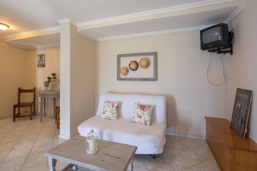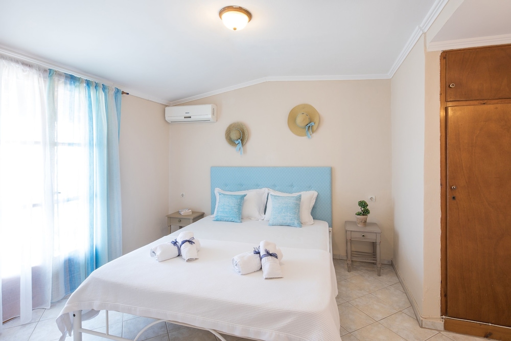 The apartments are situated on the hills of the beautiful East cost. The view is stunning and although you need to go up many steps it's worth the stay. The owners have also an hotel near by where you can use pool, bar and sun beding for free. The free WiFi it's fast and stable. The Maid was very professional making up our room everyday. There is airconditioning but in June was fine without. The rooms are facing east so are fresh in the afternoon and night. The location is perfect if you rent a Car or motorbike. I wouldn't really walk around because there is no pavement , apart from going to the little pebble beach which is only 50mt. Best beaches are on the he west all with nice sand. Corfù town and airport it's only 30 minutes away.