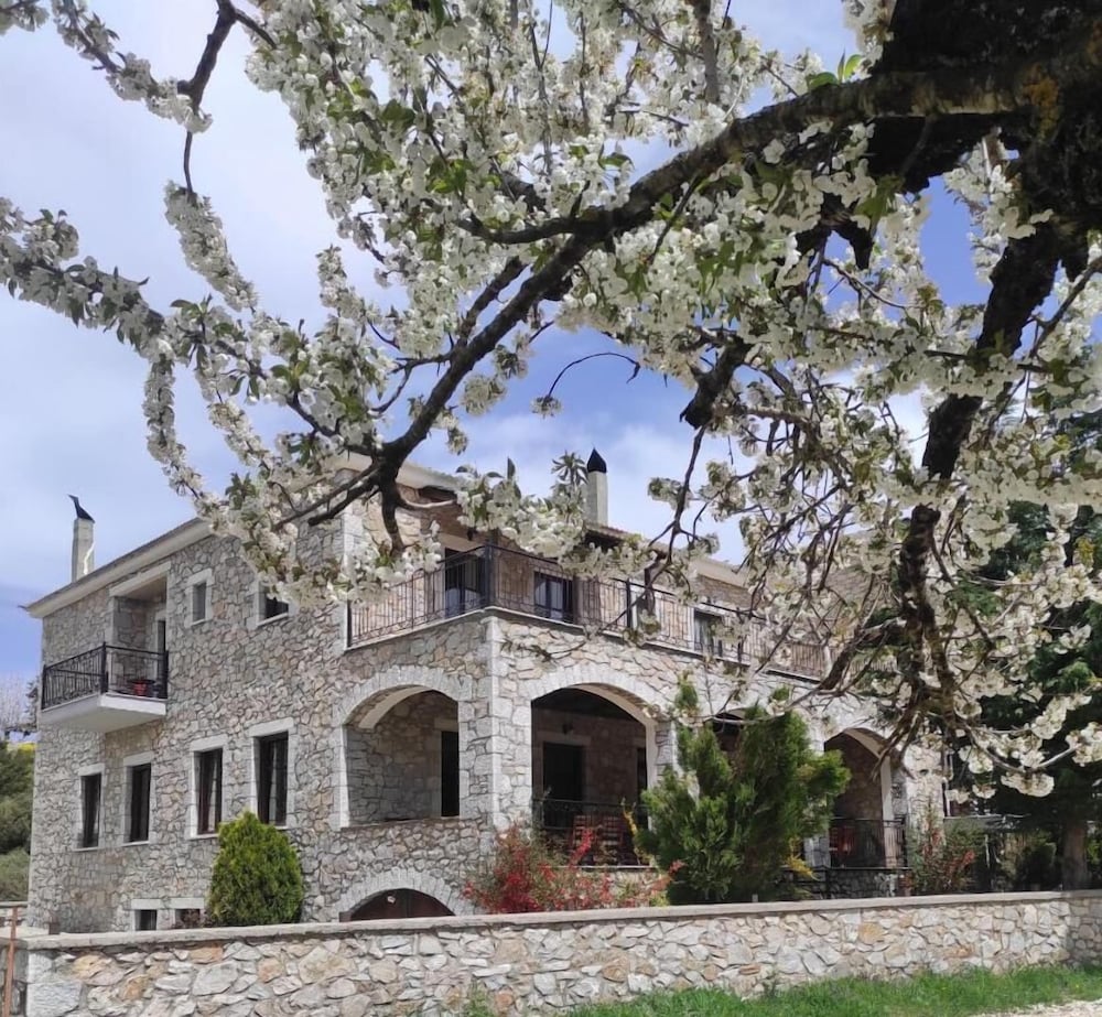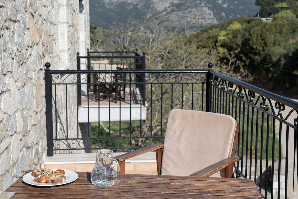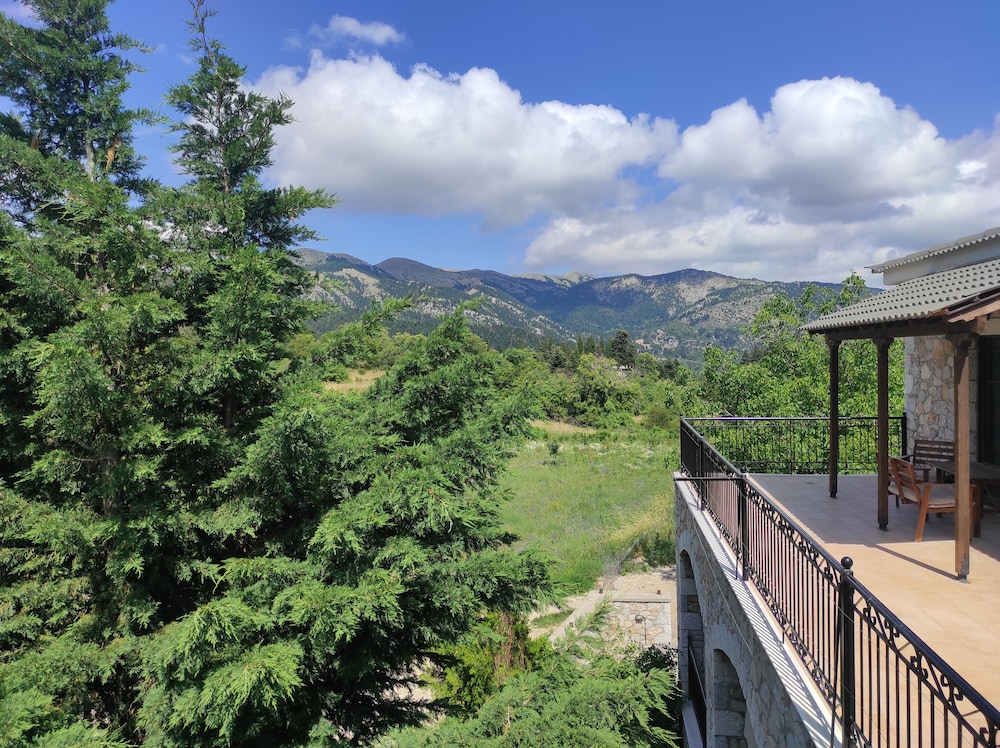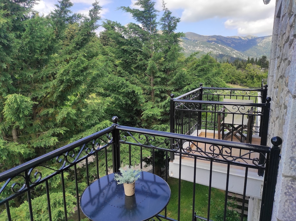 If you love crisp mountain air each morning and stunning views, this is a great choice. We knew the rest of the country was hot, but it wasn't up here. The guesthouse is a two-minute walk down the road to the charming town of Kosmas where you can find good food and more beautiful views. From the guesthouse, there are multiple walking trails which the owner will happily tell you about. We were here early in the season, so only one other group was here but we never heard them. Our room was large and comfortable. We were given a choice of the room I had booked or the larger room at the same cost, so we took the larger room which had two balconies, although only one chair on each balcony, but you can move the chair, a fire place, an extra bed made to look like a couch, and good lighting. We weren't sure if there was air conditioning but that is not an issue in the mountains. Our hosts were very friendly, and the woman greeted us each morning for a made-to-order breakfast. One morning we had yogurt and honey, which is probably from the one of the many hives in the area, and another we had omelets. Assorted breads and unlimited coffee accompanied the meal. The dining room and the main room are charming, and we could see ourselves sinking into the leather sofas watching a roaring fire in winter. At night, we slept beautifully as the bed was comfortable and wooden shutters pulled tight over soundproof windows. Such a delight! We learned that the couple running the guesthouse took over in October of 2021 and are busily repairing the place, so don't be put off by the weeds in the parking area. Instead, sit on one of the terraces outside and enjoy the view and your luck in finding such a place. This is a wonderful place to stay.