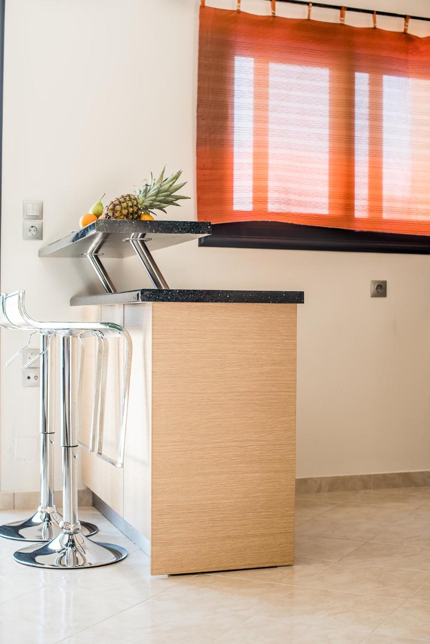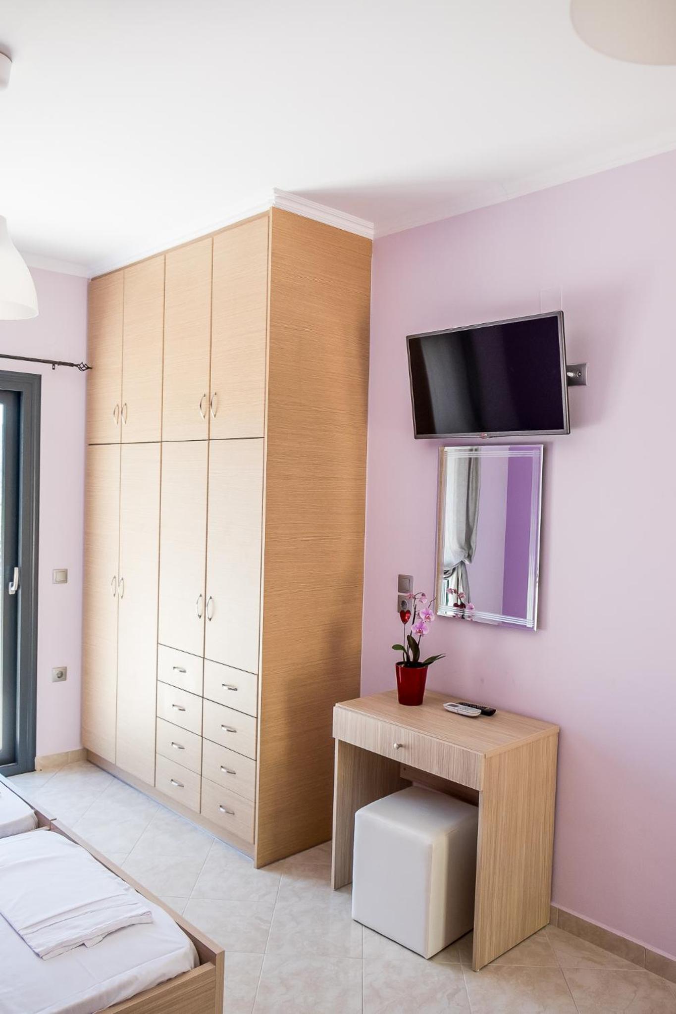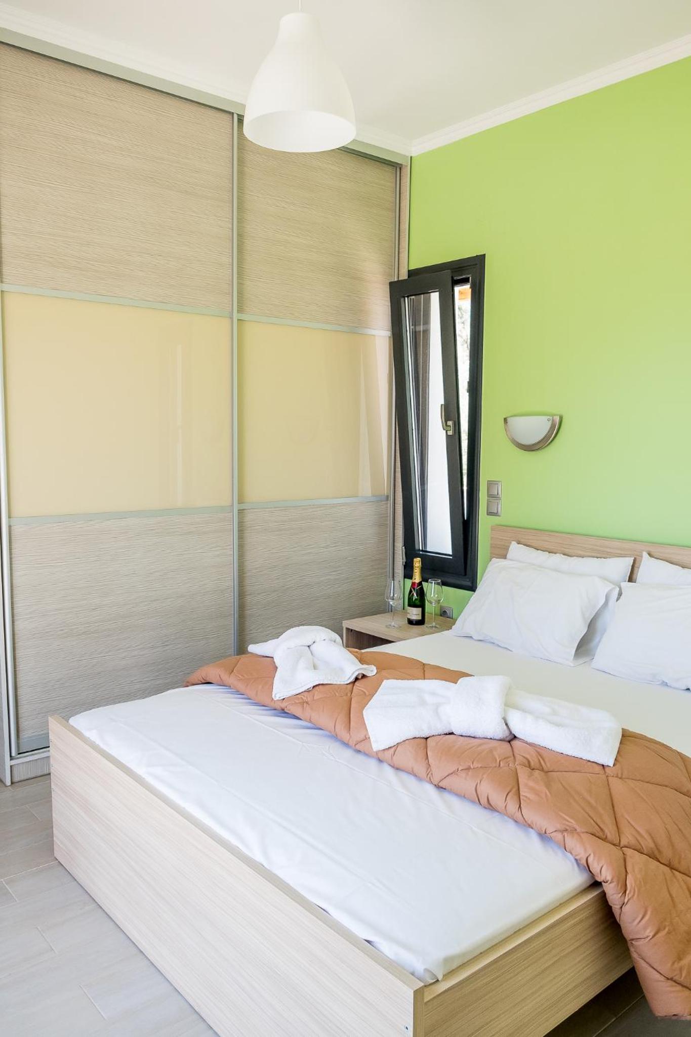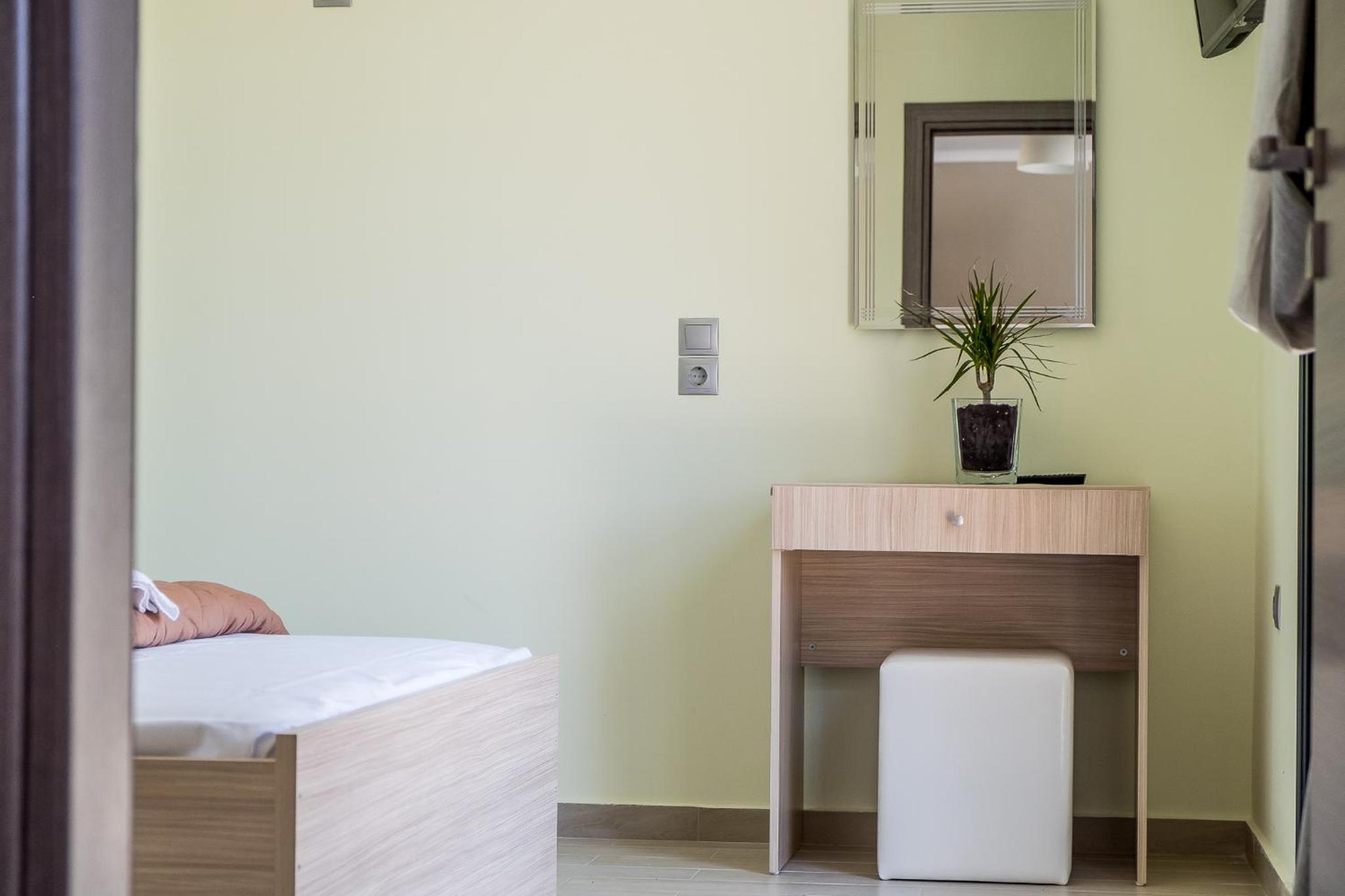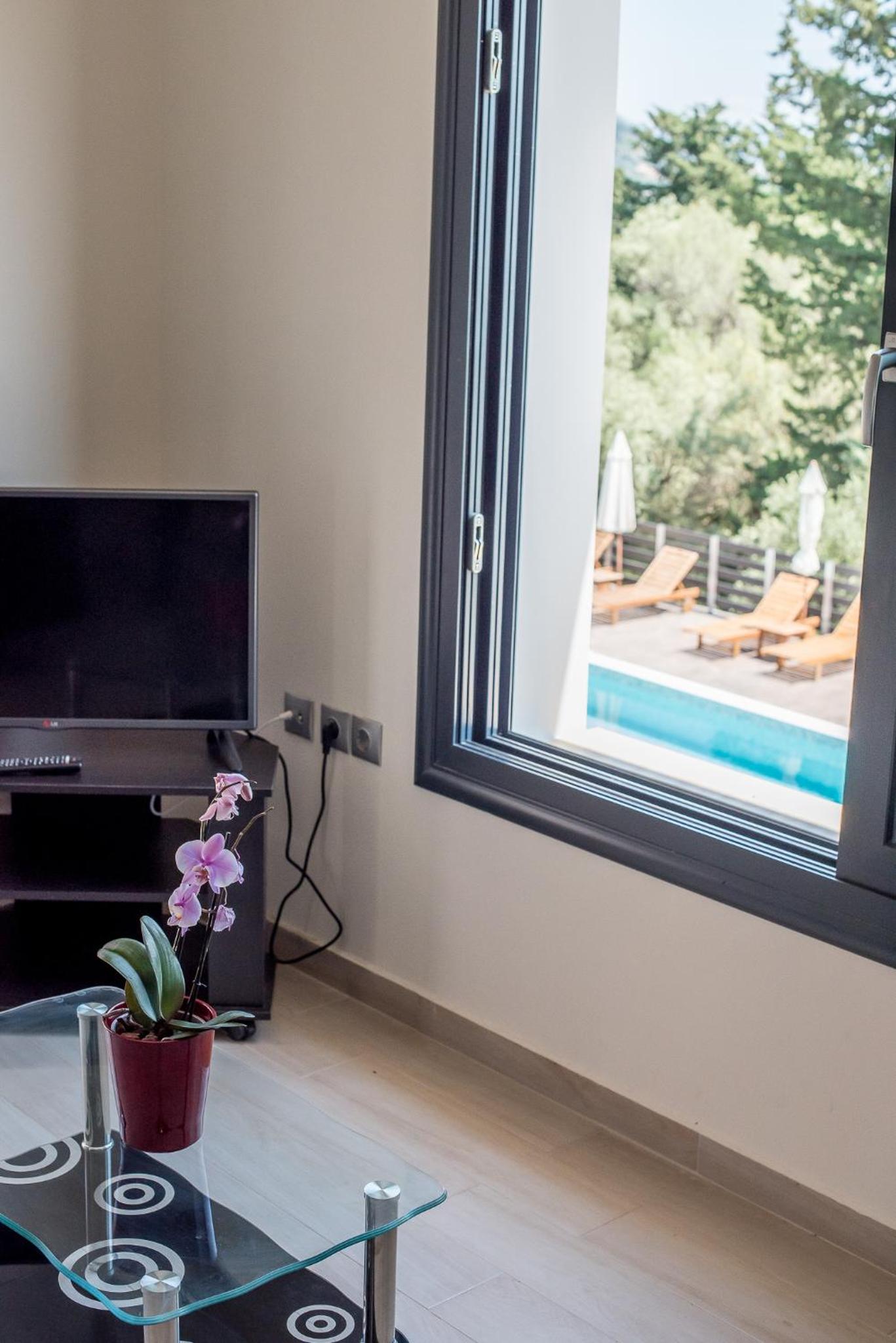 Гарне розташування, недалеко від міста Нідри, красивий краєвид, є басейн, парковка в оливковому саду. Ми жили в номері для трьох осіб на першому поверсі з 2 окремими ліжками та диваном, достатньо розеток, гарне освітлення, є тераса зі столиками, хоча вона спільна для трьох номерів. Є мінікухня з плитою, чайником, холодильником та грилем для сендвічей. Ціна за номер була приємна.
