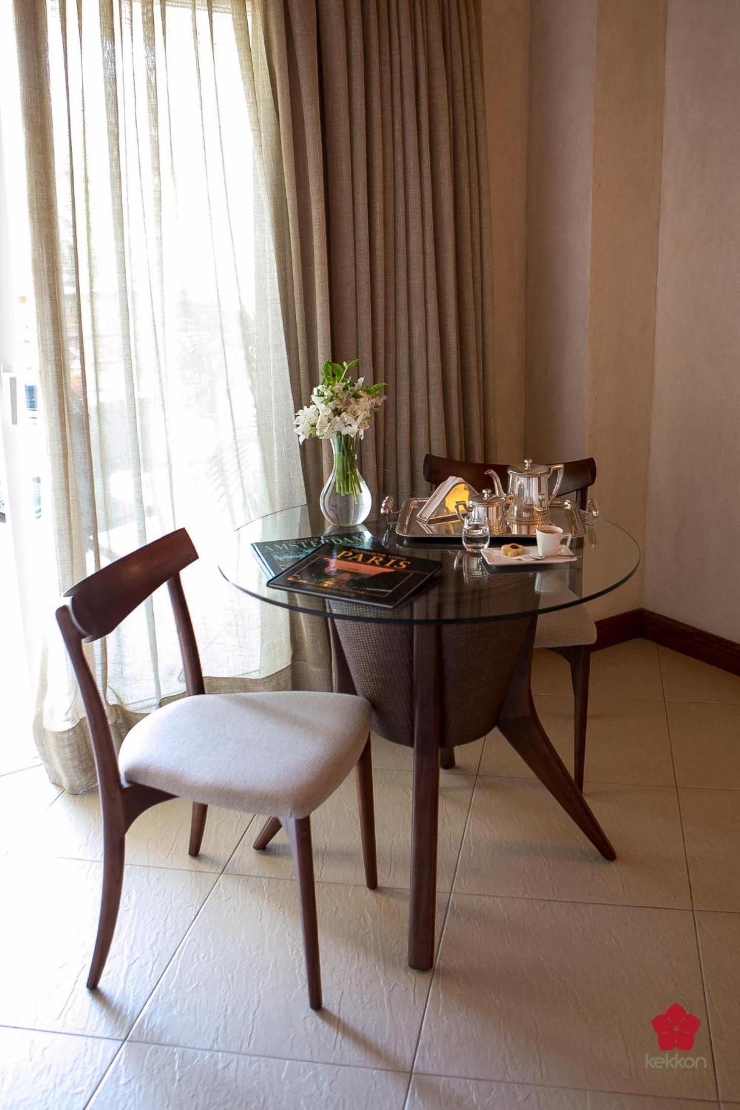Varanda com mesa e cadeiras com vista para o mar