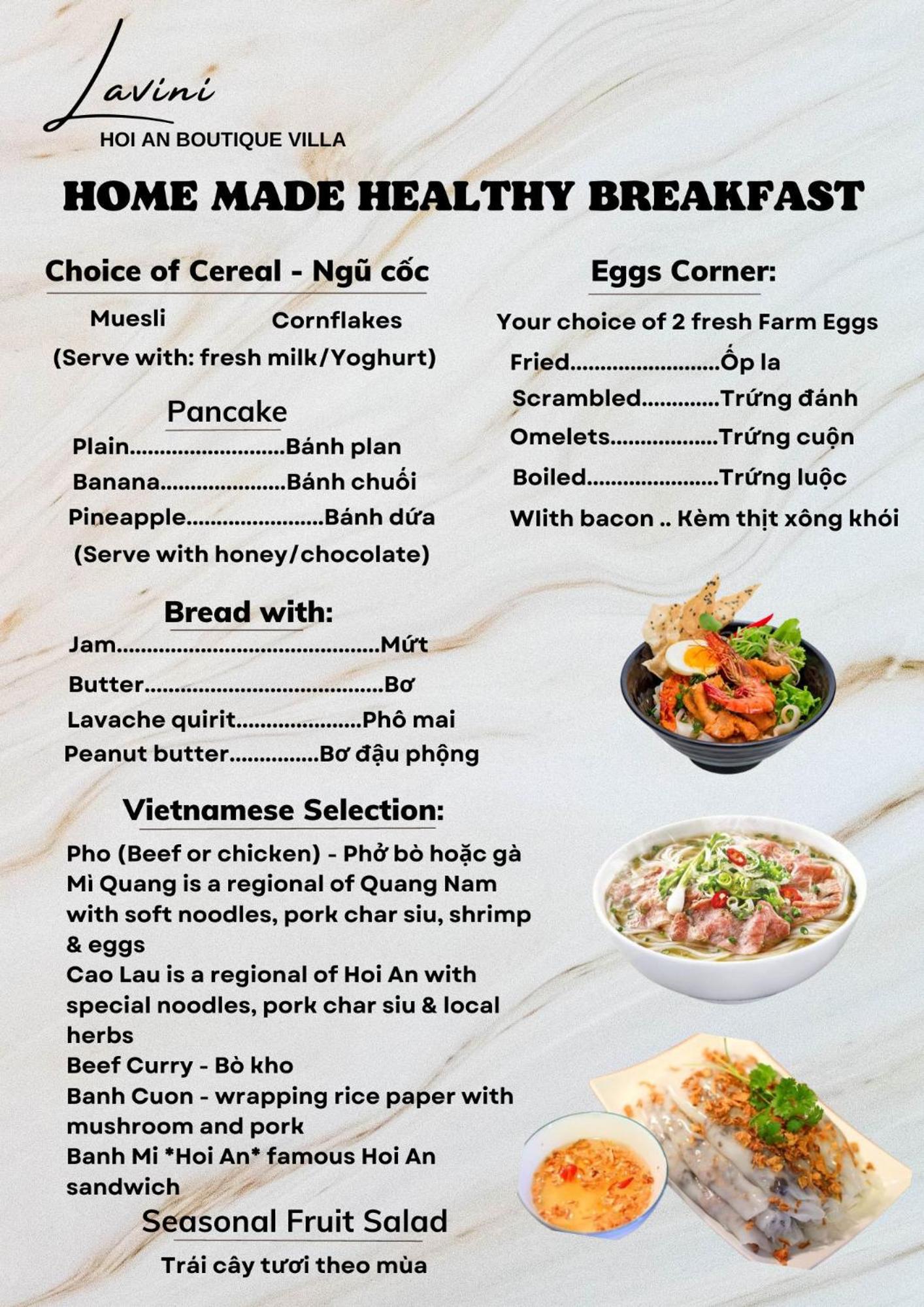 Breakfast was different every morning and very tasty. Food is great, hotel is fantastic and the people, at Lavini Hoian are truly amazing.