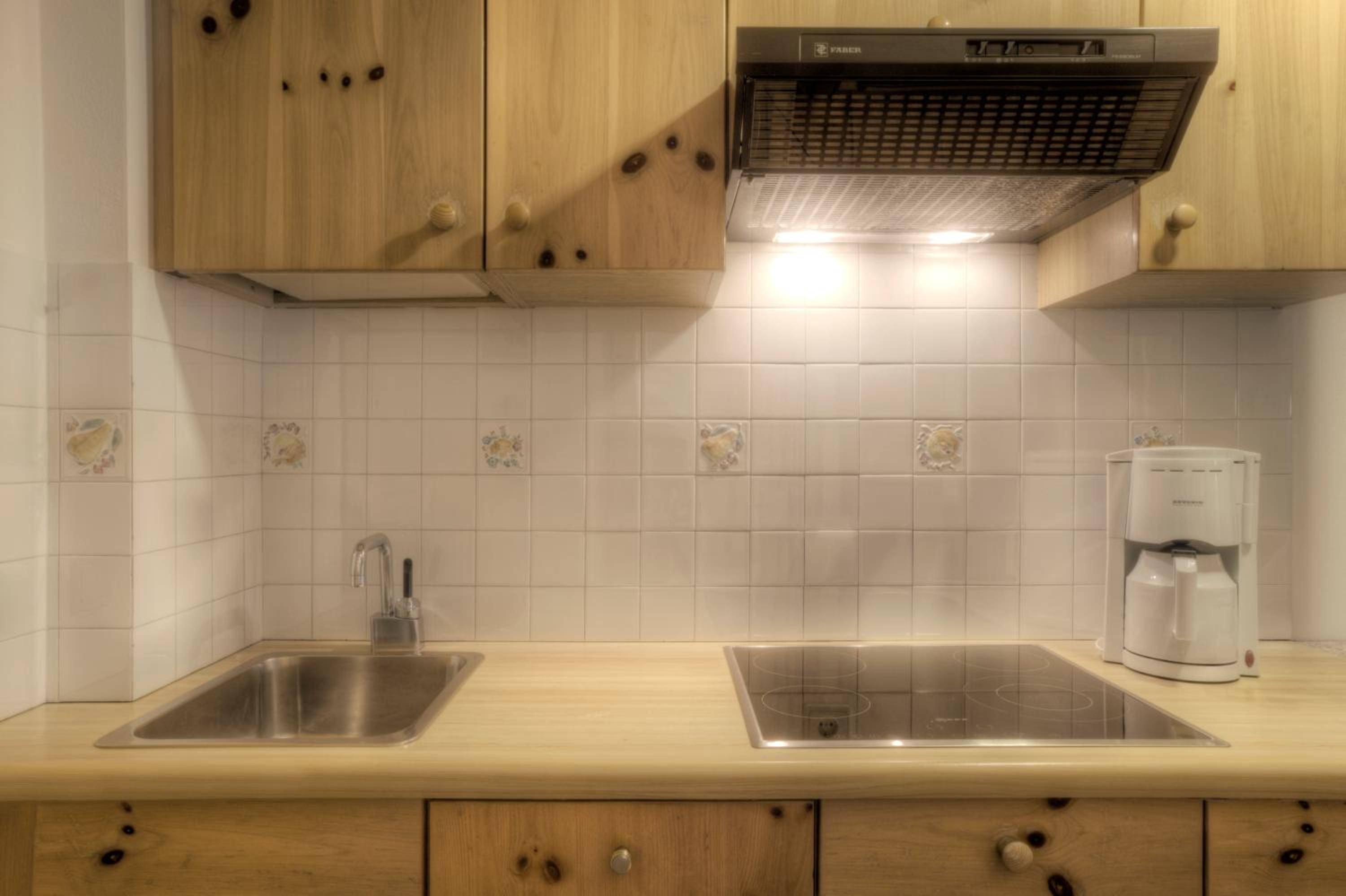 The kitchen was very dark. There was no frying pan or dish scrubbing brush