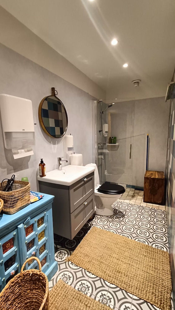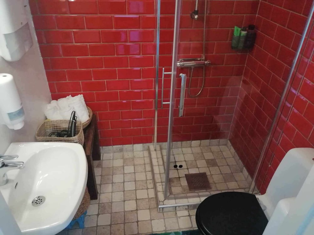 Delat badrum, fanns inte eget när vi bokade men det funkade ok.