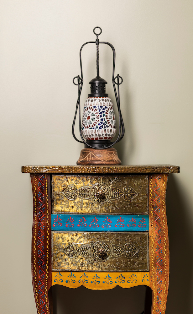 Spegeln på rummet stod på en låg bänk, det saknades stol så fick springa in på gemensam tia för att sminka sig.