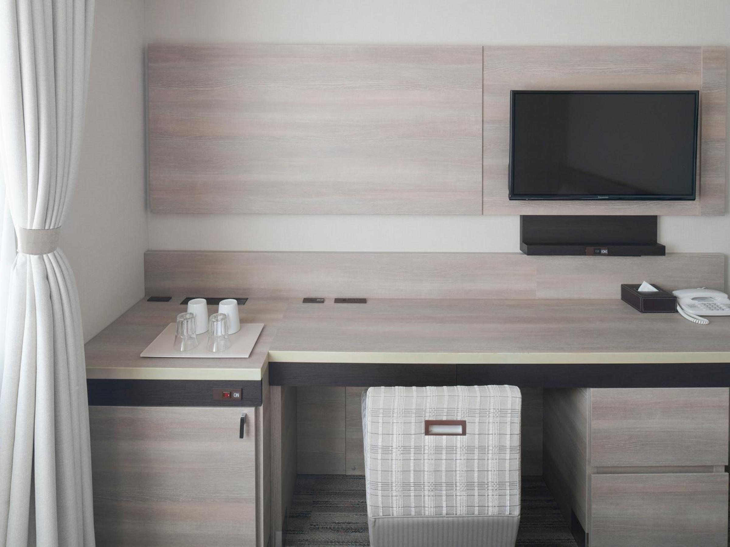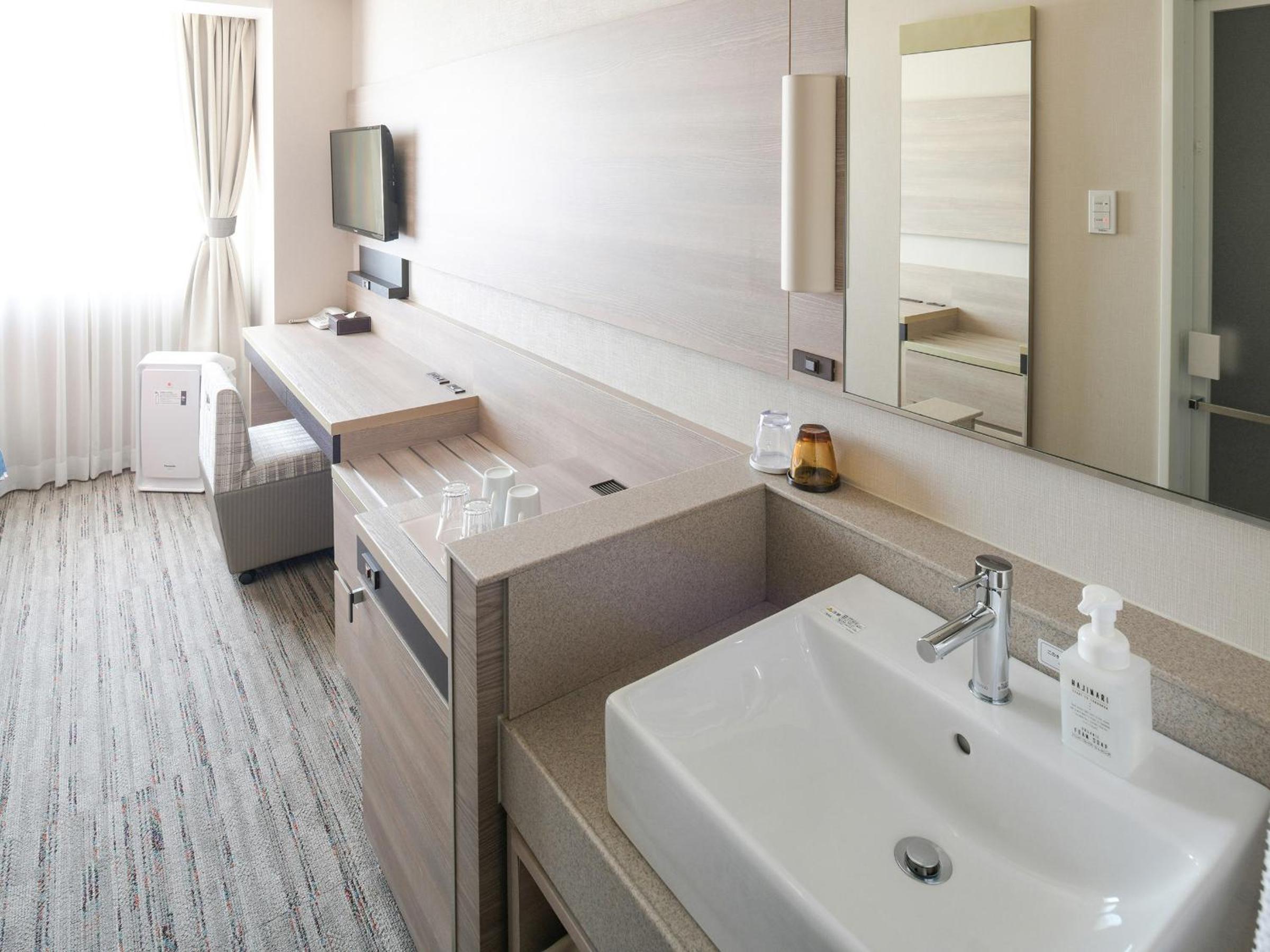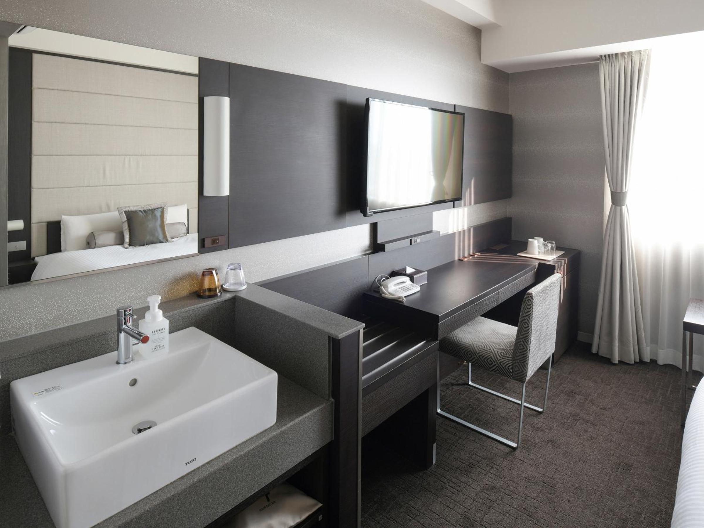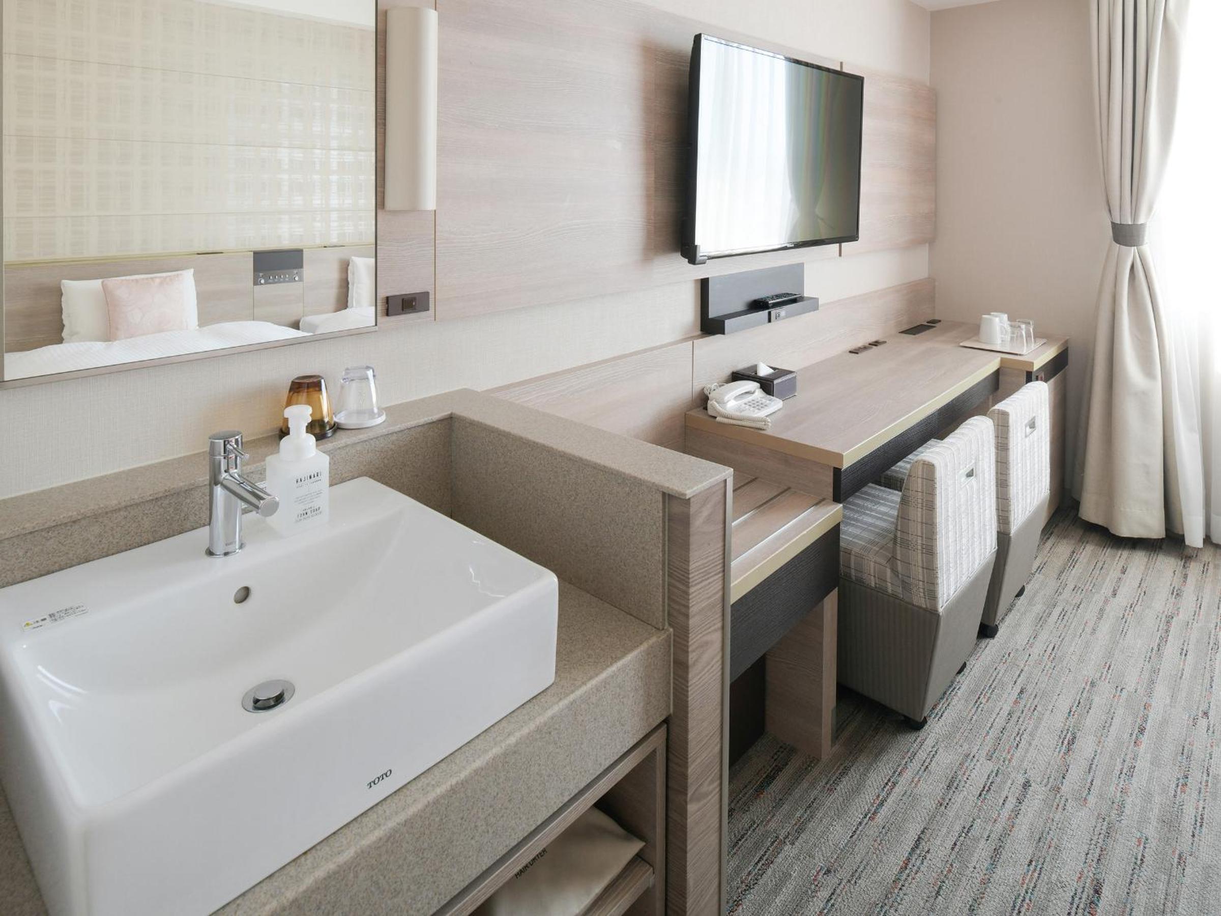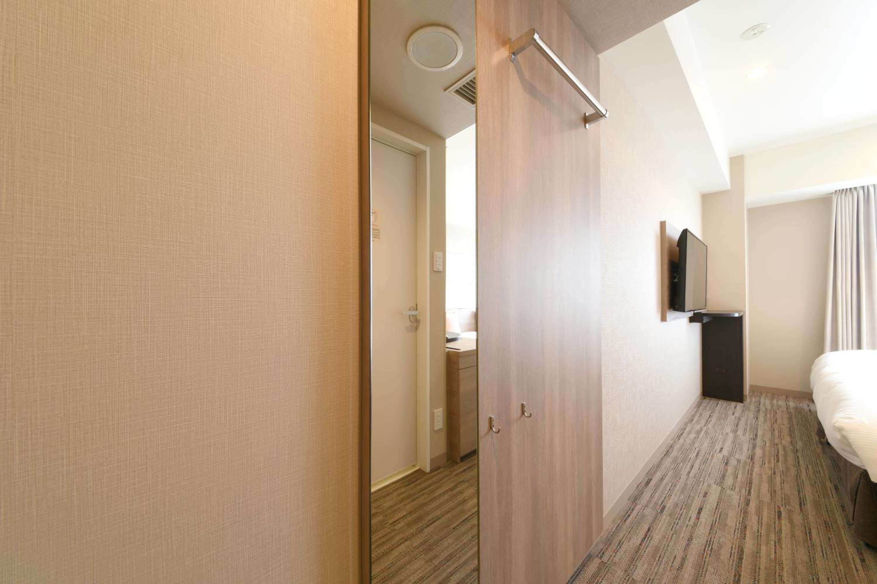 good location, just across the JR station and very clean; ok size room, usable bathtub- a bonus; and parking behind the hotel and at a reasonable price of 600 Yens. Many cosmetic things at reception but we usually do not use those and have our own. Some drinks at reception 2pm- midnight, including coffee- did not use those either. Close 24hs grocery store nearby and some bakery and other eateries in the hotel building. We had an amazing view toward the mountains in northern Kyoto and there was a beautiful sunset. Would stay again and recommend to others.