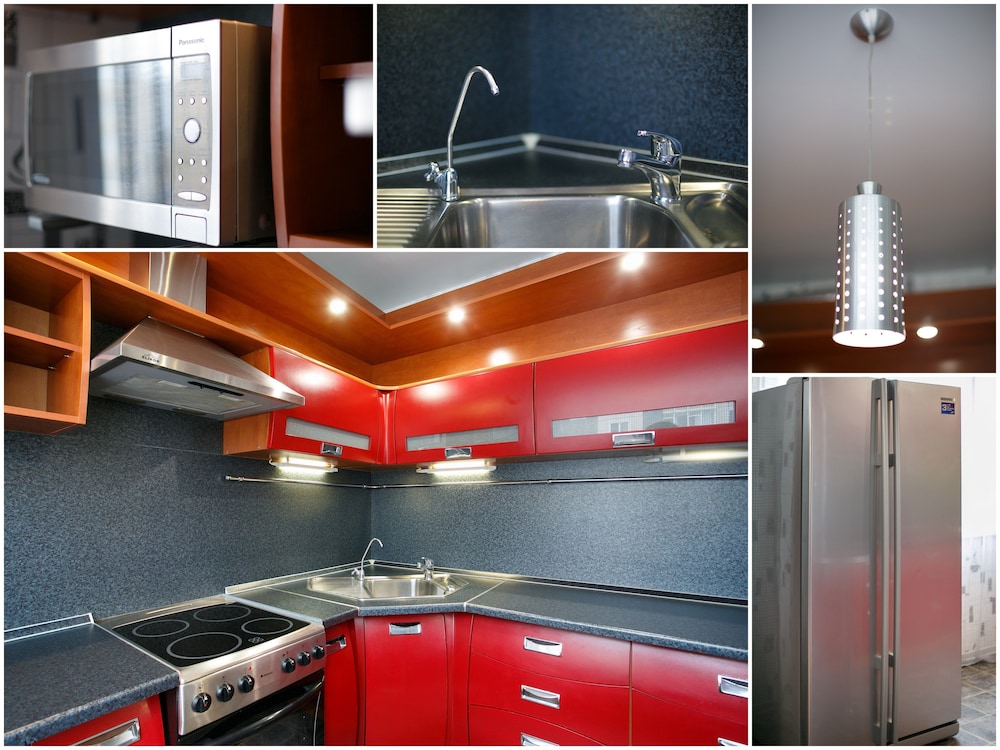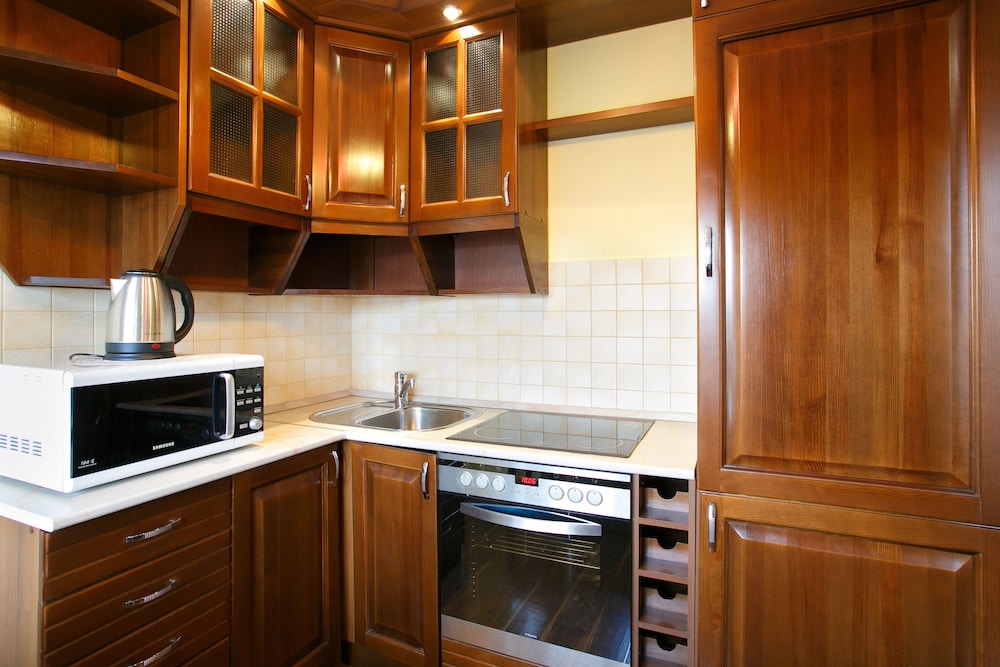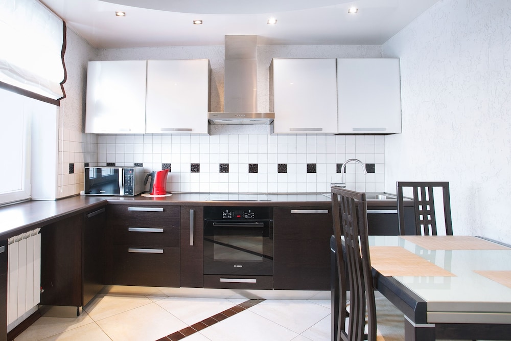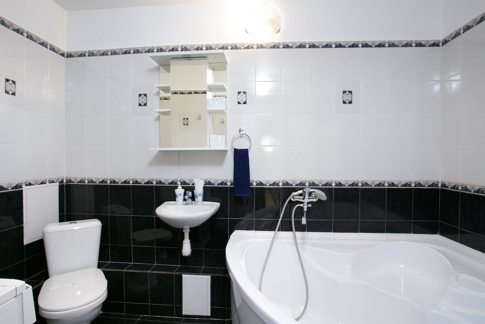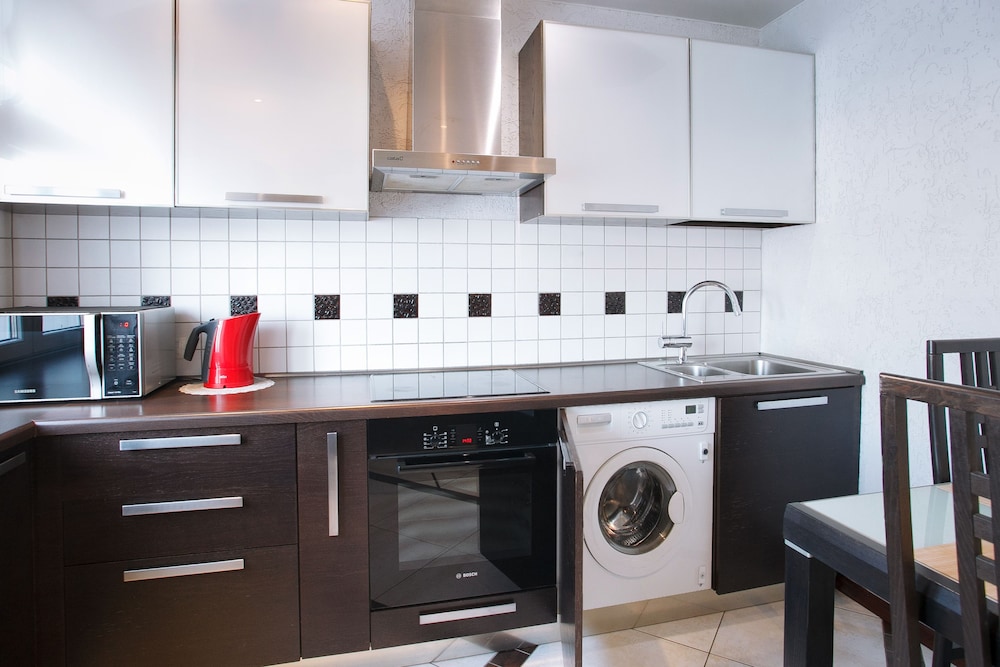 Апартаменты находятся в центре города. Прекрасный ремонт. Имеется все необходимое, вплоть до фена. Но всего два комплекта кухонных предметов - тарелок, ложек, вилок, кружек и т.п. (по количеству проживающих)
