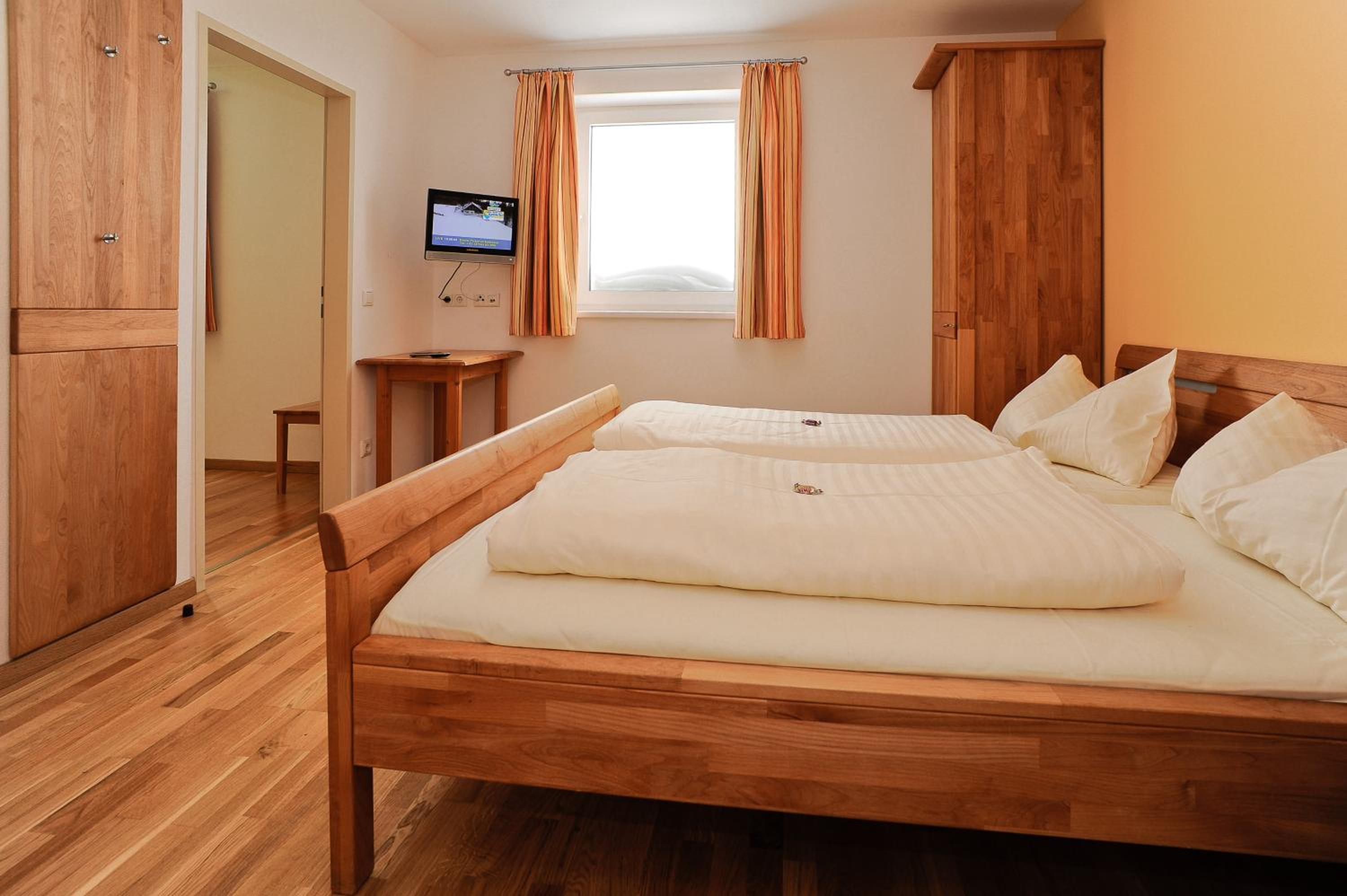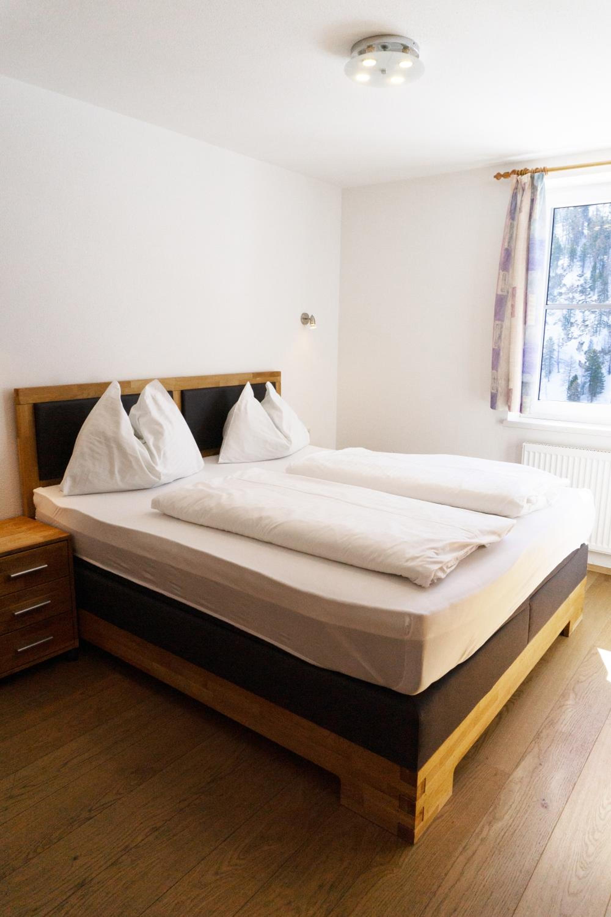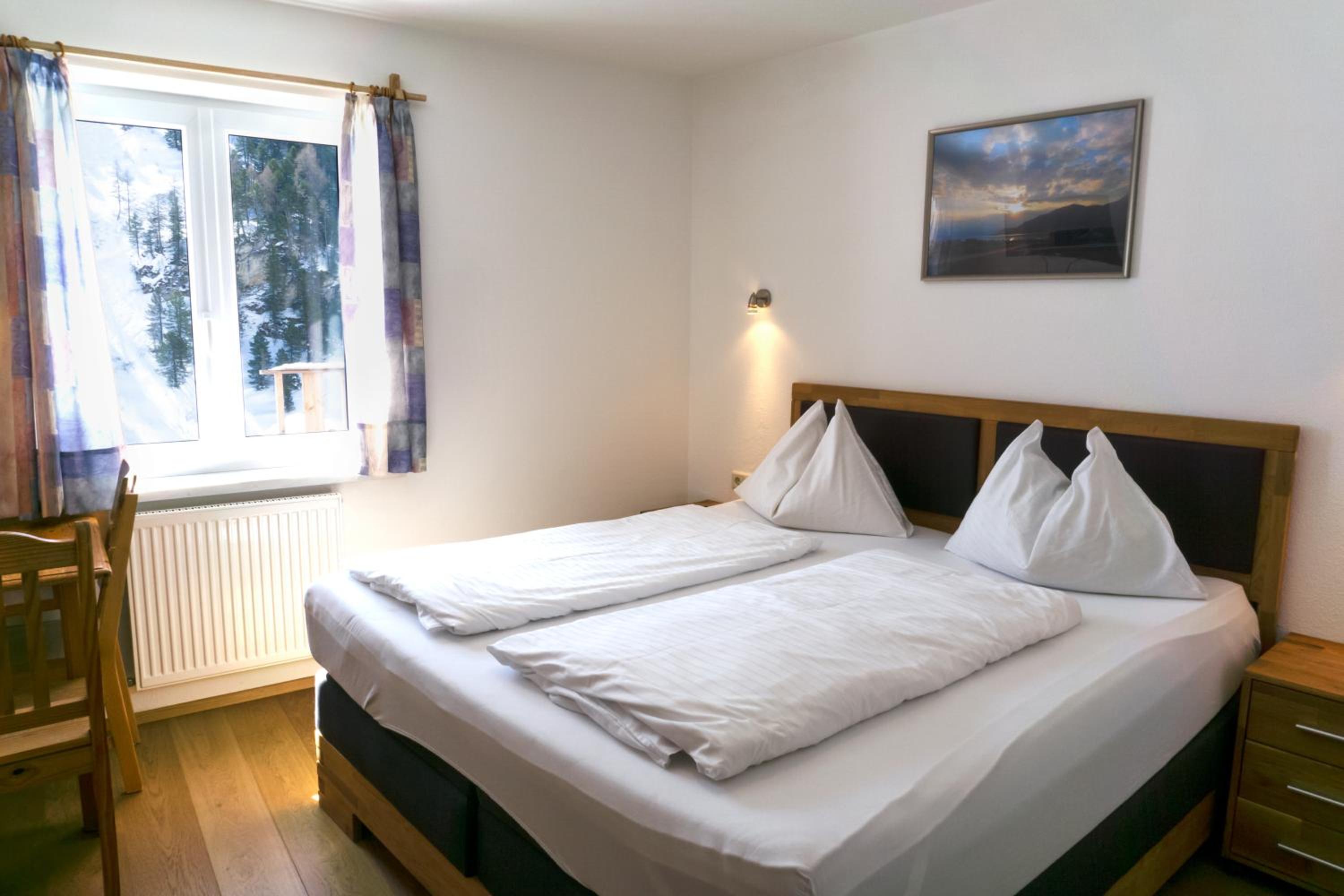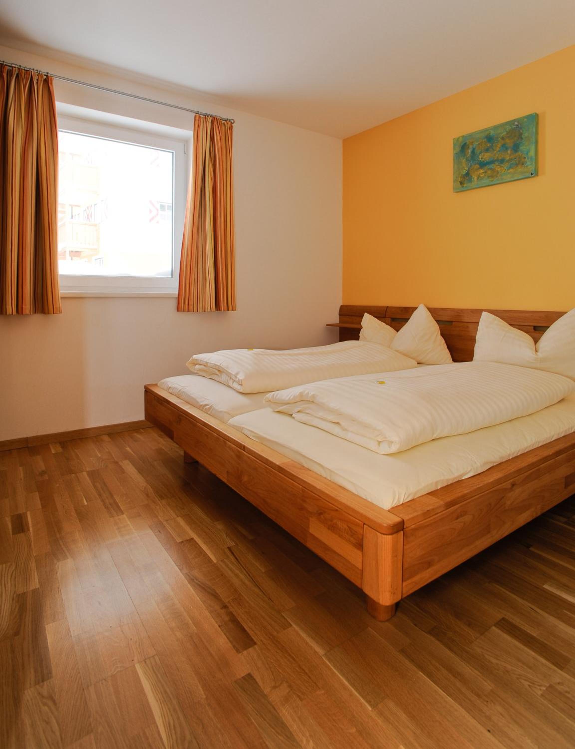 The spacious rooms and apartments at Hotel Laaxerhof are elegantly furnished with high-quality solid wood furniture, including hand-crafted beds for a comfortable stay.