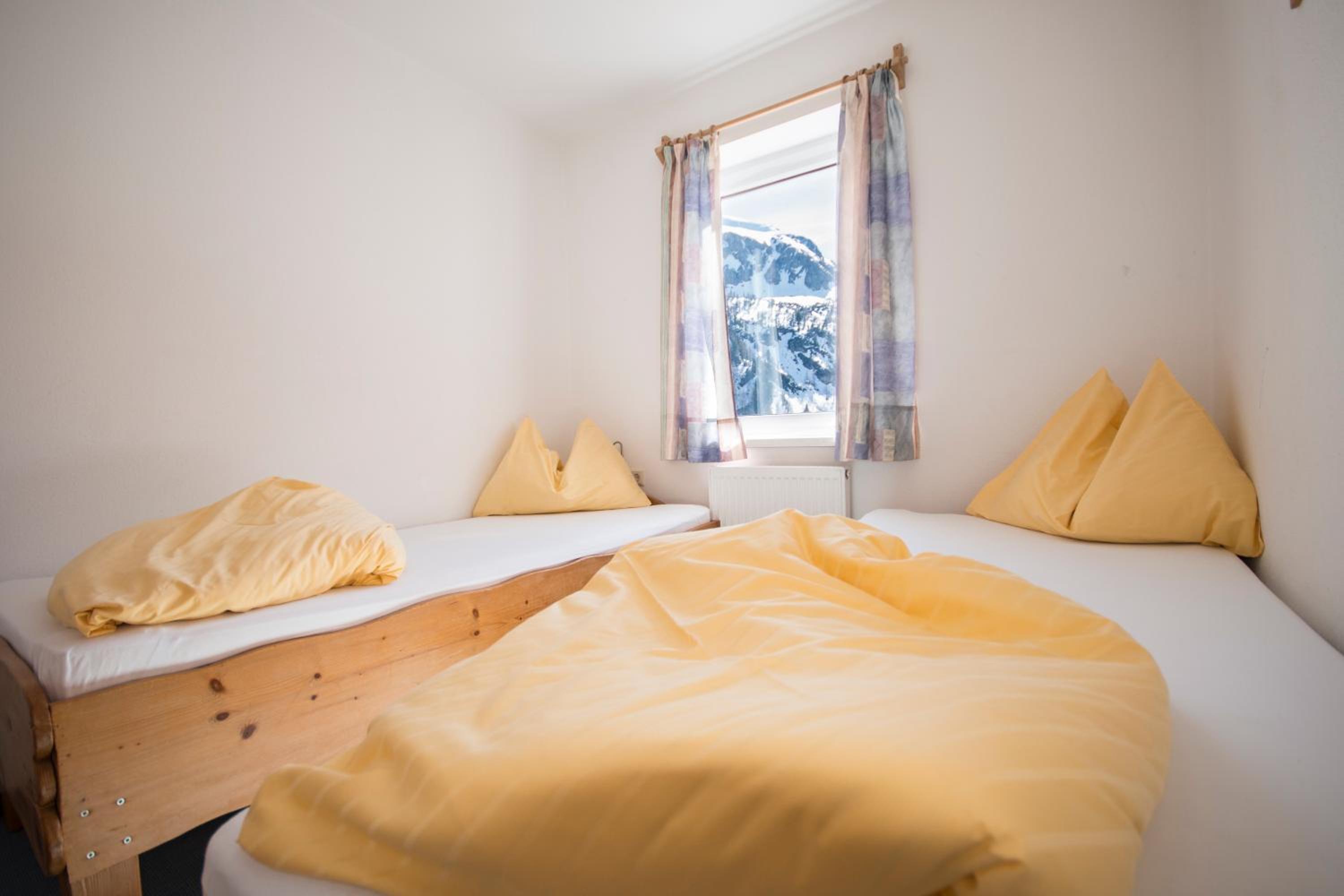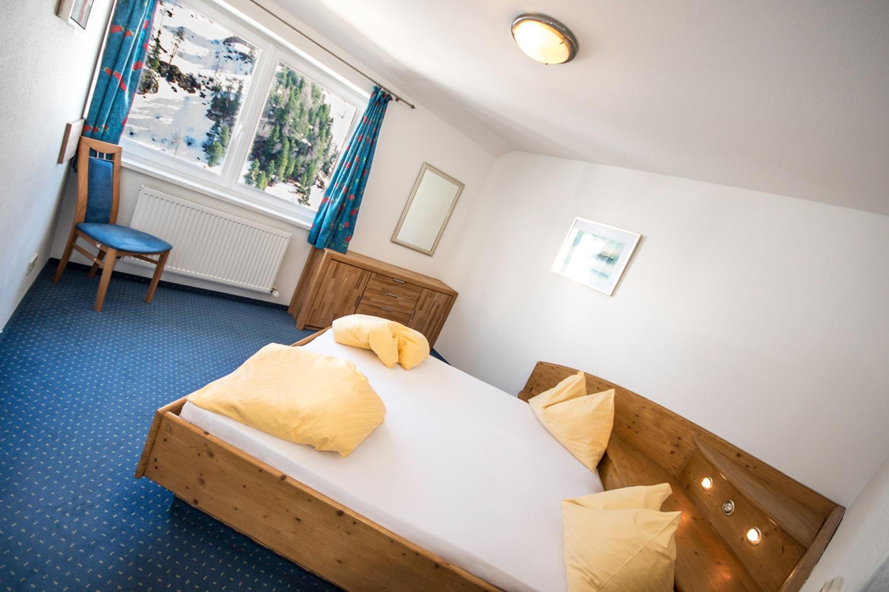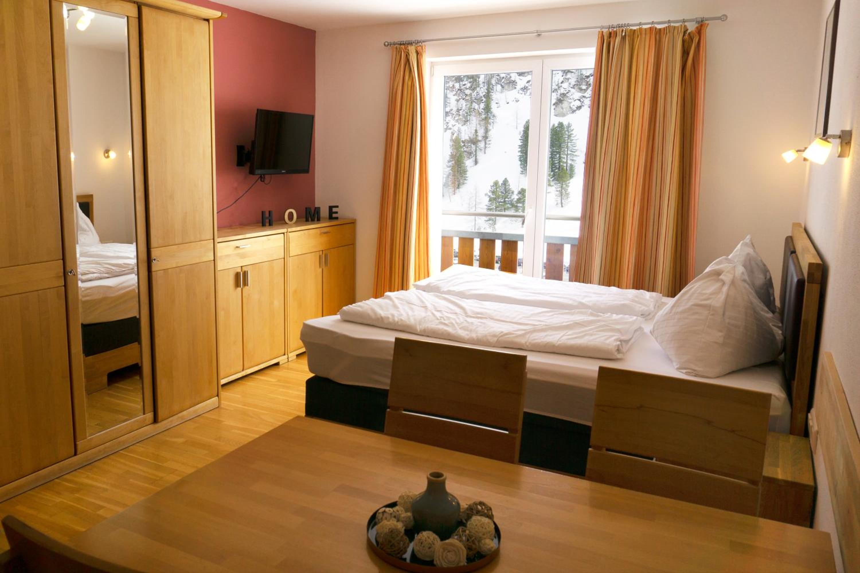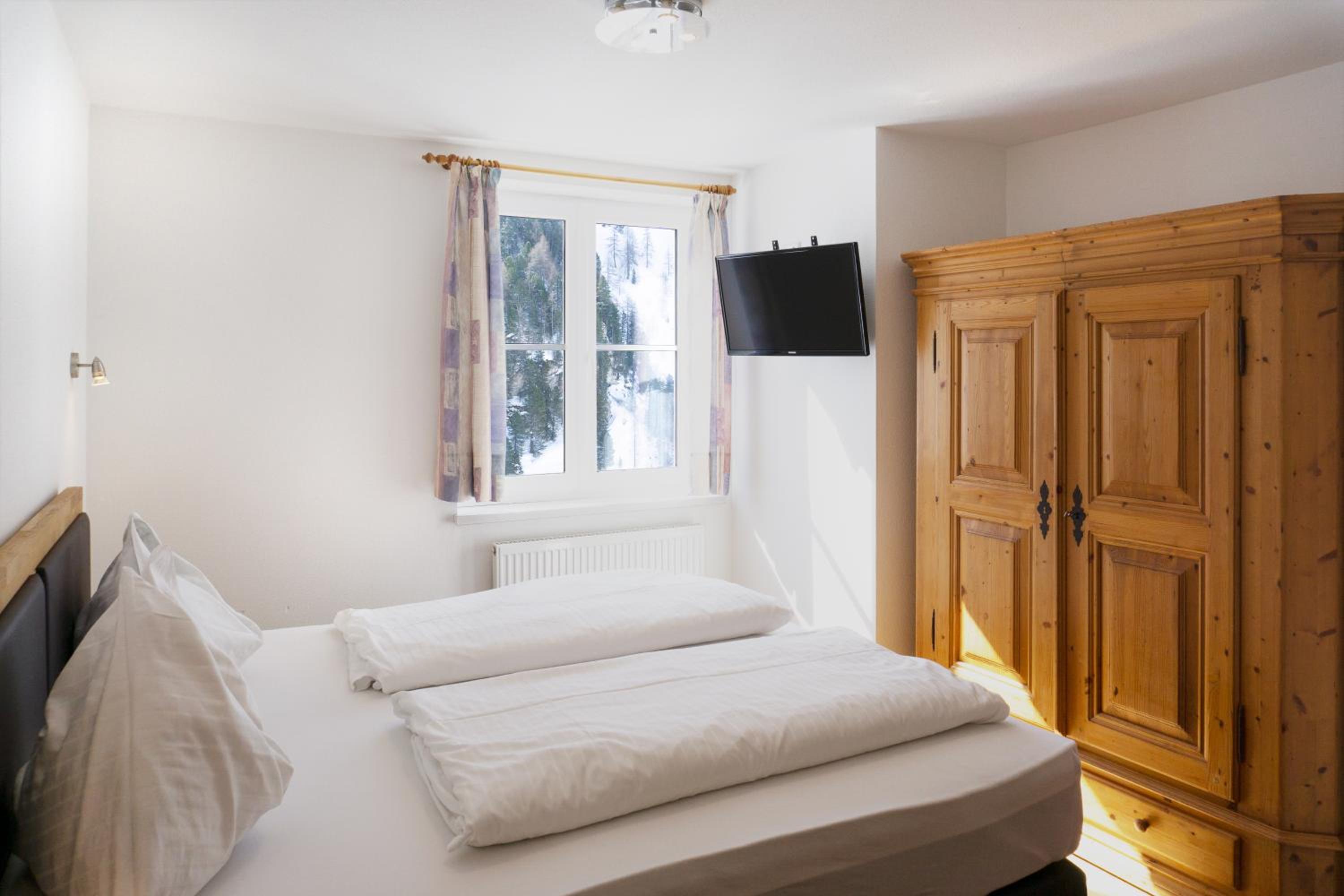 The spacious rooms and apartments at Hotel Laaxerhof are elegantly furnished with high-quality solid wood furniture, including hand-crafted beds for a comfortable stay.