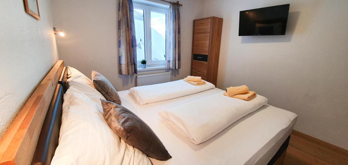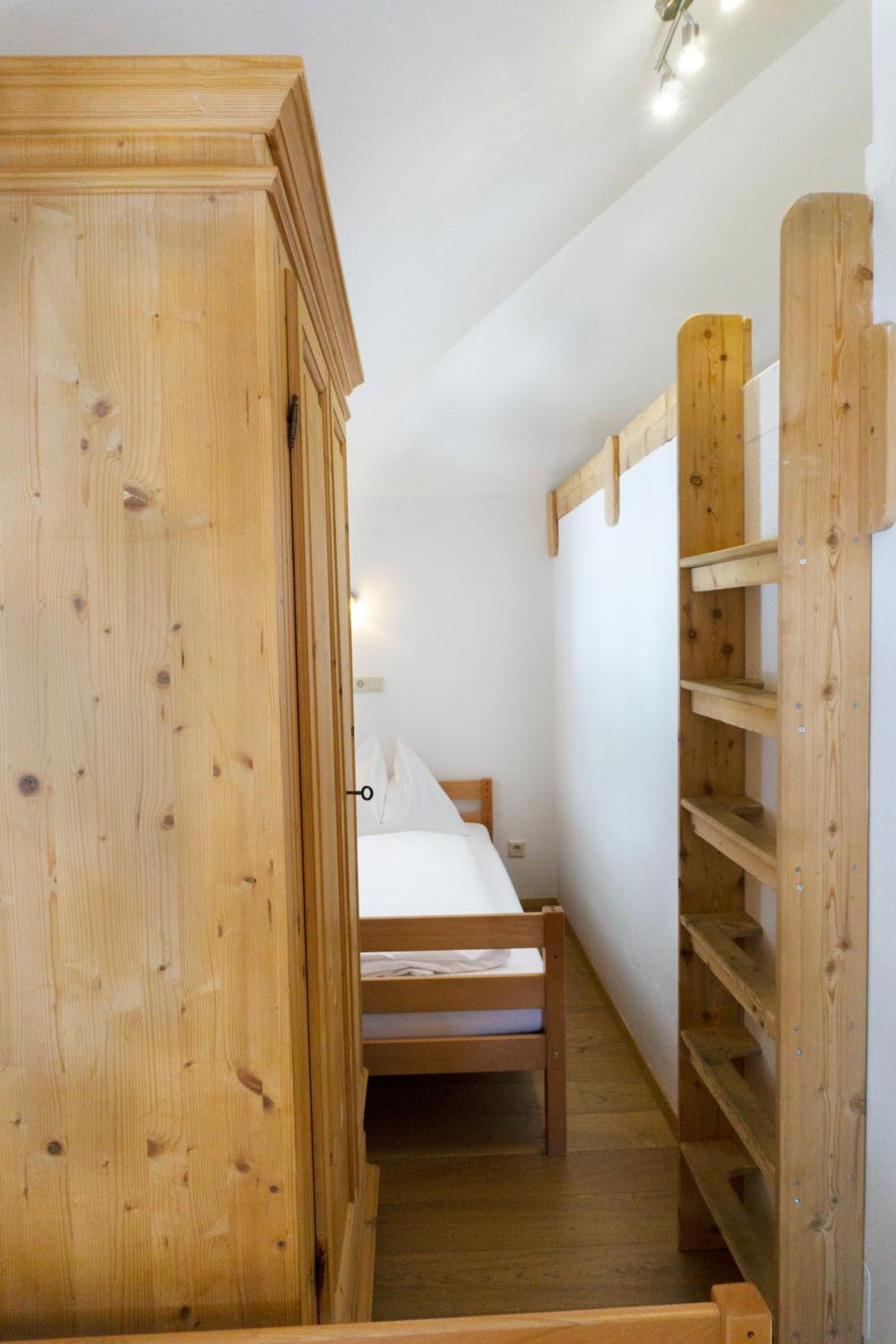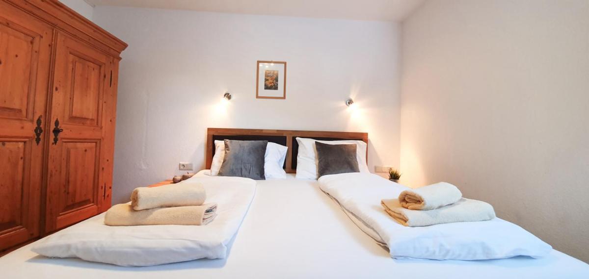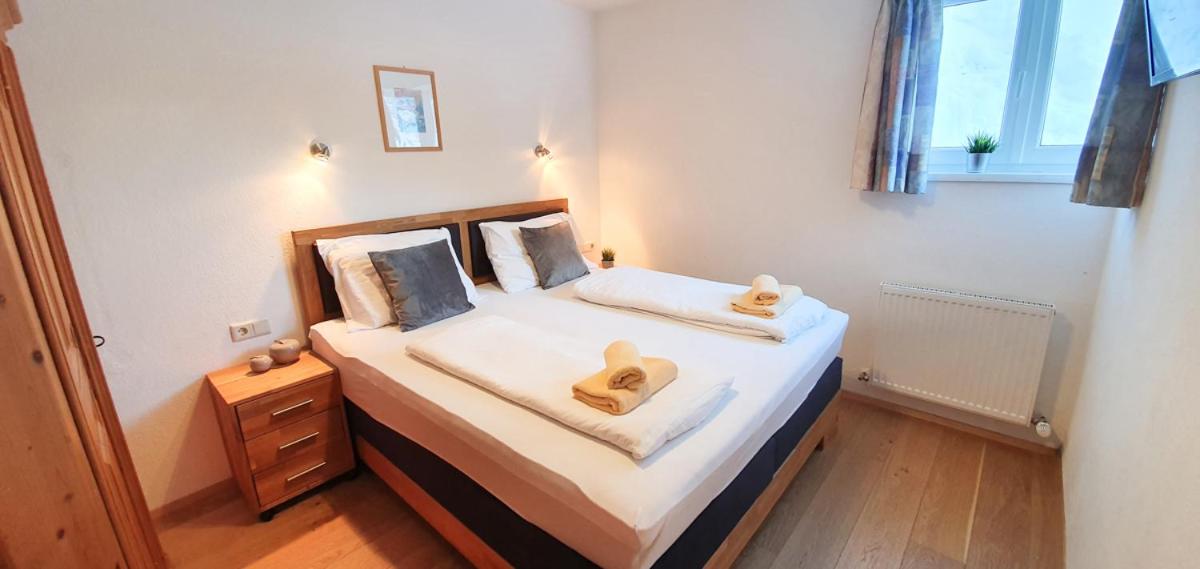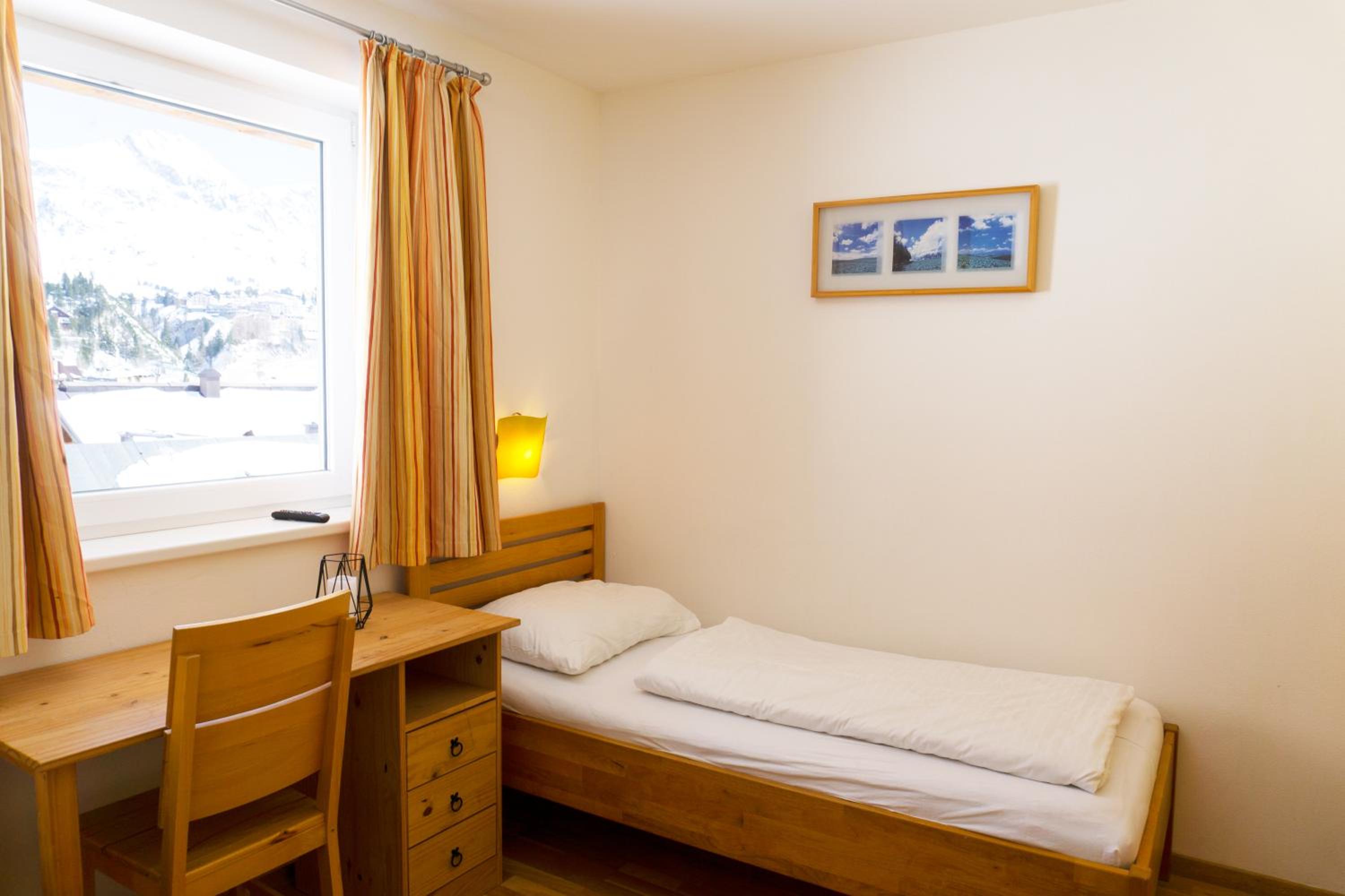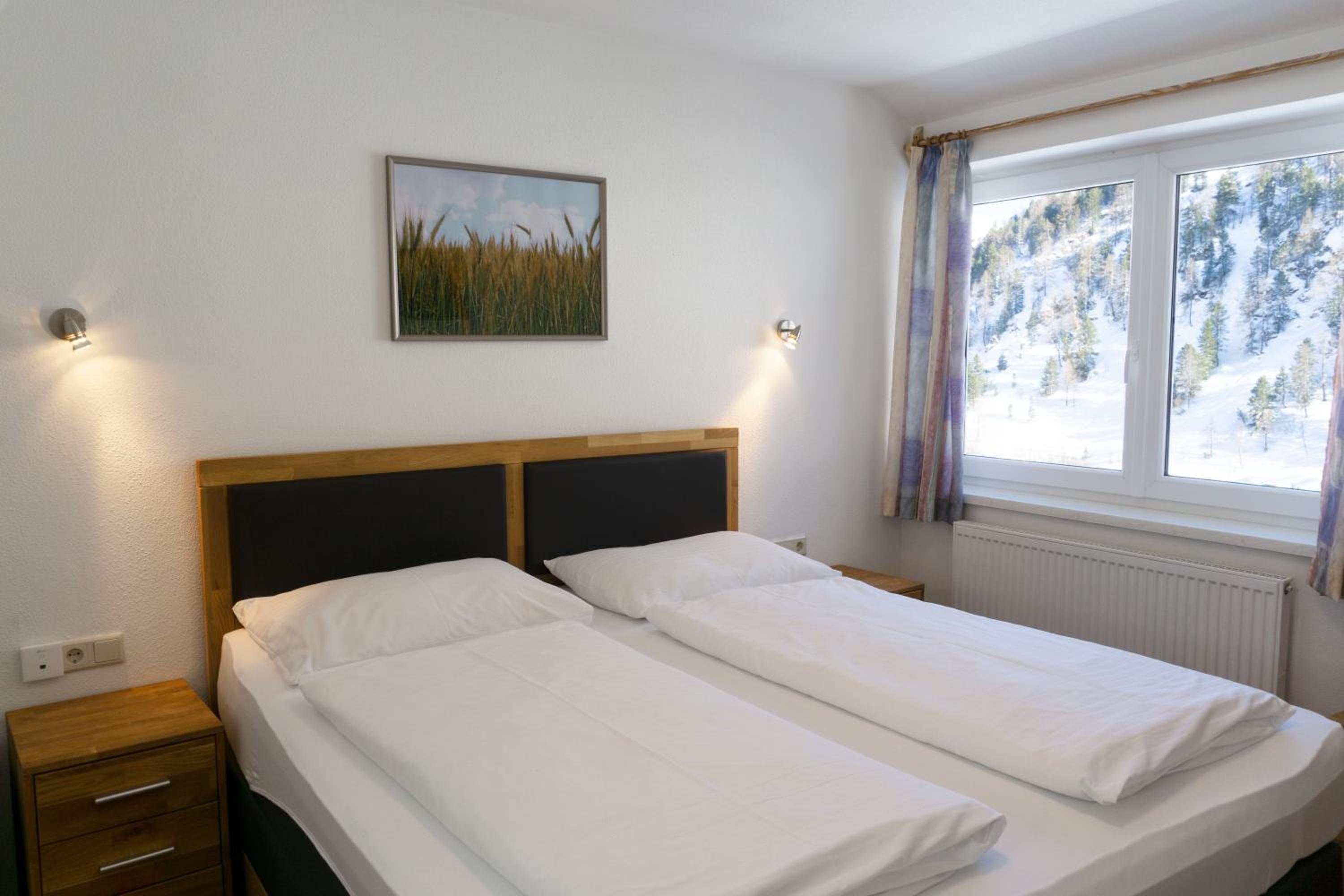 The spacious rooms and apartments at Hotel Laaxerhof are elegantly furnished with high-quality solid wood furniture, including hand-crafted beds for a comfortable stay.