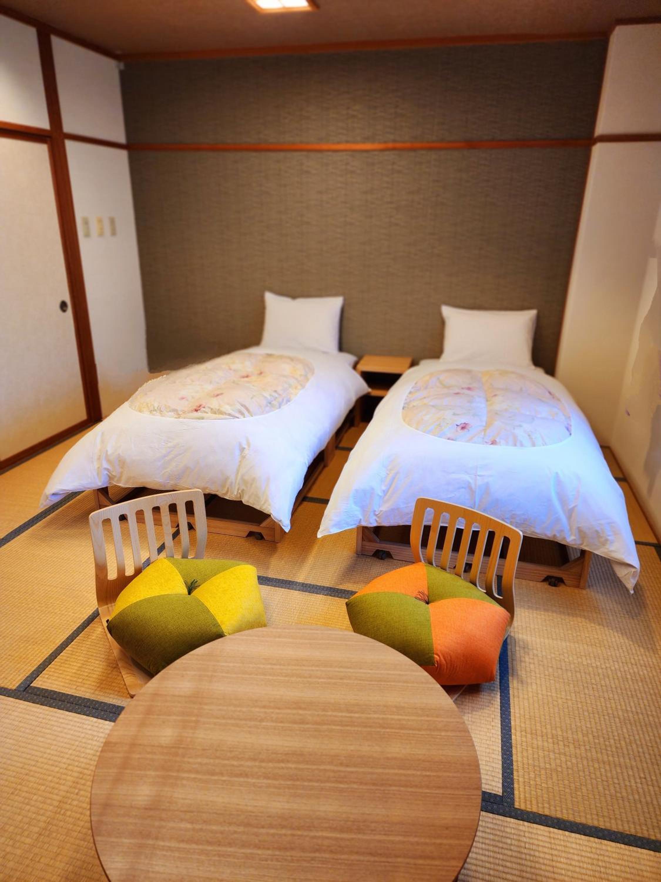 Experience authentic Japanese hospitality in the simple yet comfortable rooms featuring tatami floors and futon bedding. Each room is equipped with modern amenities such as a TV, fridge, and heating. Yukata robes and a toothbrush kit are provided for your convenience.