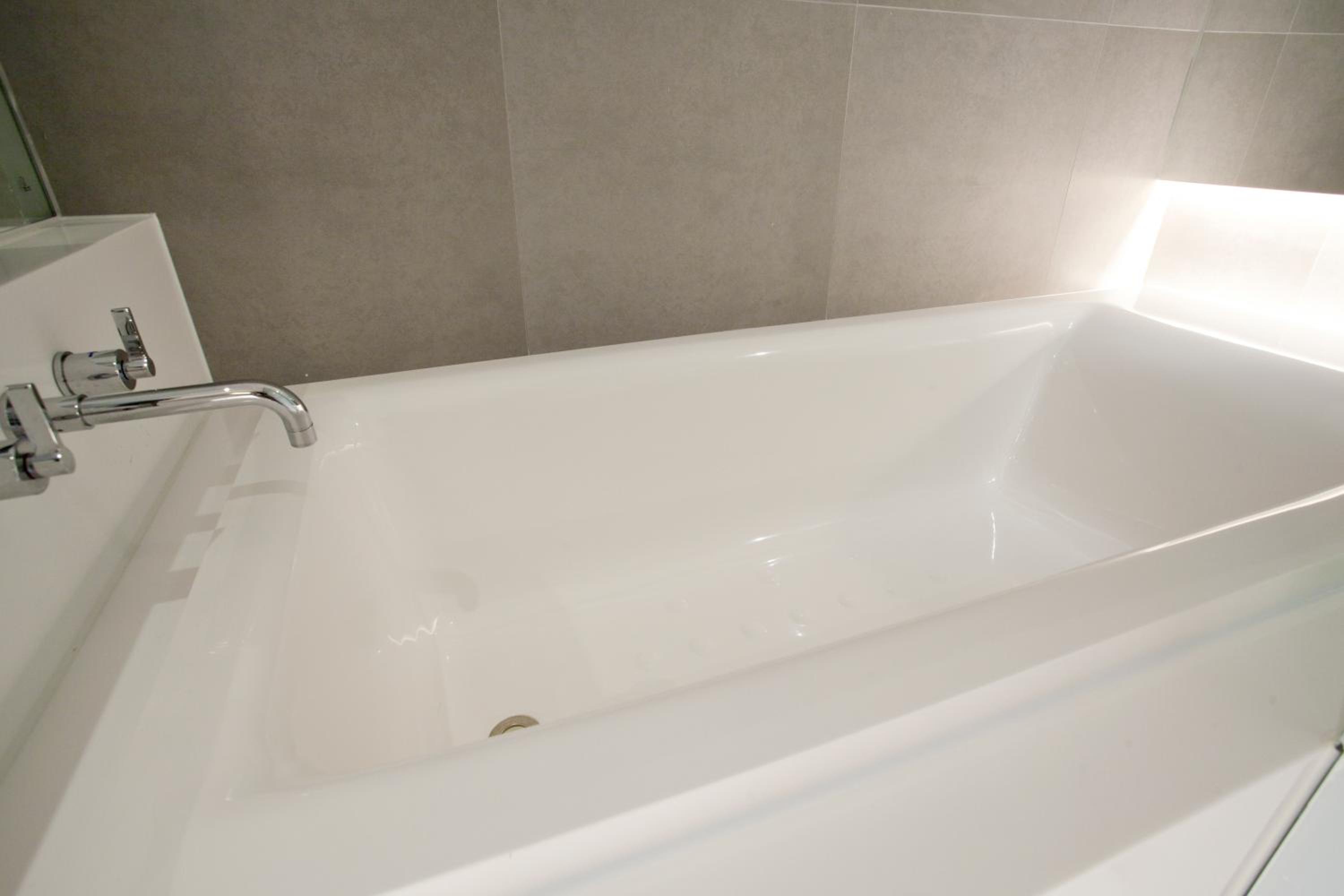 The bathtub leaked, leaving water all over the kitchenette space