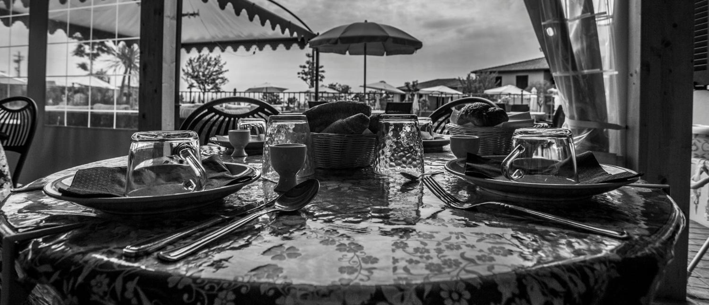Plastikstühle und Plastiktasche auf der Terrasse