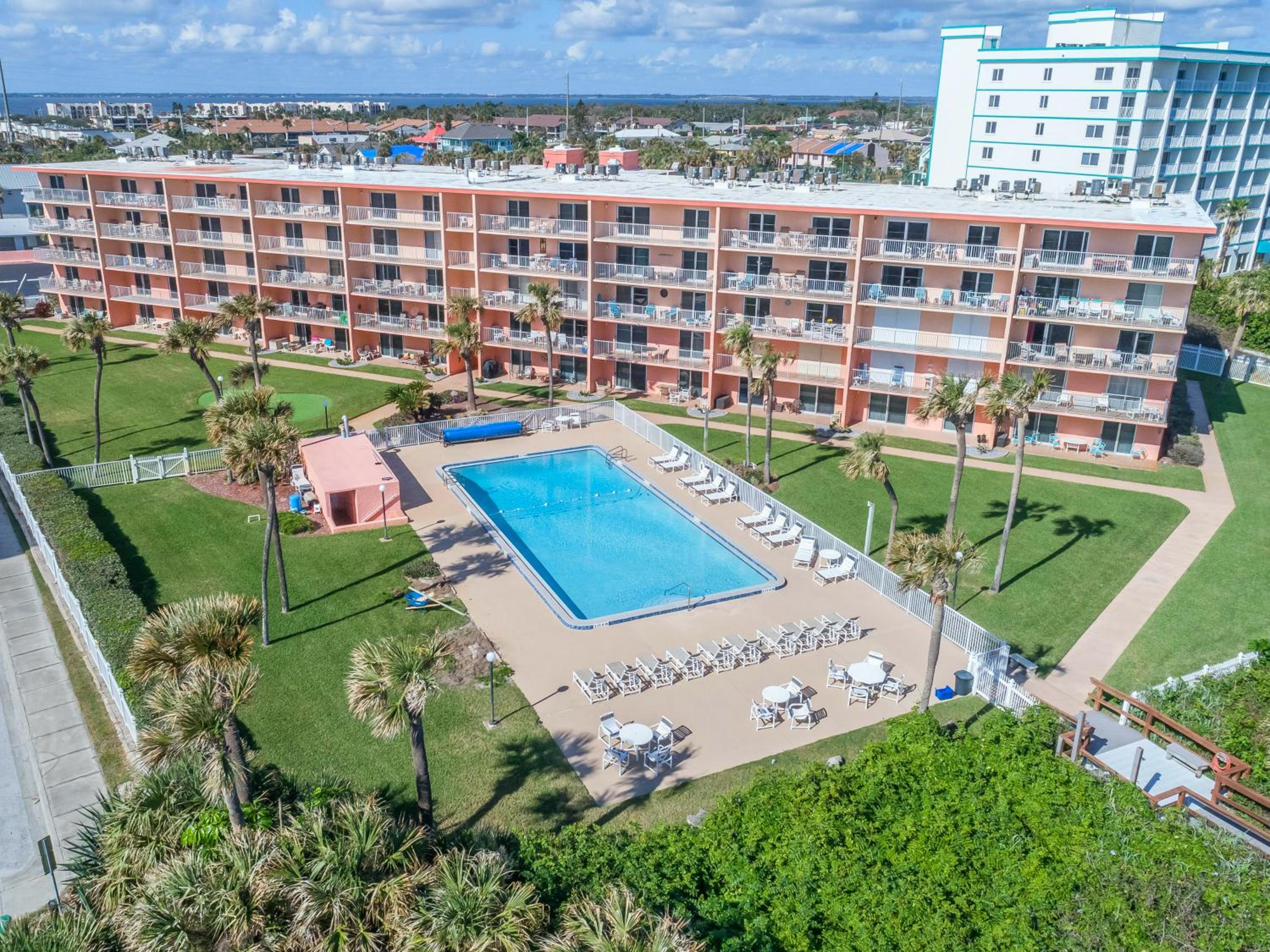 Indulge in a relaxing stay at Cocoa Beach Towers with a heated pool, perfect for unwinding under the sun. Enjoy quality family time with access to mini-golf and spacious family rooms. The fully equipped kitchen and cozy seating area in each unit make it feel like a home away from home.