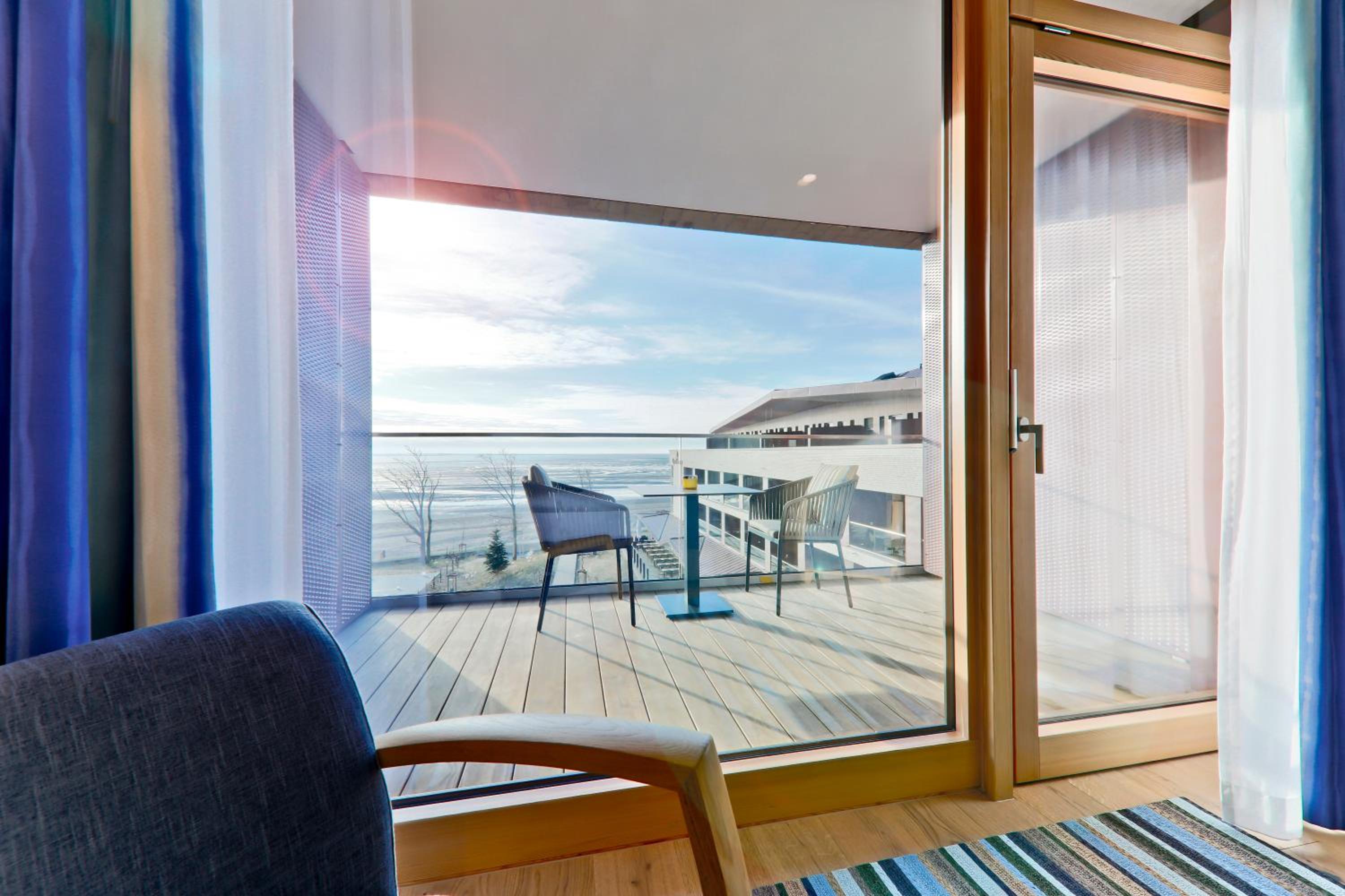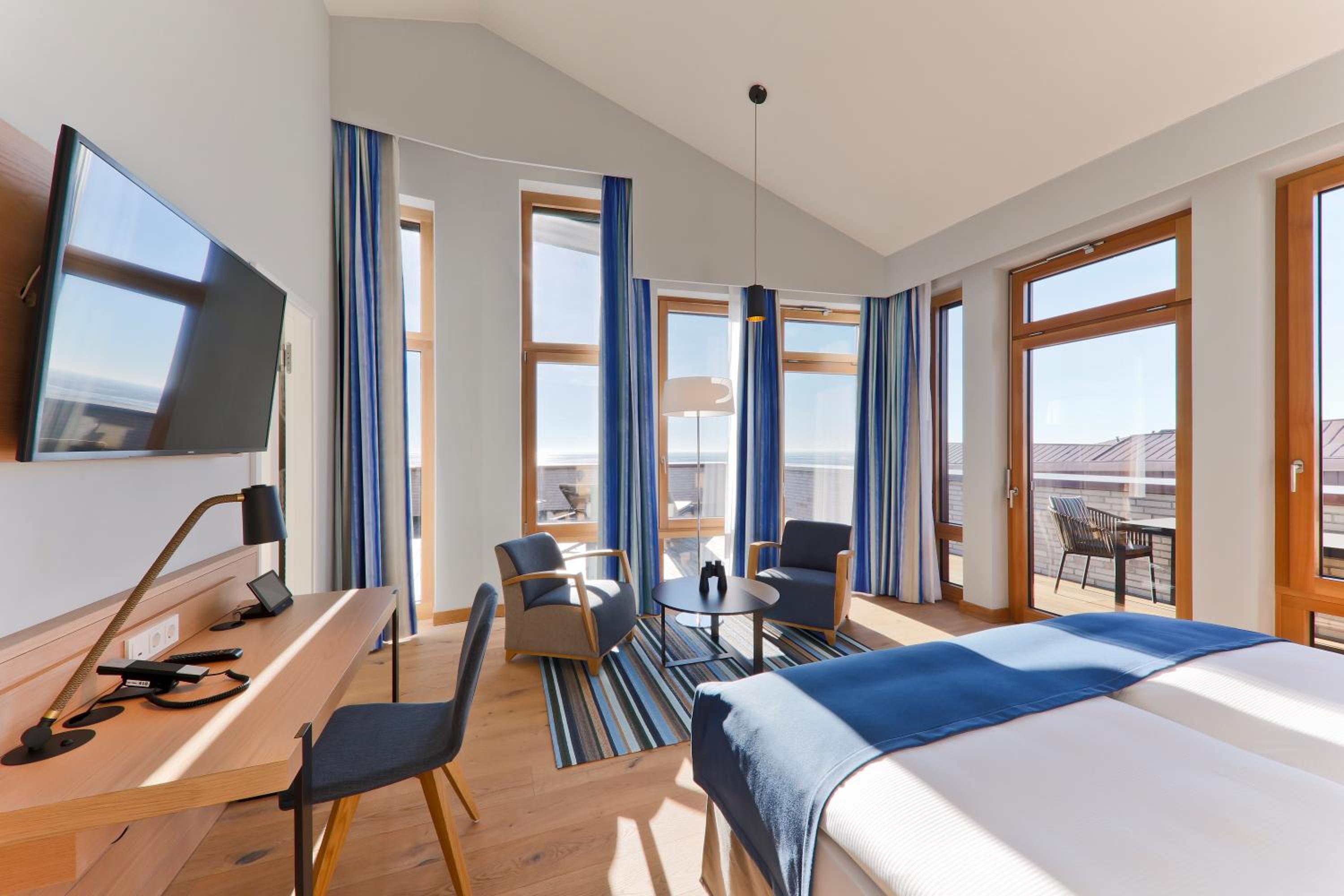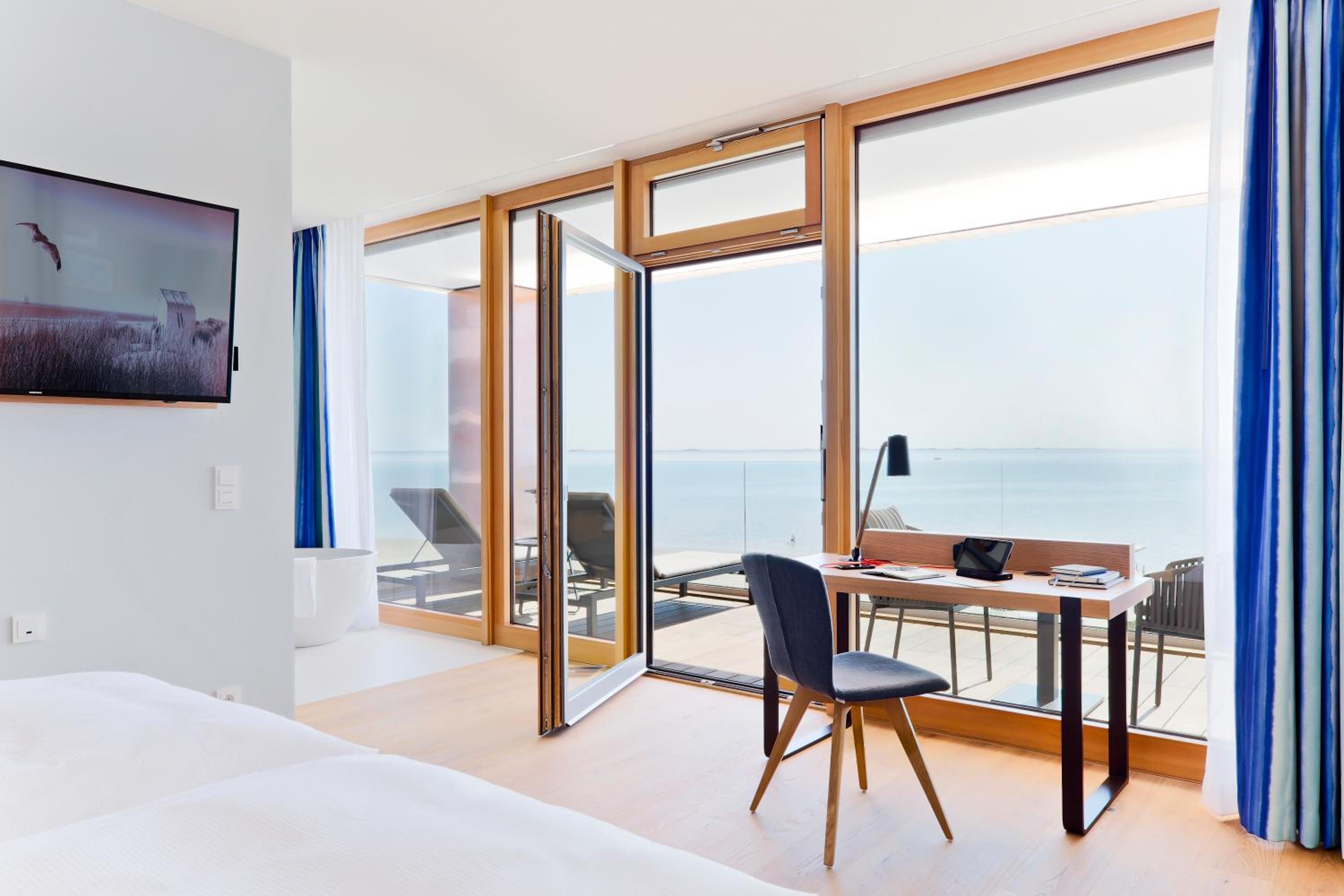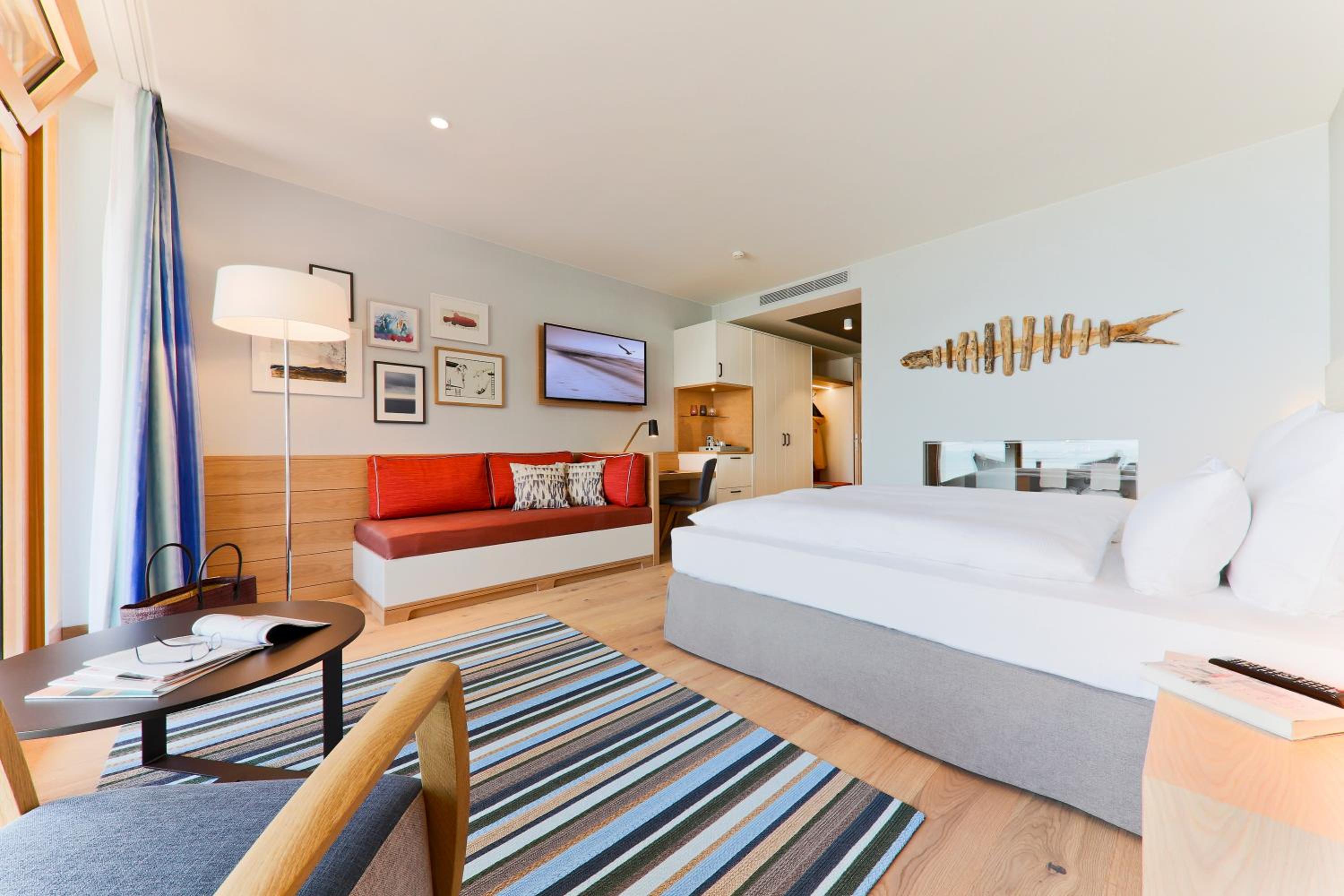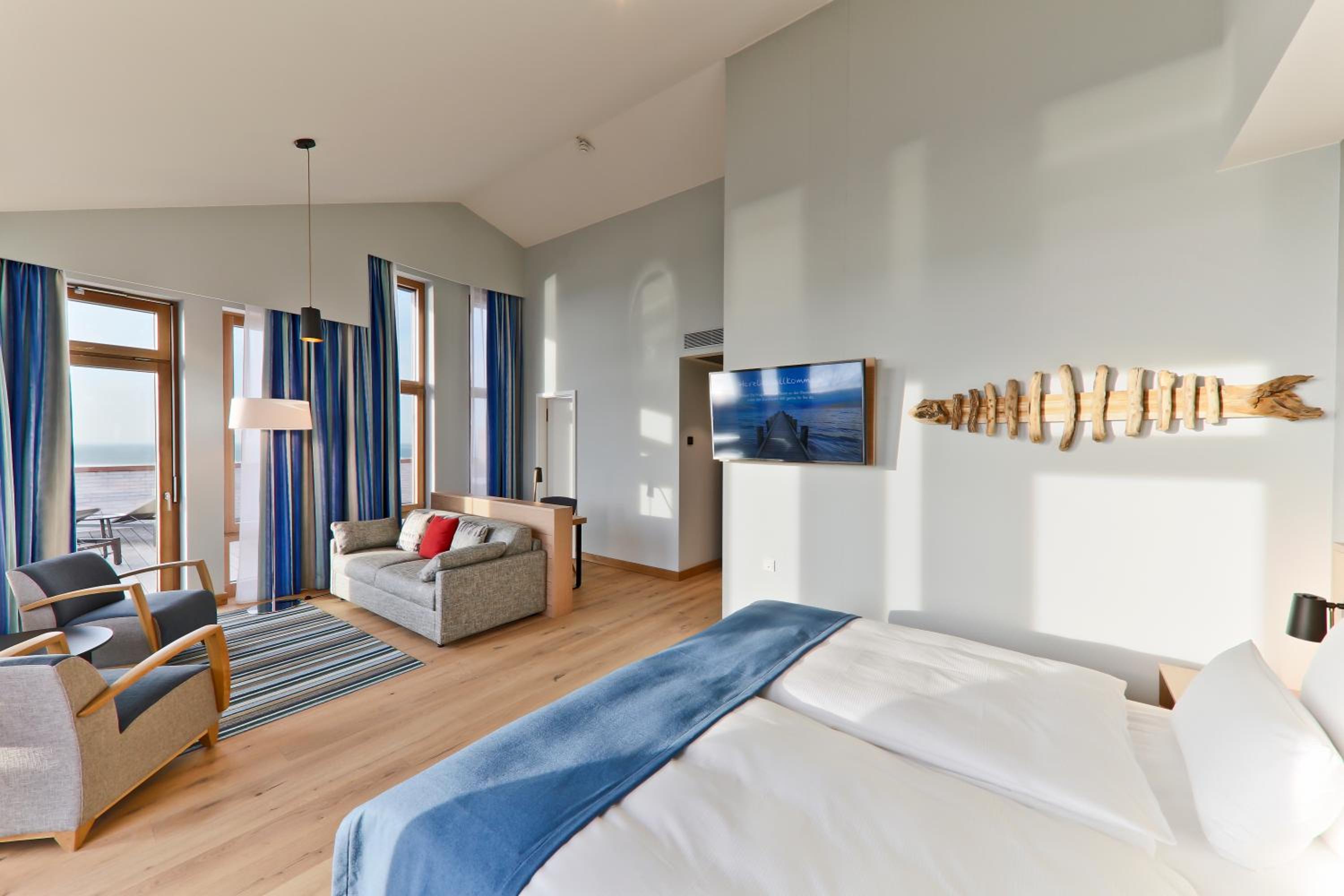 Experience comfort in rooms with modern amenities like flat-screen TVs, sound bars, and free WiFi. Most rooms offer stunning views of the North Sea. With an underground car park and proximity to Wyk town center, leisure activities are just a stroll away.