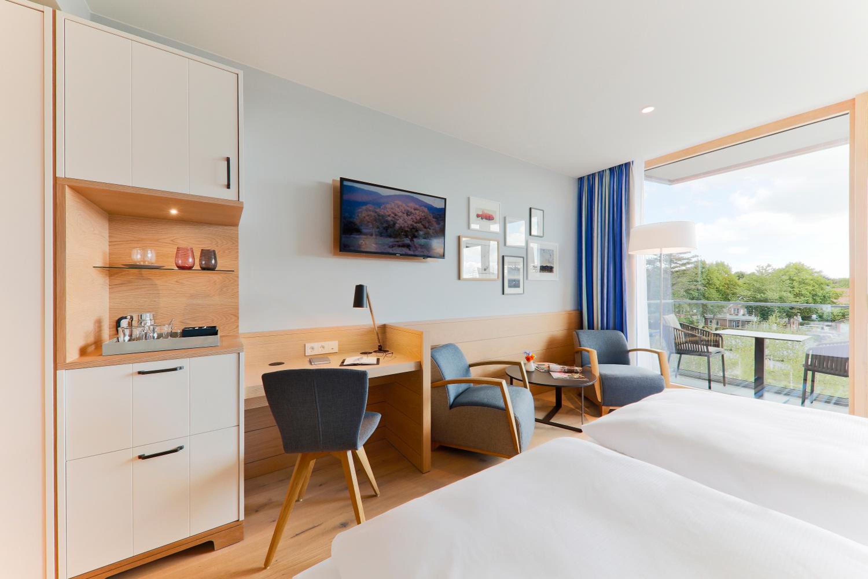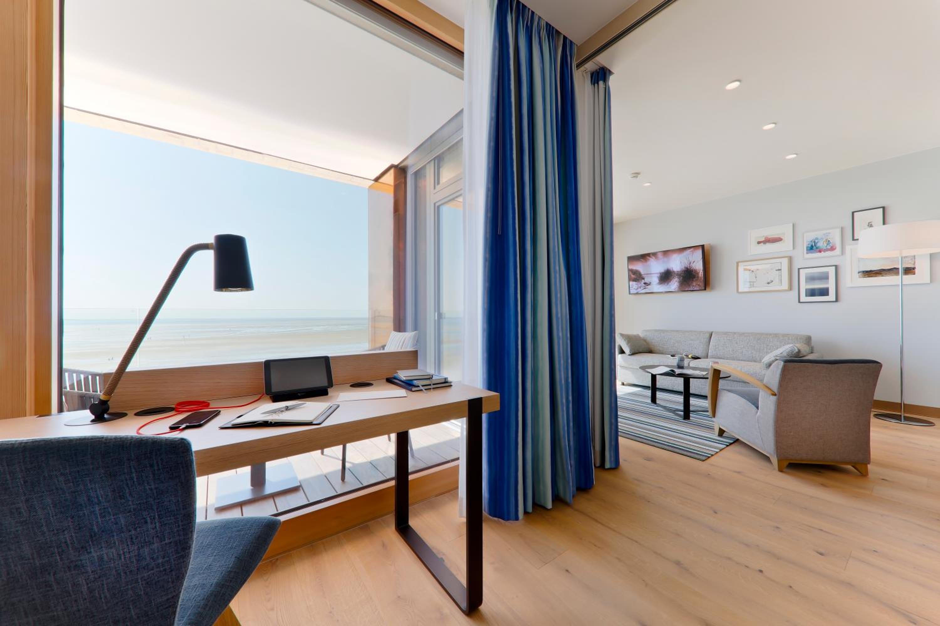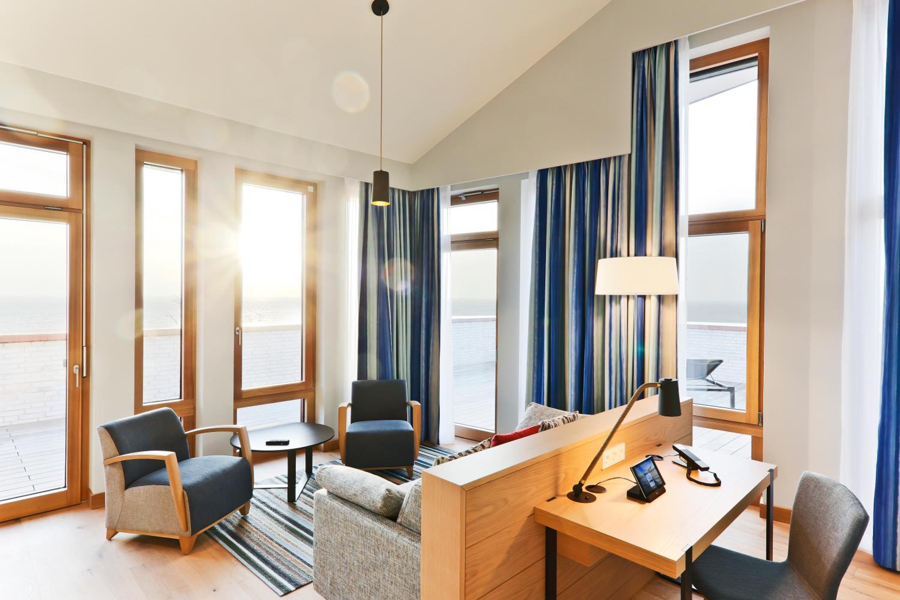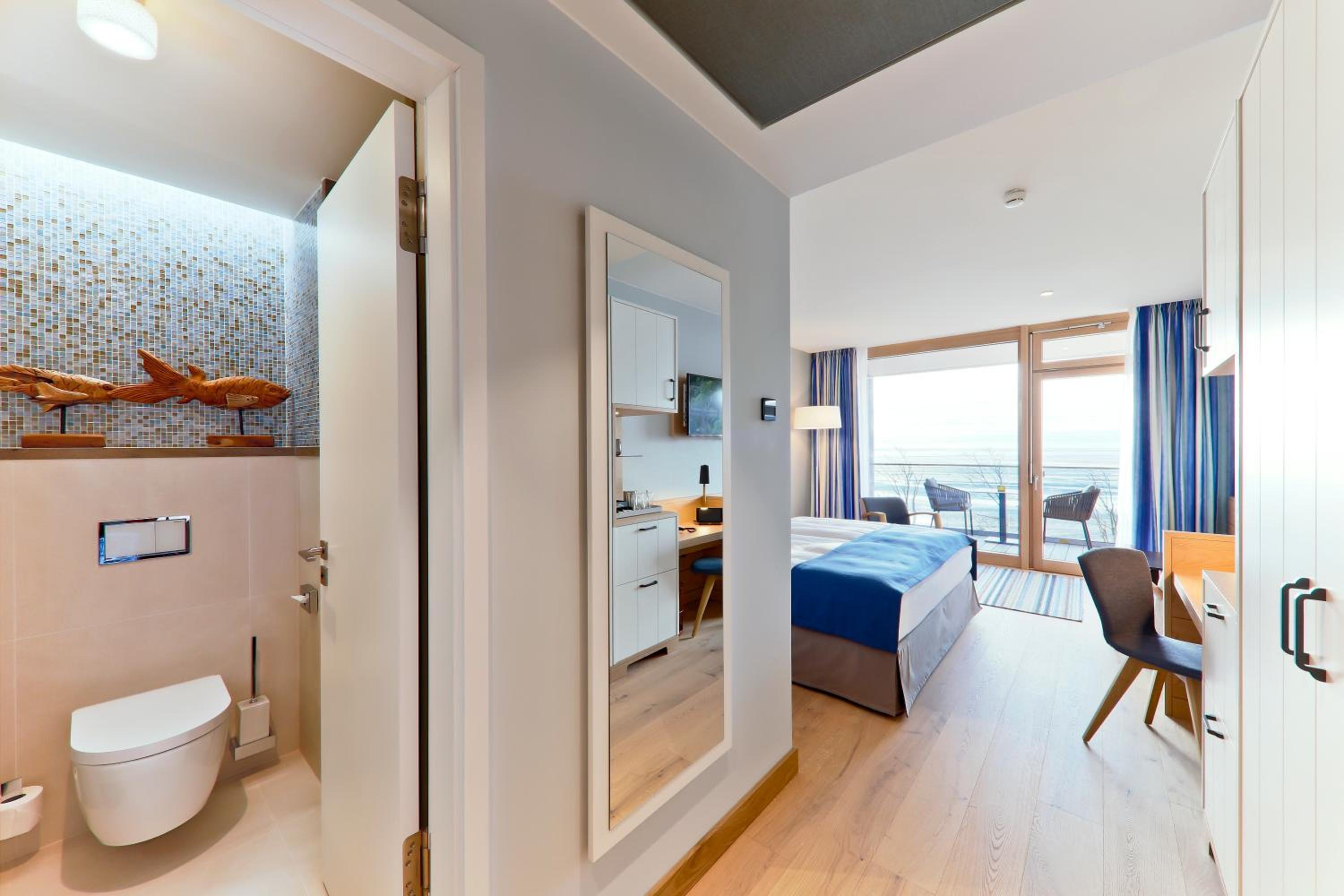 Experience comfort in rooms with modern amenities like flat-screen TVs, sound bars, and free WiFi. Most rooms offer stunning views of the North Sea. With an underground car park and proximity to Wyk town center, leisure activities are just a stroll away.