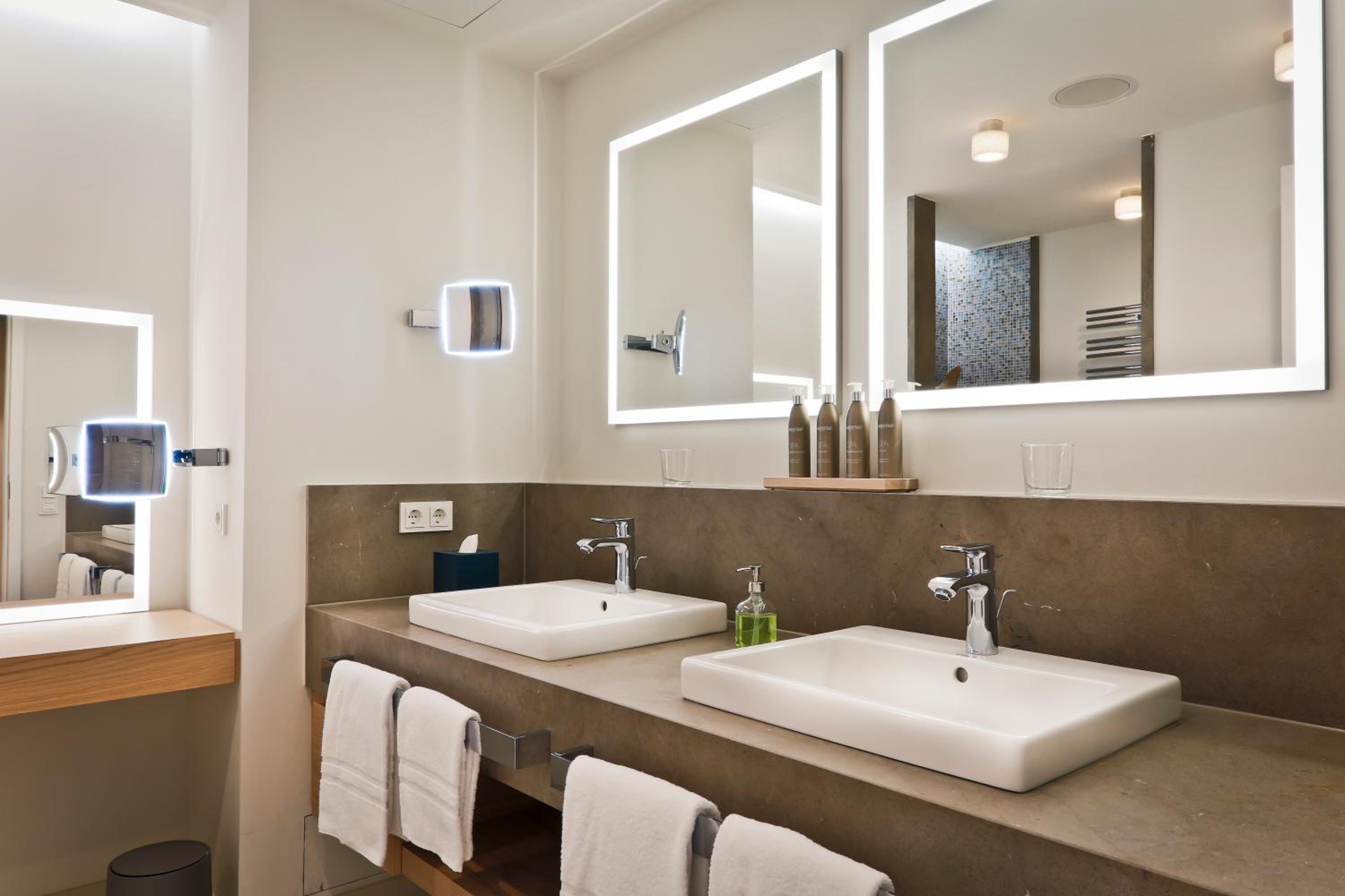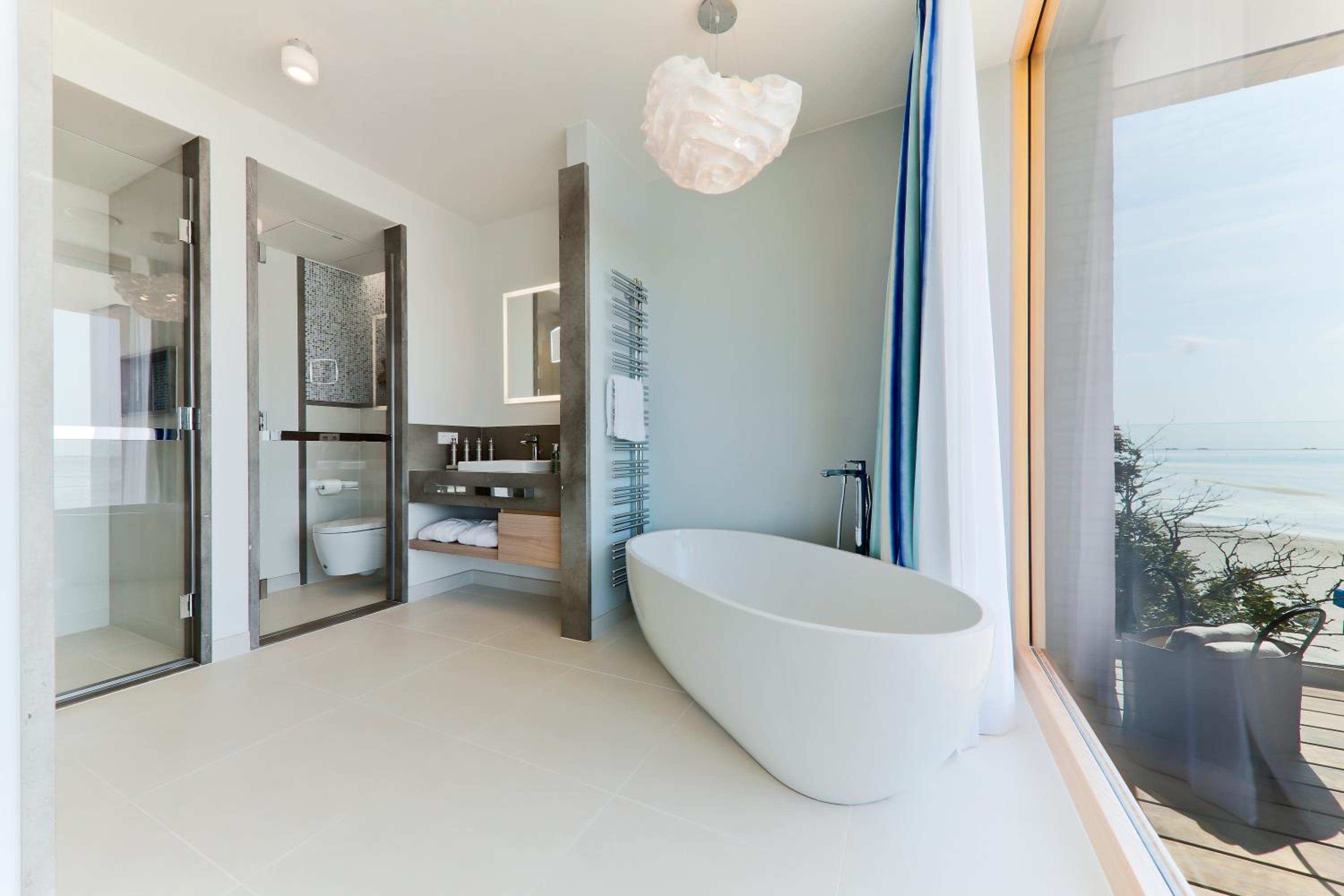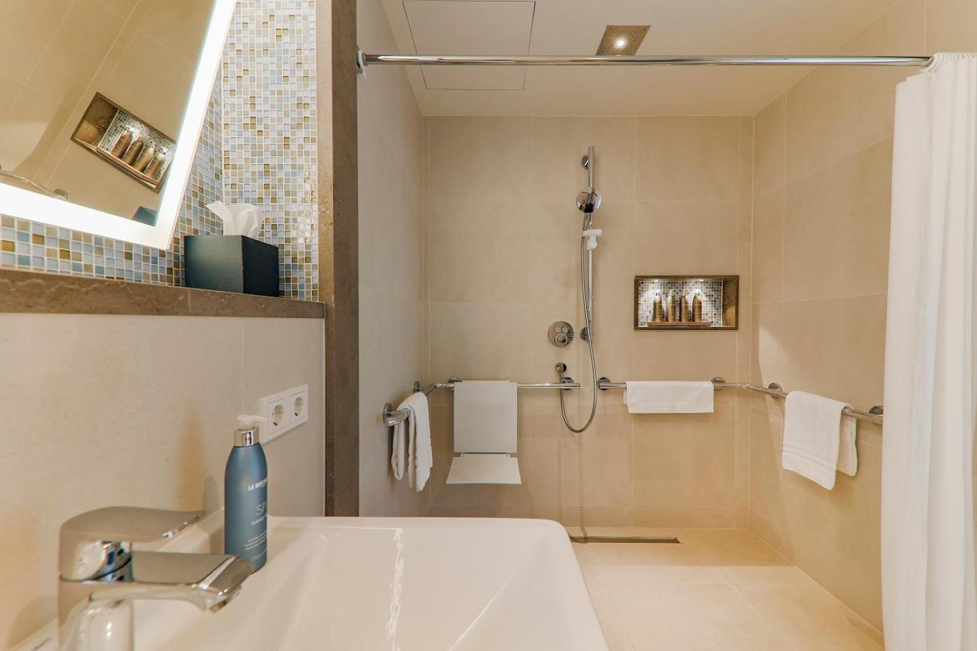 Die Ausstattung des Bades im Zimmer war leider nicht besonders durchdacht: Regendusche ist eher ein Platzregen der das komplette Bad unter Wasser setzt, der andere Duschkopf hängt viel zu niedrig und ist leider nicht höhenverstellbar . Die Badewanne ist ungewöhnlich hoch und macht somit den Ausstieg extrem schwierig da zudem eine Haltemöglichkeit fehlt . Aber der absolute Hammer ist der Föhn!! Ein Billigmodell und zu allem Überfluss auch noch in einer Schublade befestigt sodass ein föhnen vor dem Spiegel unmöglich ist - ein No Go in einem Hotel dieser Kategorie