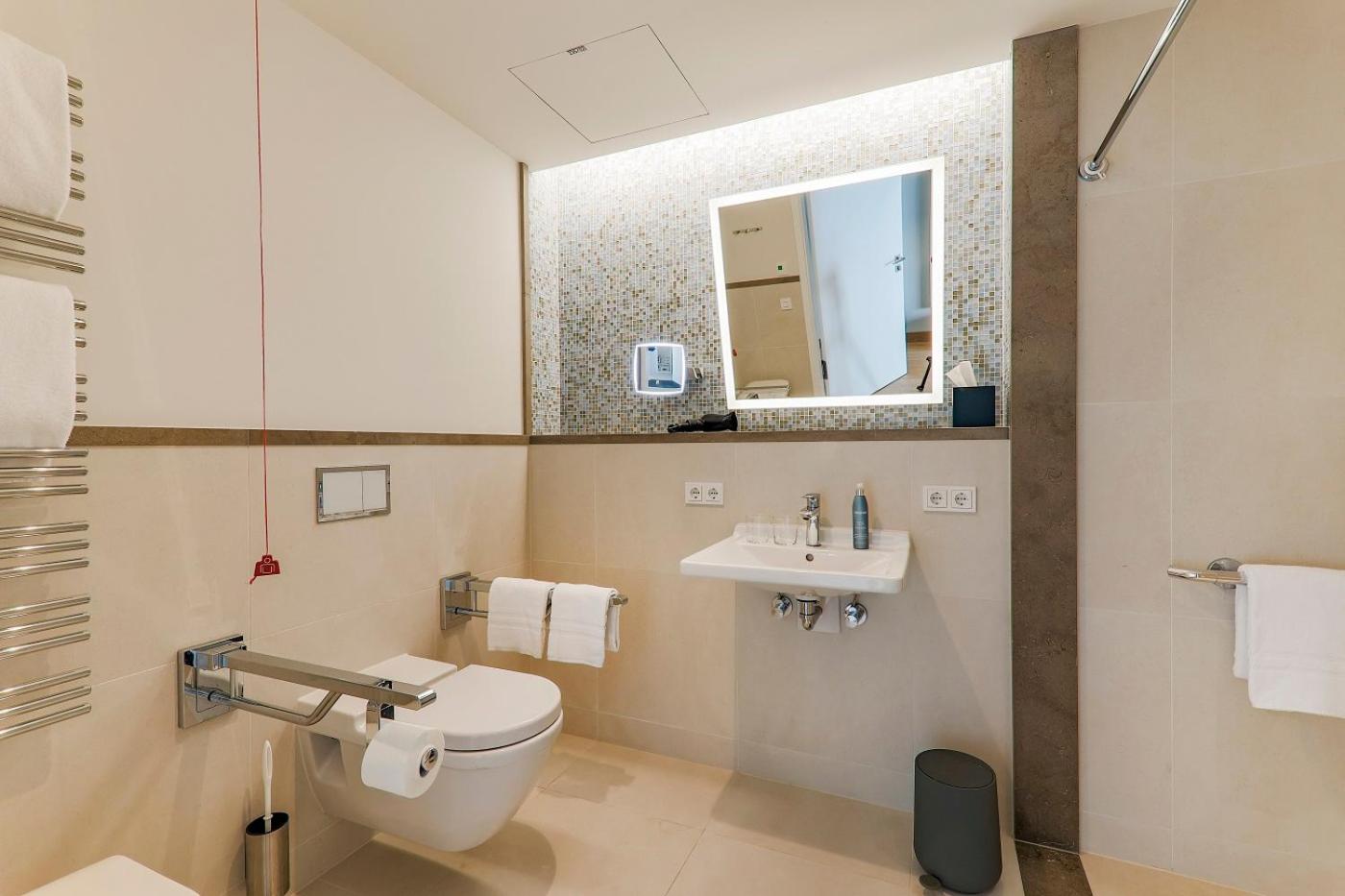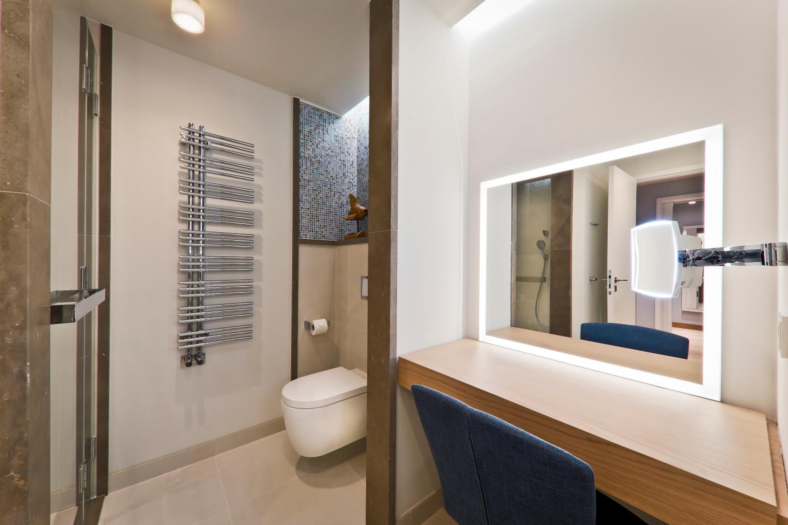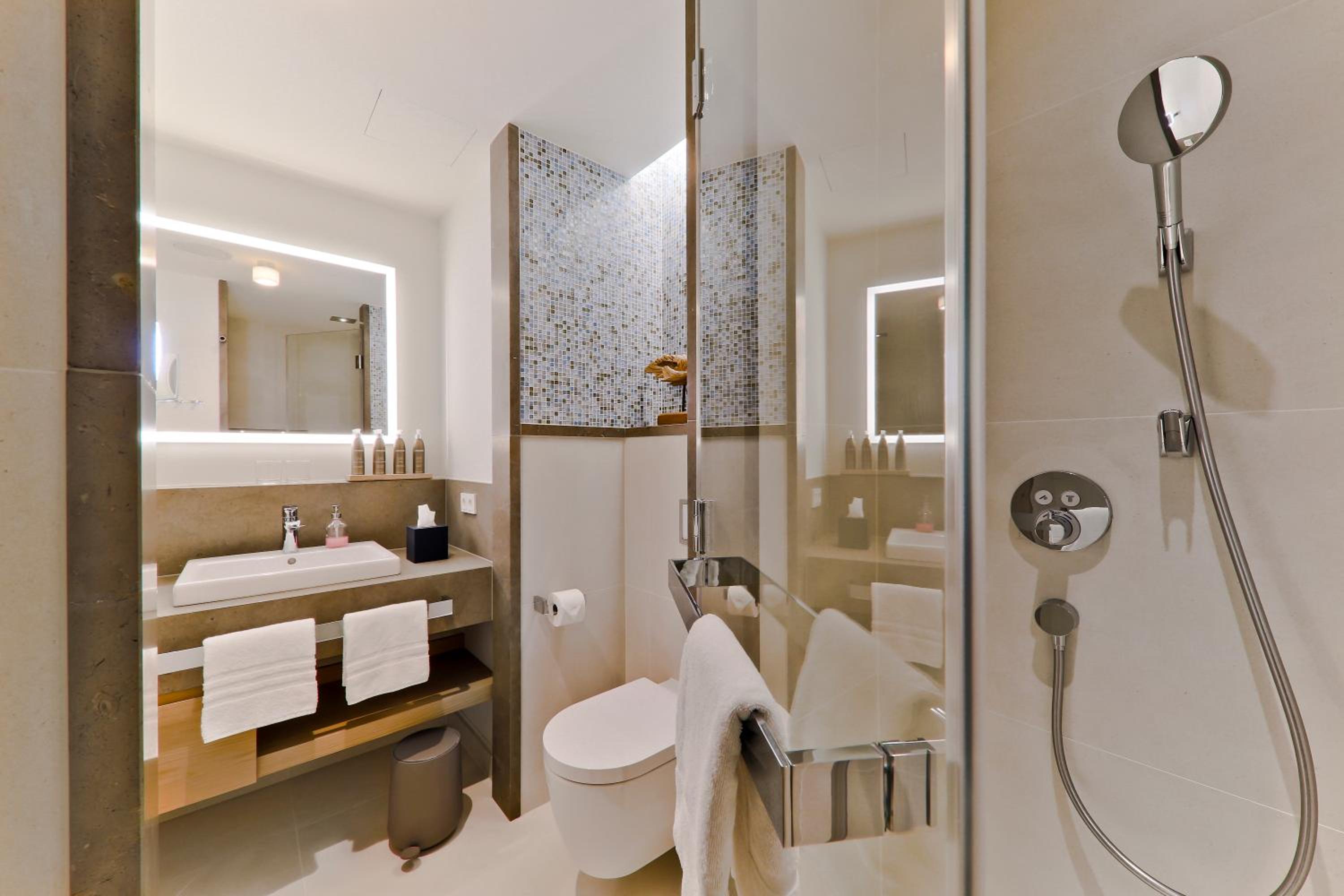 Die Ausstattung des Bades im Zimmer war leider nicht besonders durchdacht: Regendusche ist eher ein Platzregen der das komplette Bad unter Wasser setzt, der andere Duschkopf hängt viel zu niedrig und ist leider nicht höhenverstellbar . Die Badewanne ist ungewöhnlich hoch und macht somit den Ausstieg extrem schwierig da zudem eine Haltemöglichkeit fehlt . Aber der absolute Hammer ist der Föhn!! Ein Billigmodell und zu allem Überfluss auch noch in einer Schublade befestigt sodass ein föhnen vor dem Spiegel unmöglich ist - ein No Go in einem Hotel dieser Kategorie