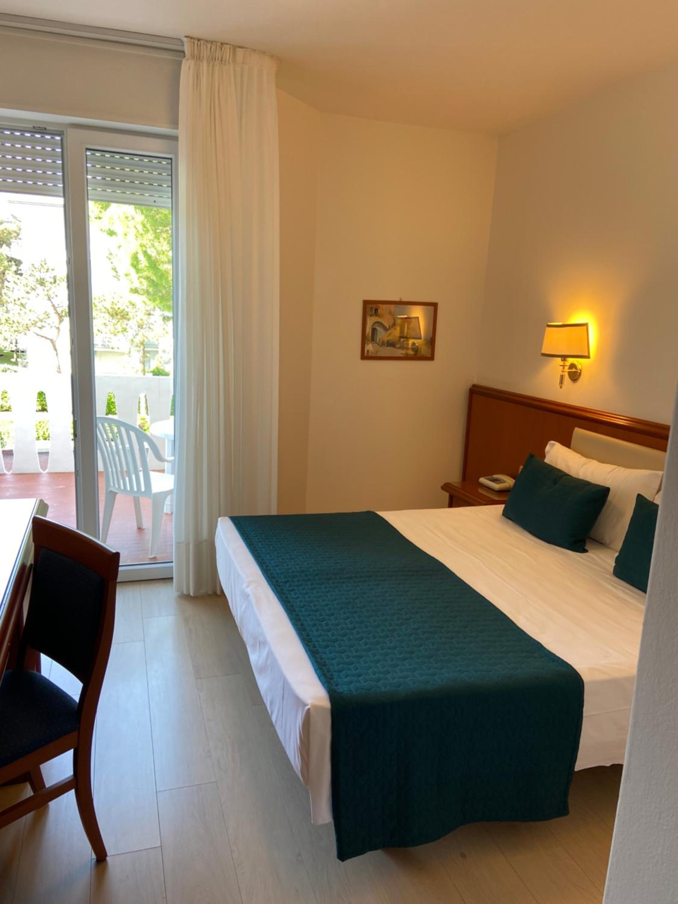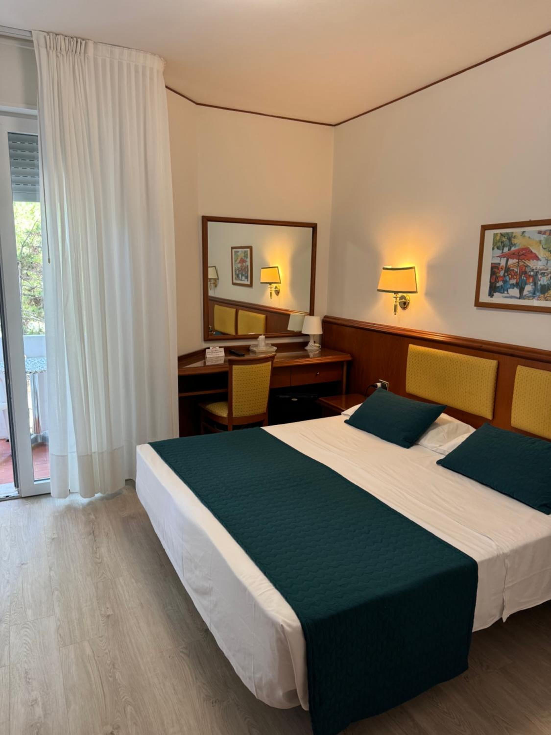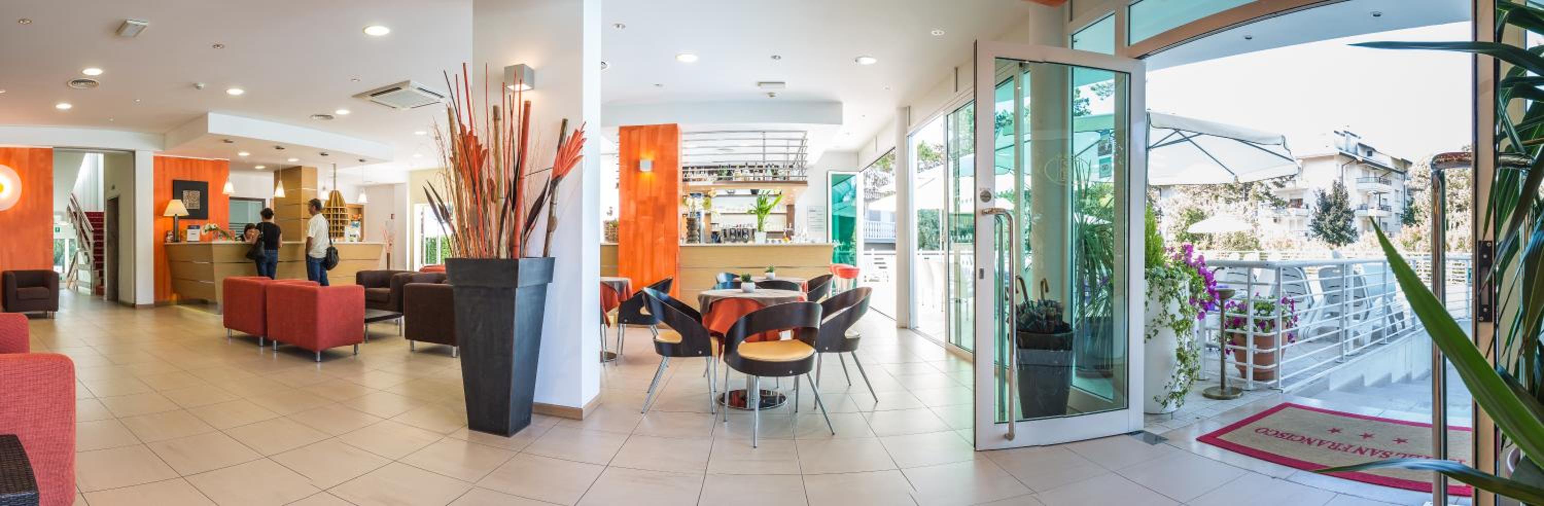 Hotel San Francisco, nestled in a serene green area near Lignano Pineta's private beach, offers spacious rooms with balconies and modern amenities like air conditioning and satellite TV.