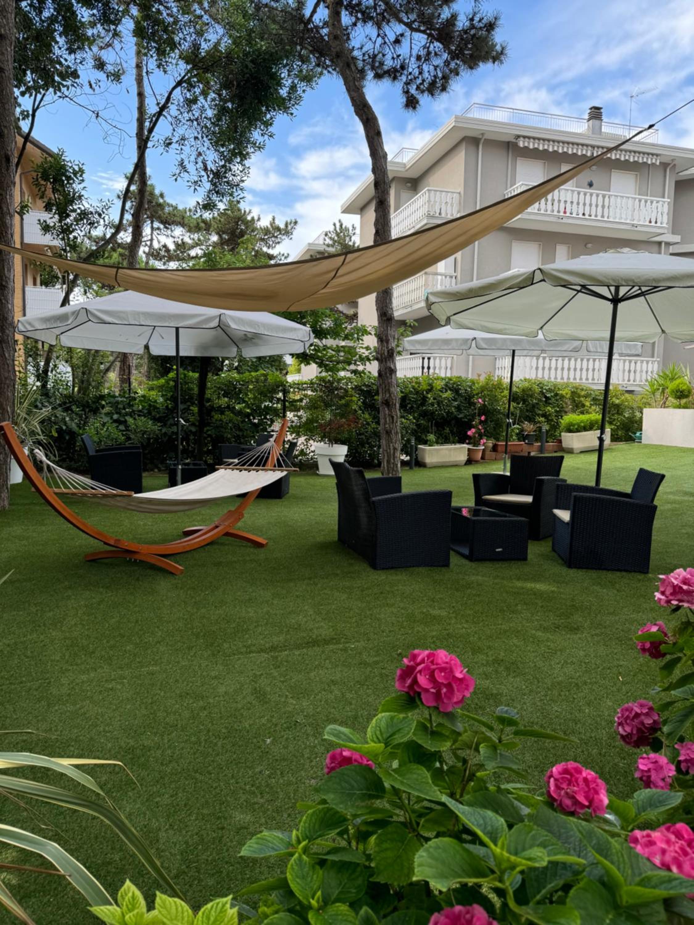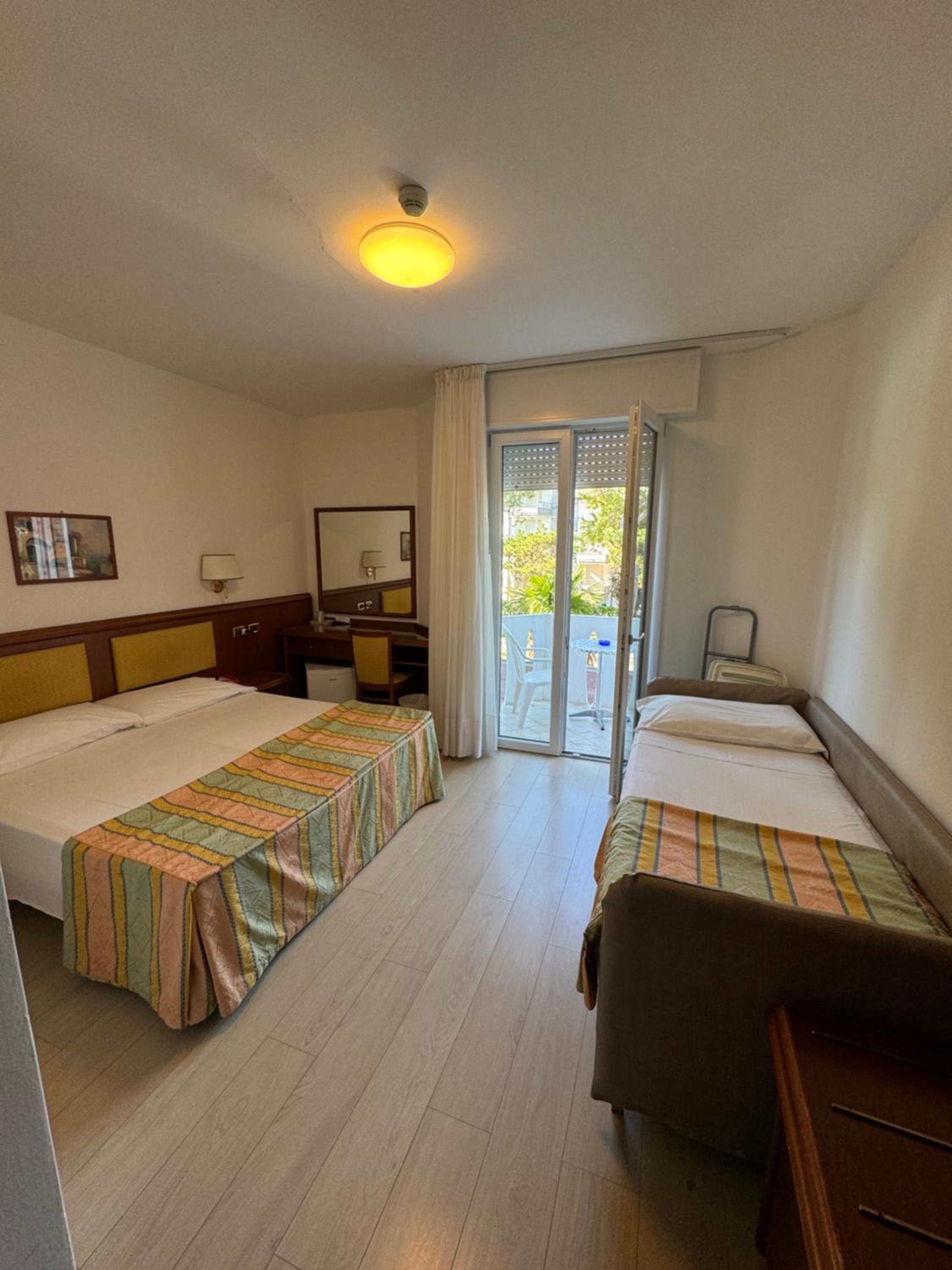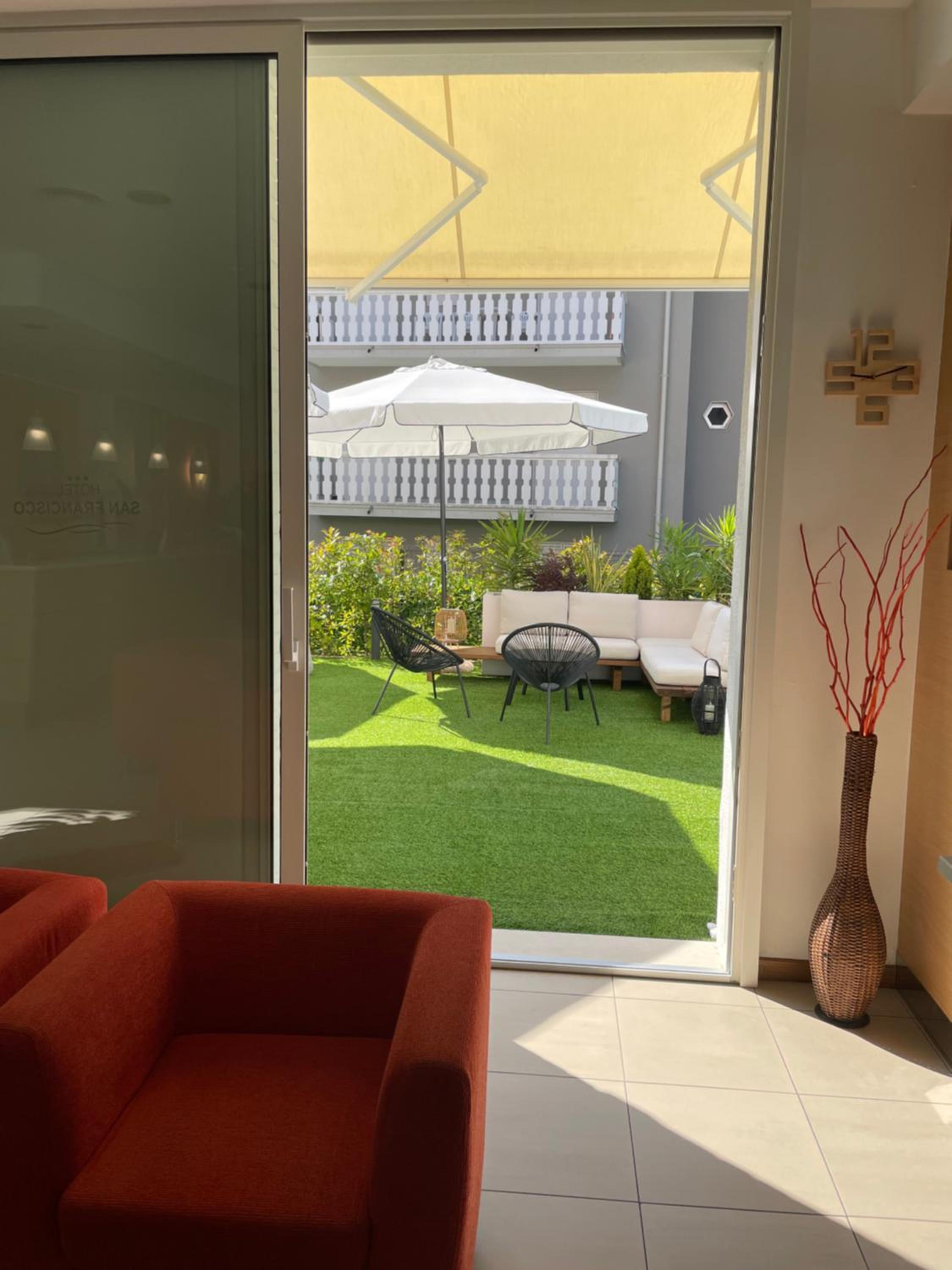 Hotel San Francisco, nestled in a serene green area near Lignano Pineta's private beach, offers spacious rooms with balconies and modern amenities like air conditioning and satellite TV.