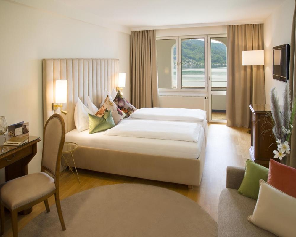 The hotel's elegant rooms are thoughtfully designed with wooden floors, satellite TV, a minibar, and modern bathrooms complete with a hairdryer. Most rooms also feature a private balcony overlooking the picturesque lake, providing a serene setting to unwind.