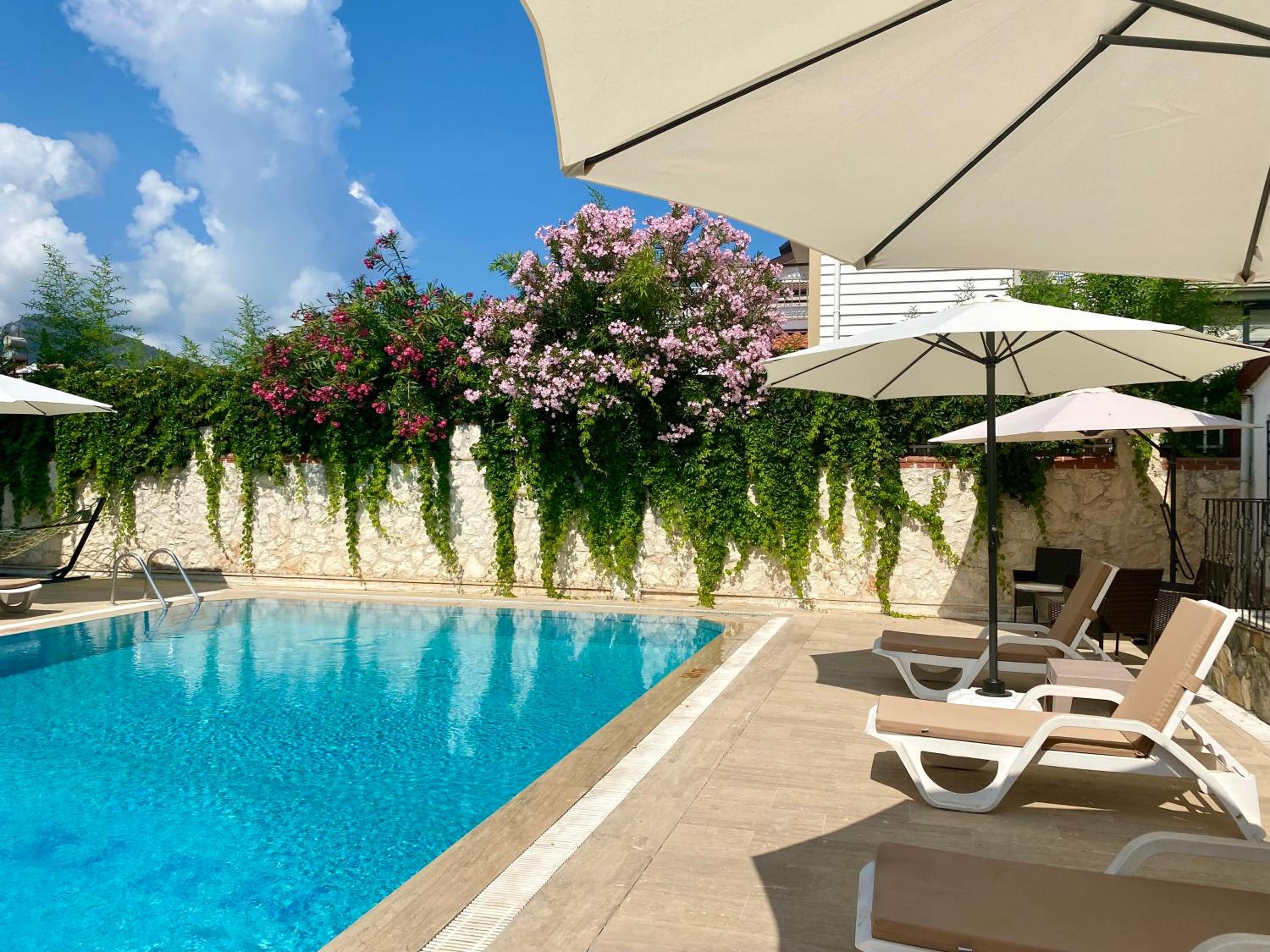 Outdoor Swimming Pool and Garden: Enjoy the sunny weather in Fethiye at Cam Hotel's seasonal outdoor swimming pool and lush garden.