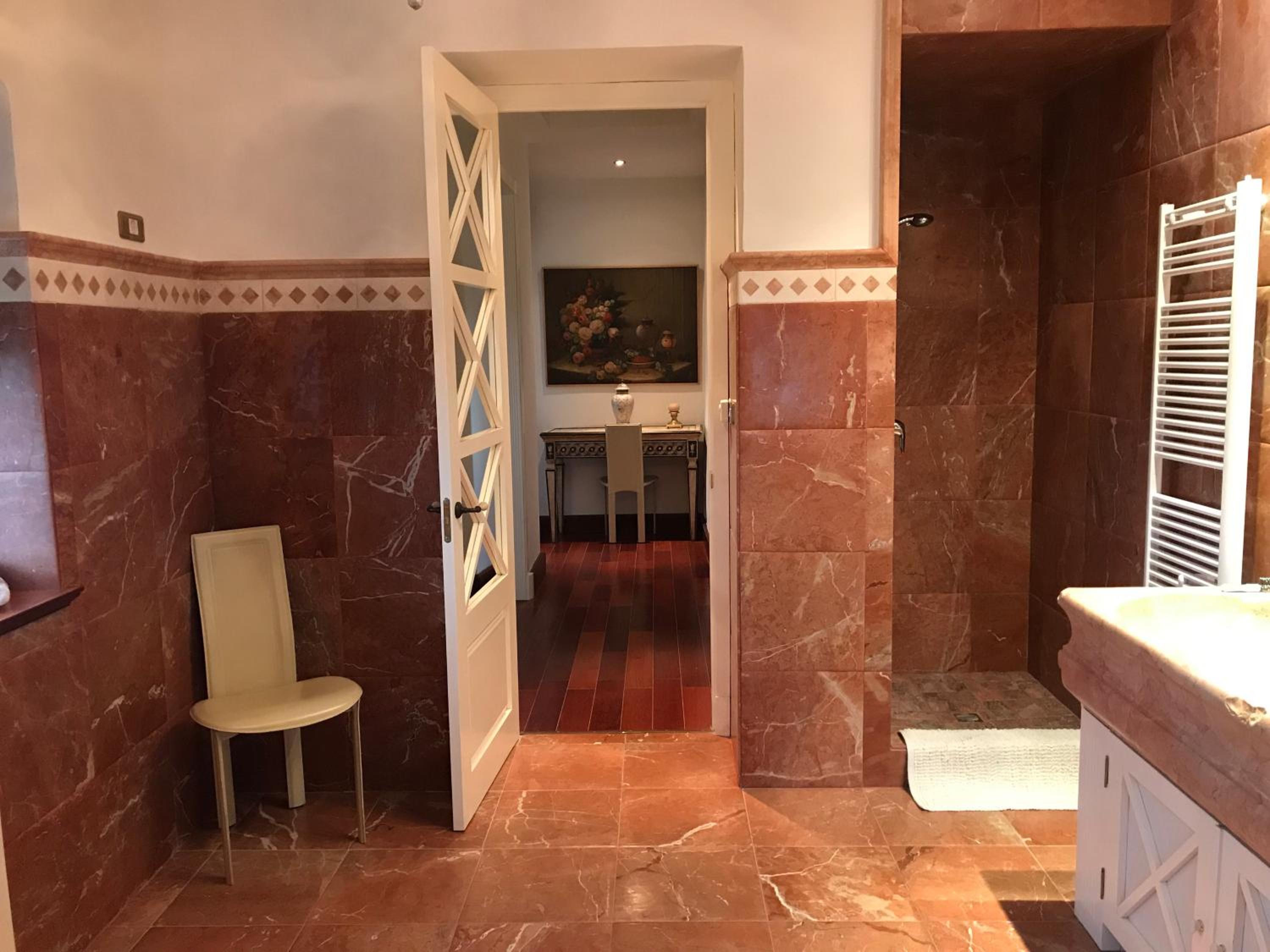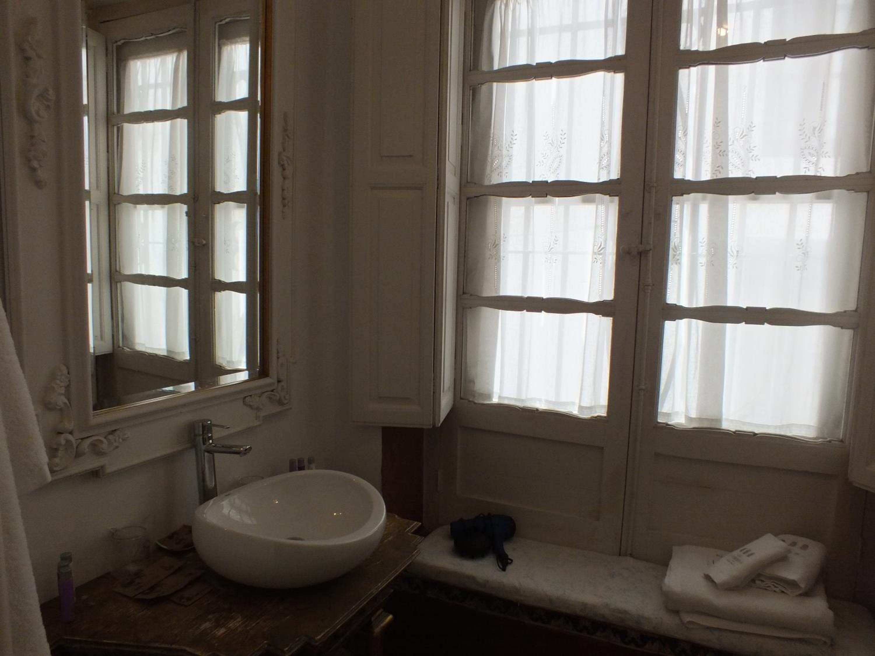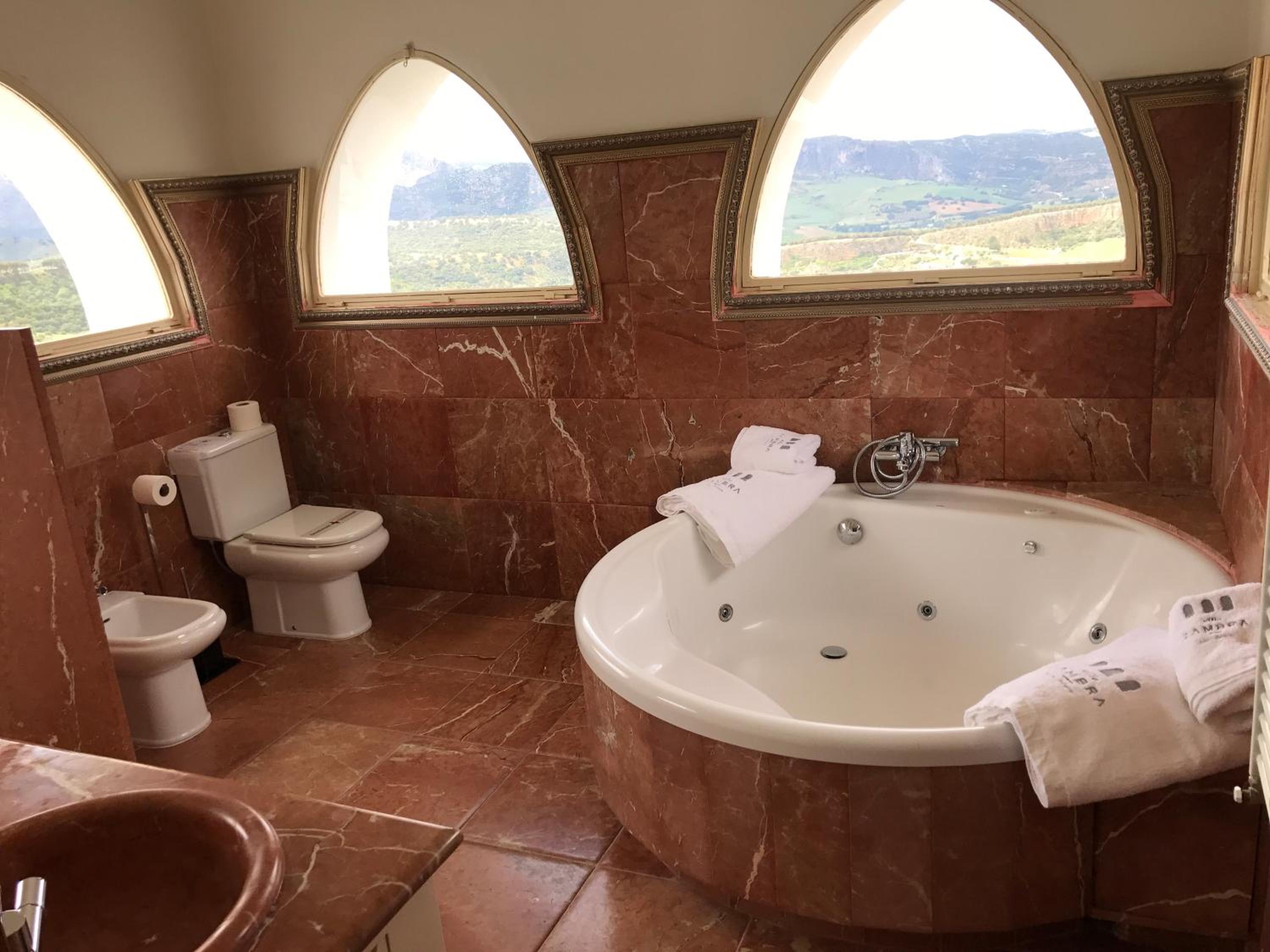Double room with hydromassage bathtub has stairs to access the panoramic bathroom. This bathroom has panoramic views but you can't see the bridge
