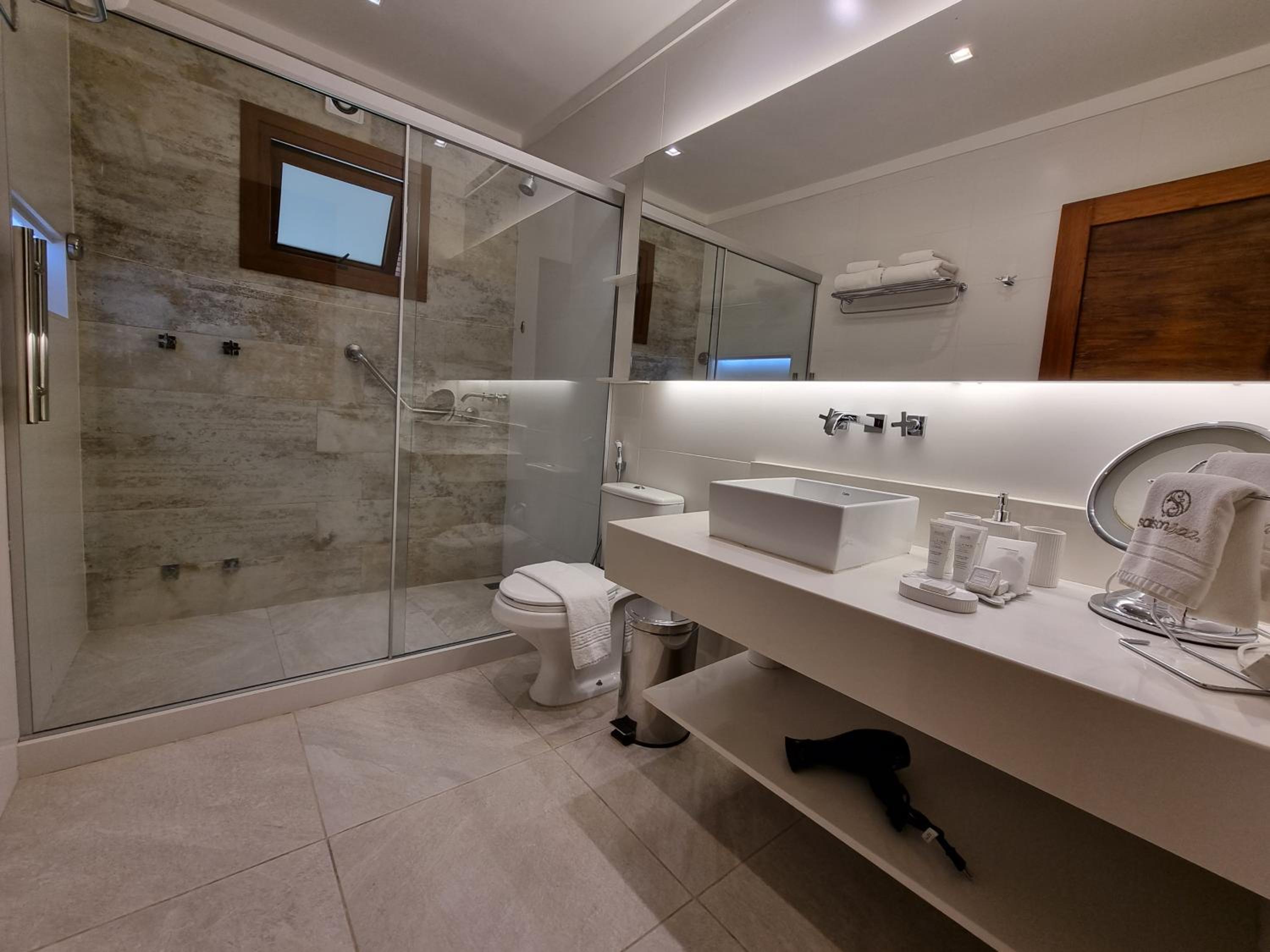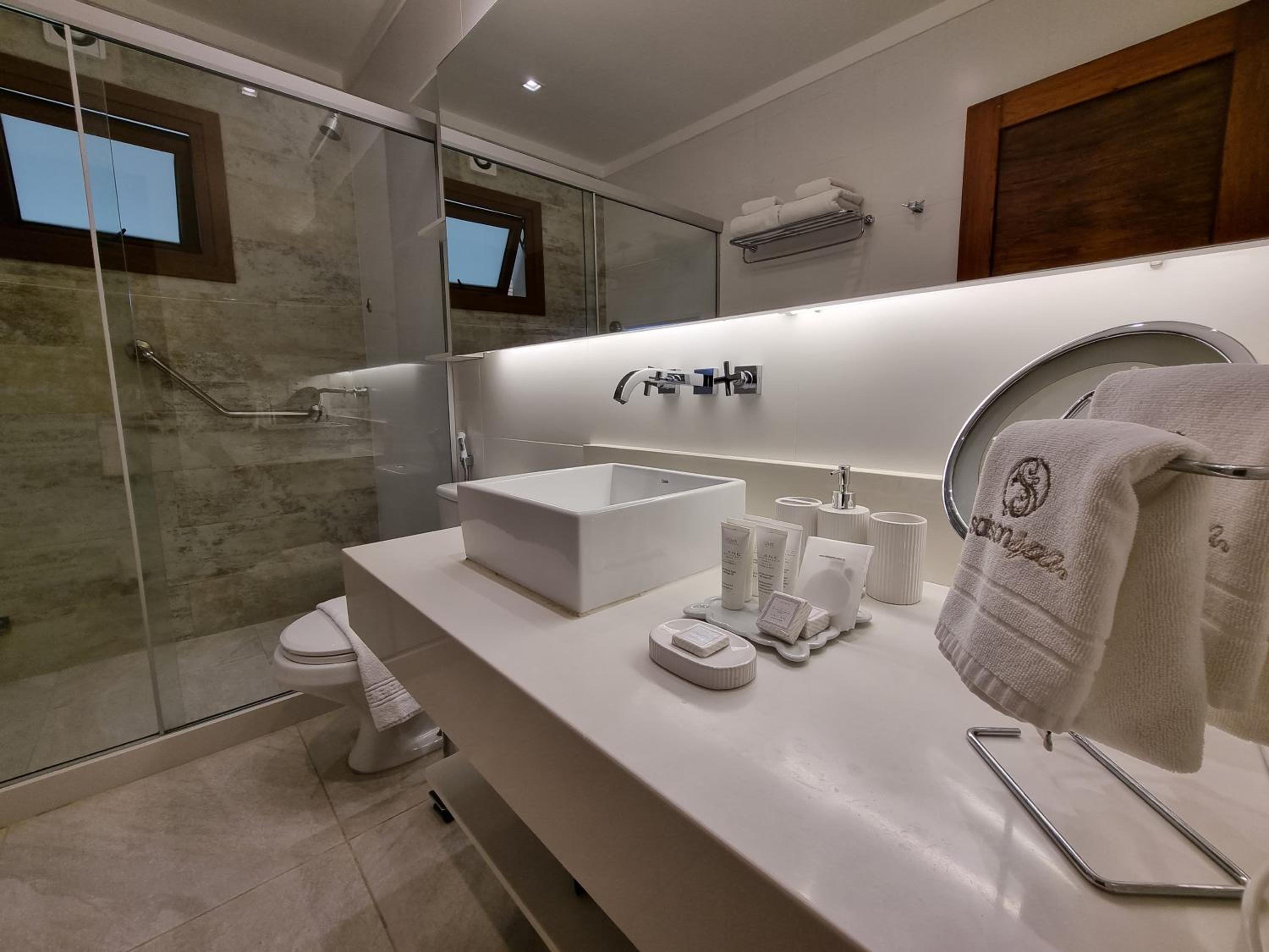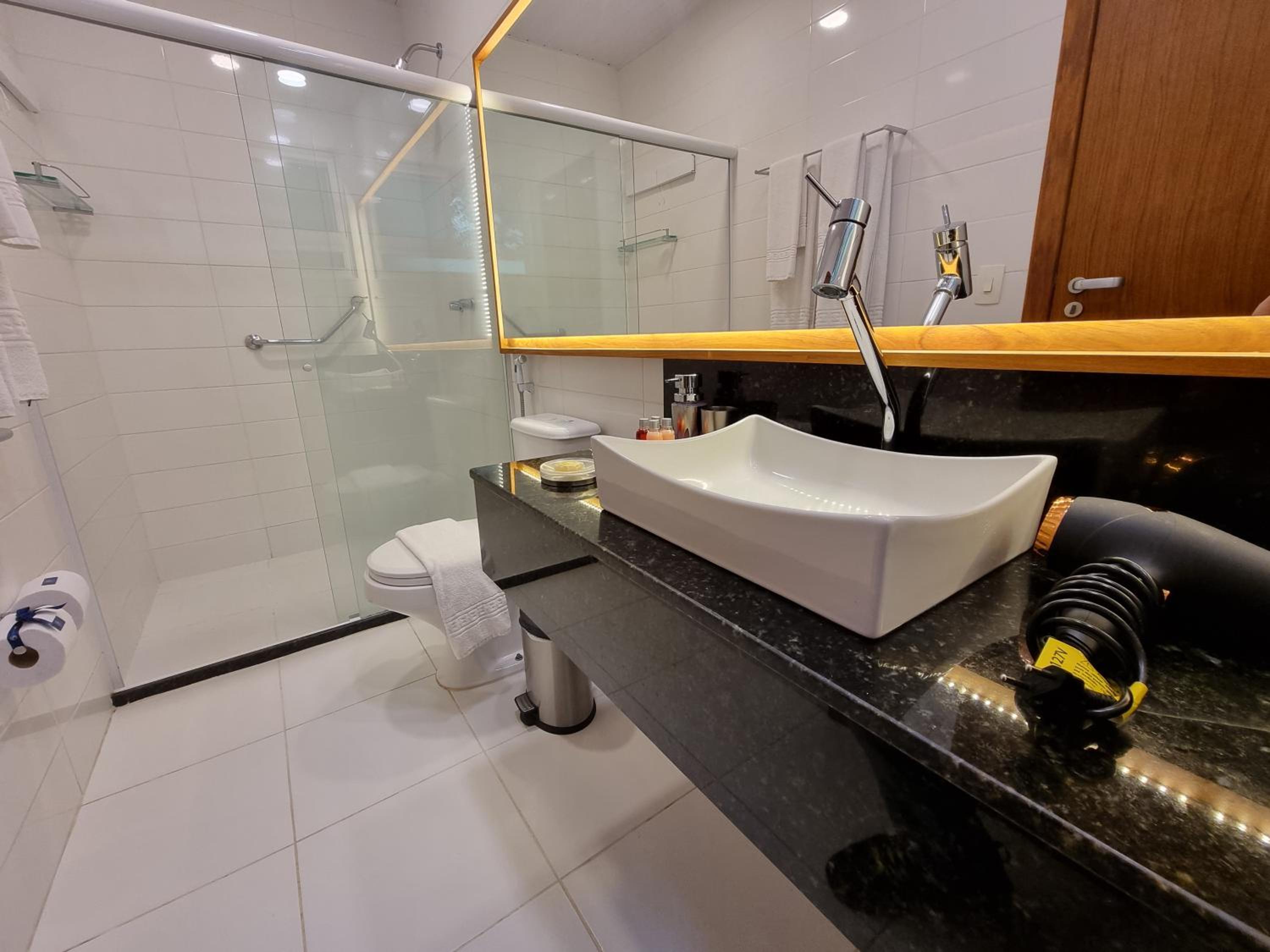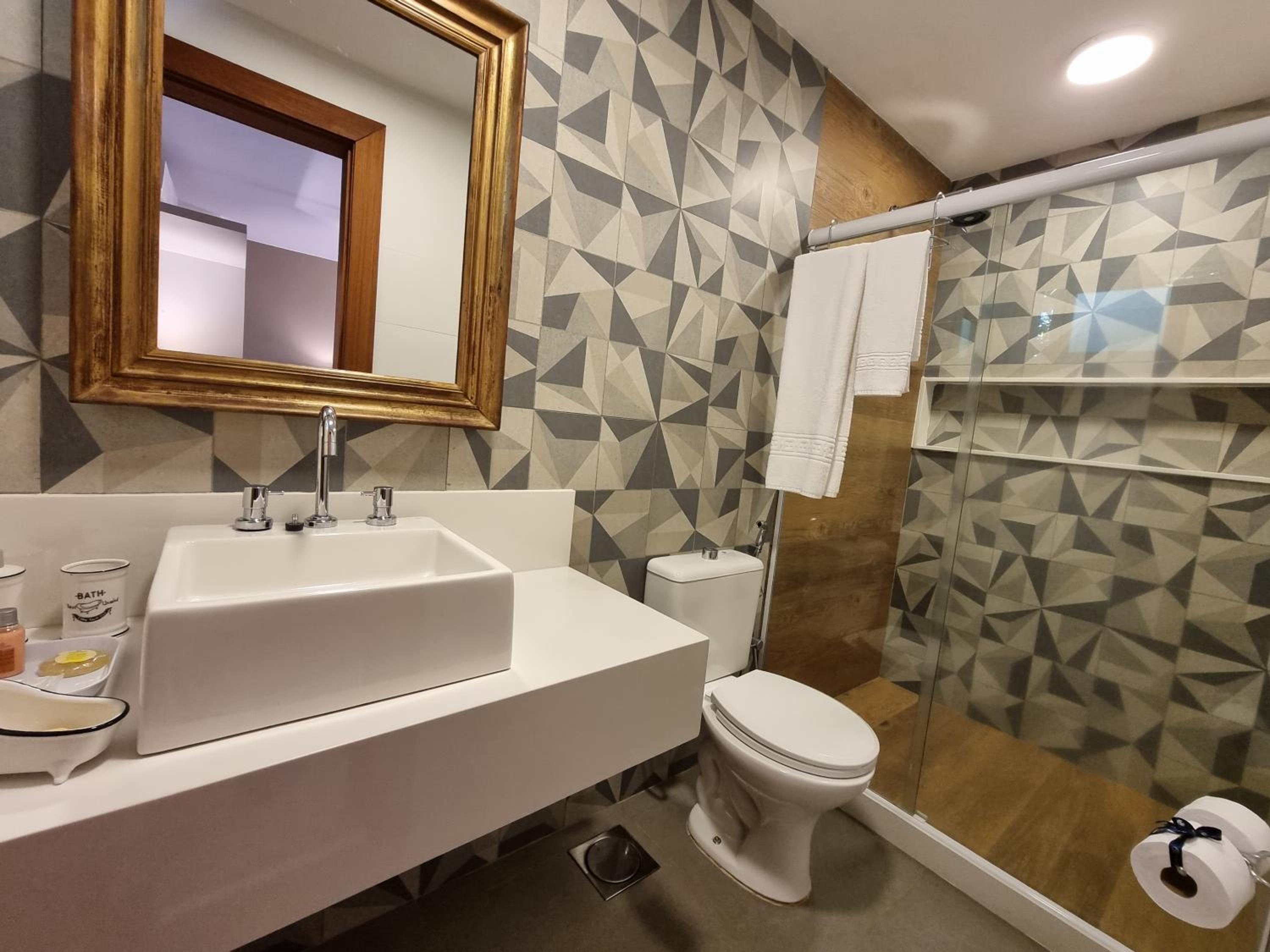 Embora a janela tenha veneziana, não foi suficiente para deixar o quarto bem escuro pela manhã — um blackout faria bastante diferença. No banheiro, senti falta de uma prateleirinha dentro do box para apoiar os produtos de higiene.