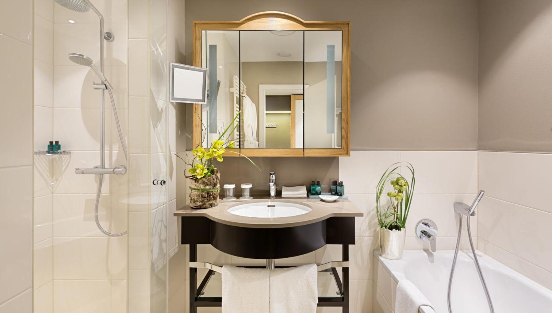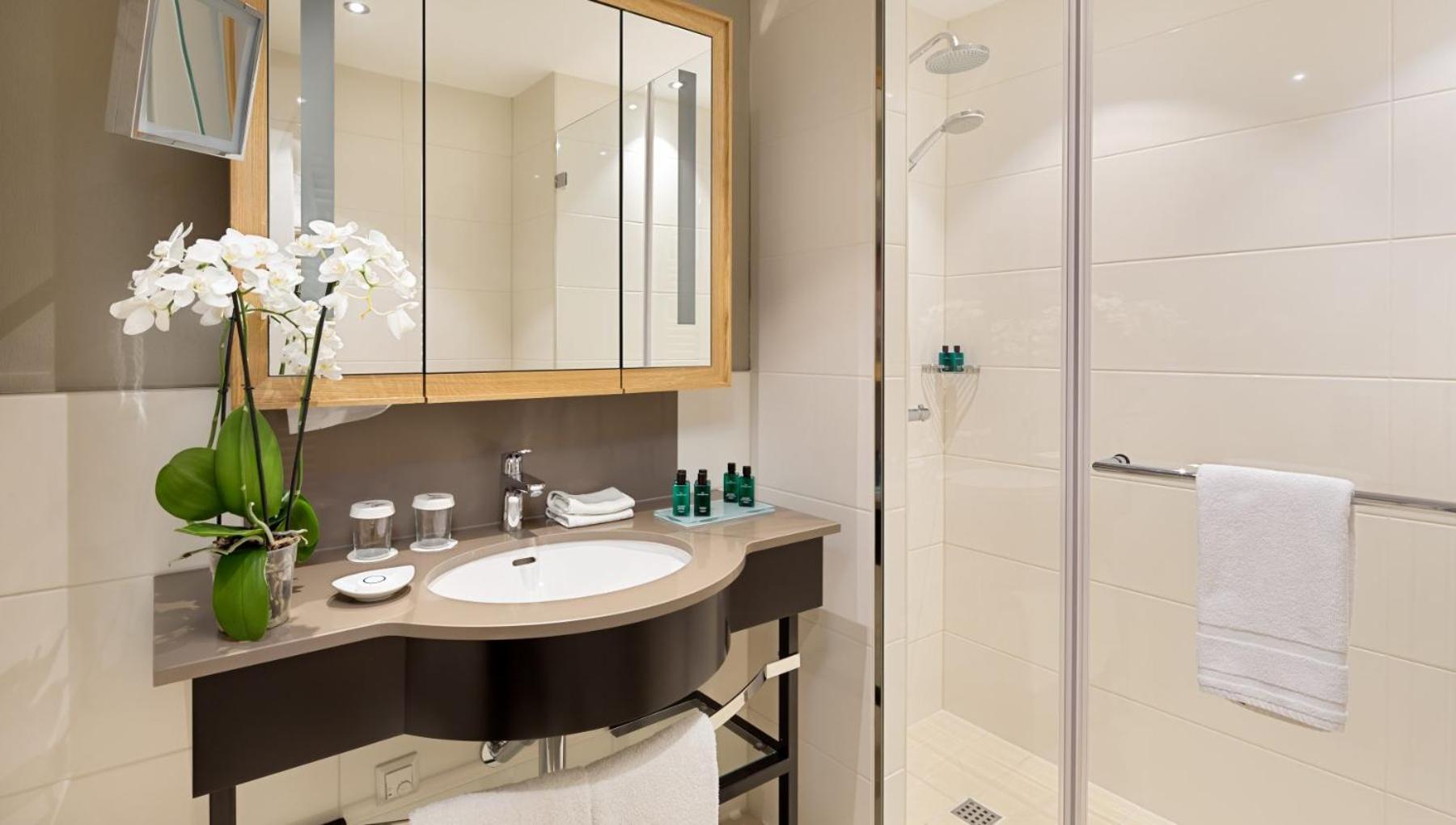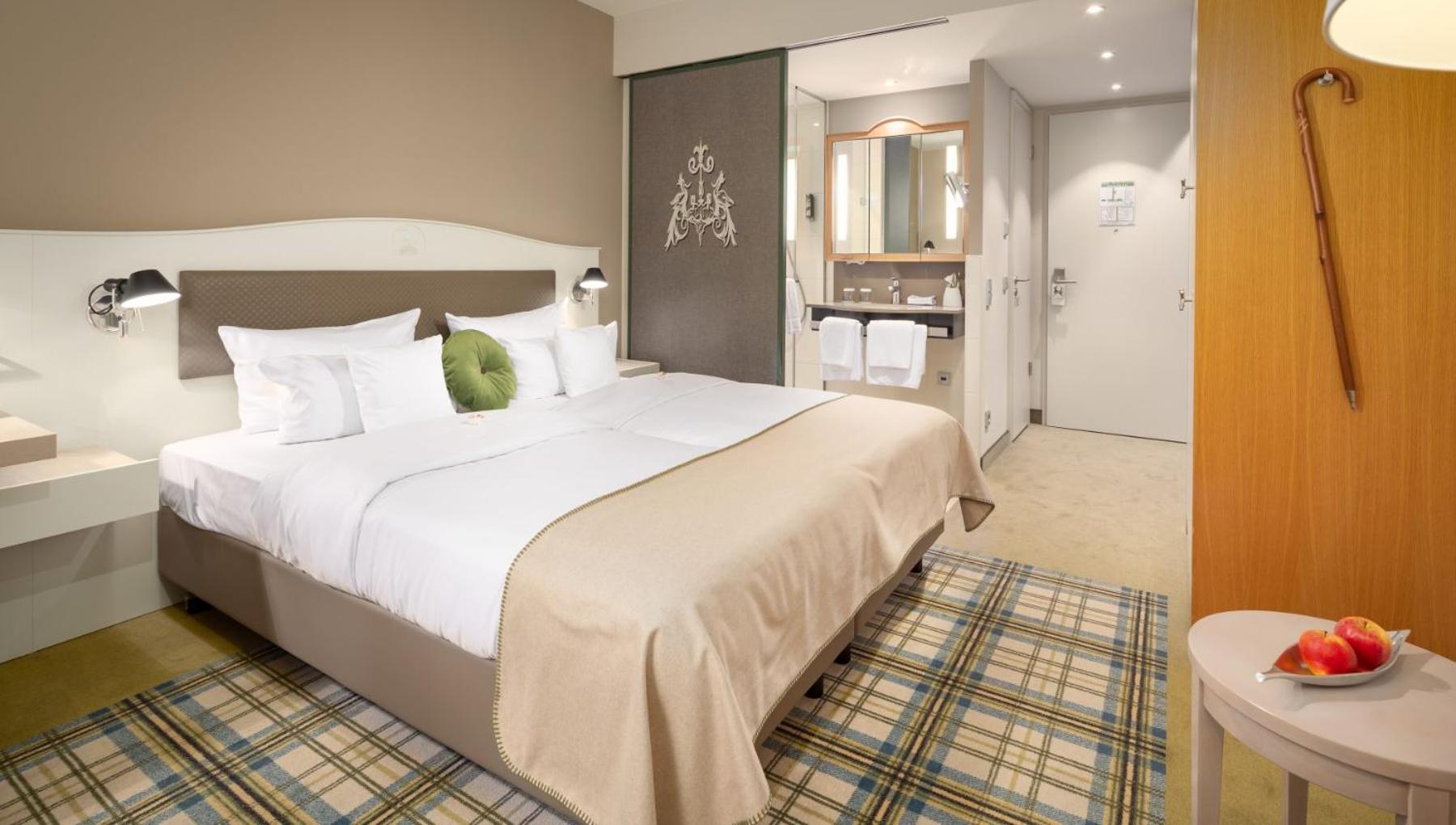 Sehr gutes Restaurant, exquisites Essen, sehr freundliches Personal, ruhige Lage, schöner Park, umfangreiches Frühstück, gut ausgestatteter Fitnessraum, im Zimmer Bad und WC getrennt