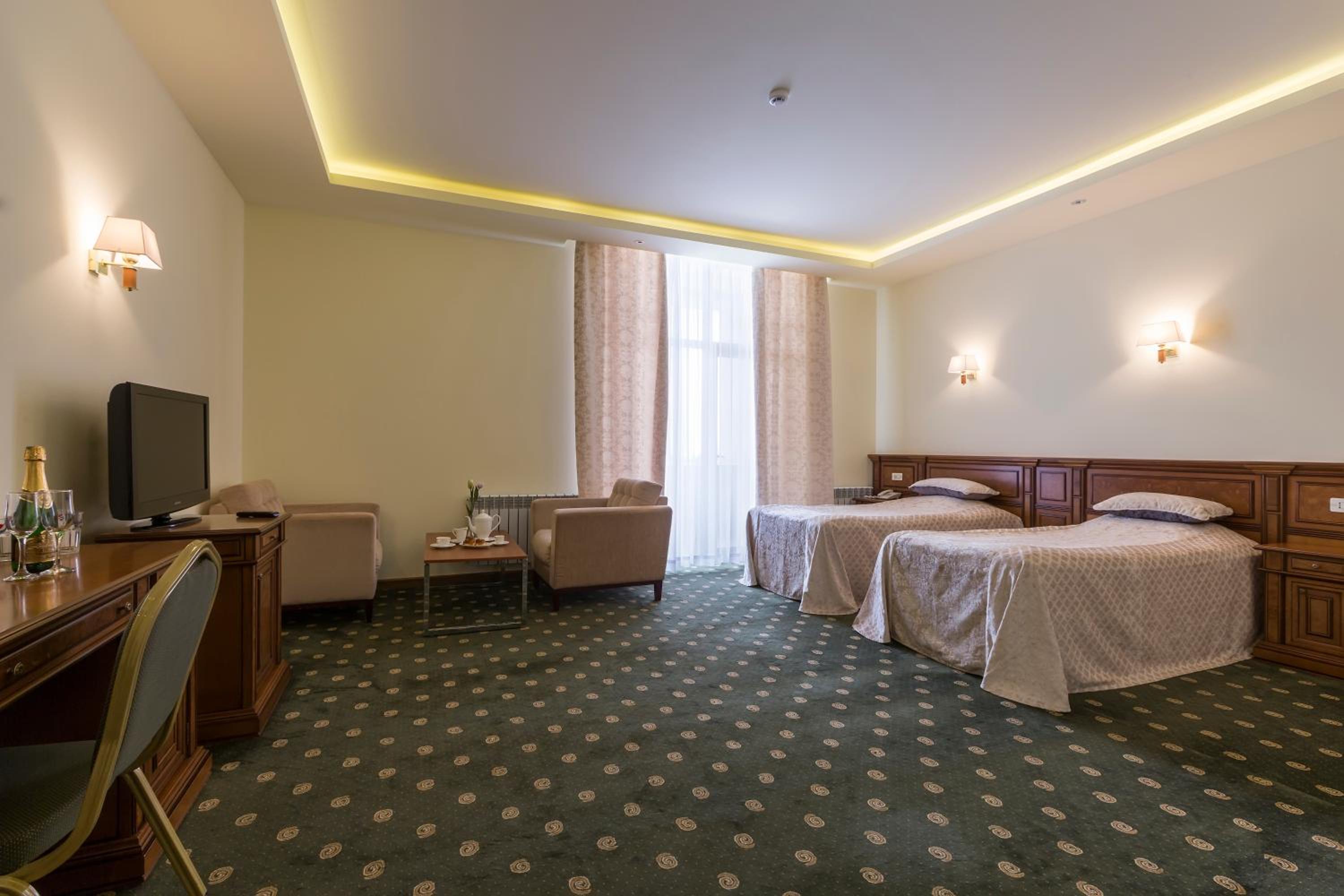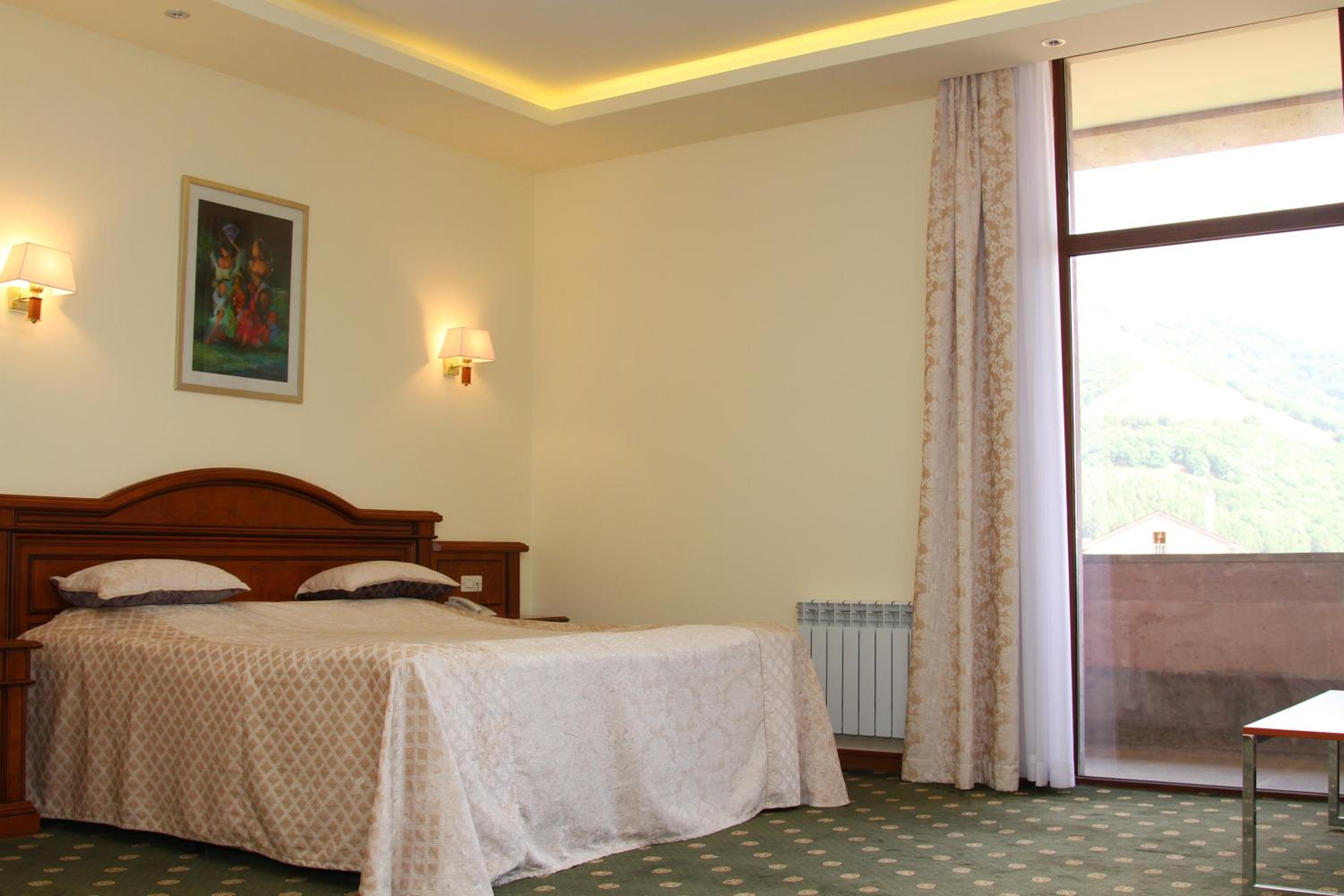 Armenia Hotel in Jermuk offers elegantly designed rooms equipped with modern amenities like flat-screen TVs, cozy bed linens, and private bathrooms. Guests can enjoy the convenience of a fridge in each room for added comfort.