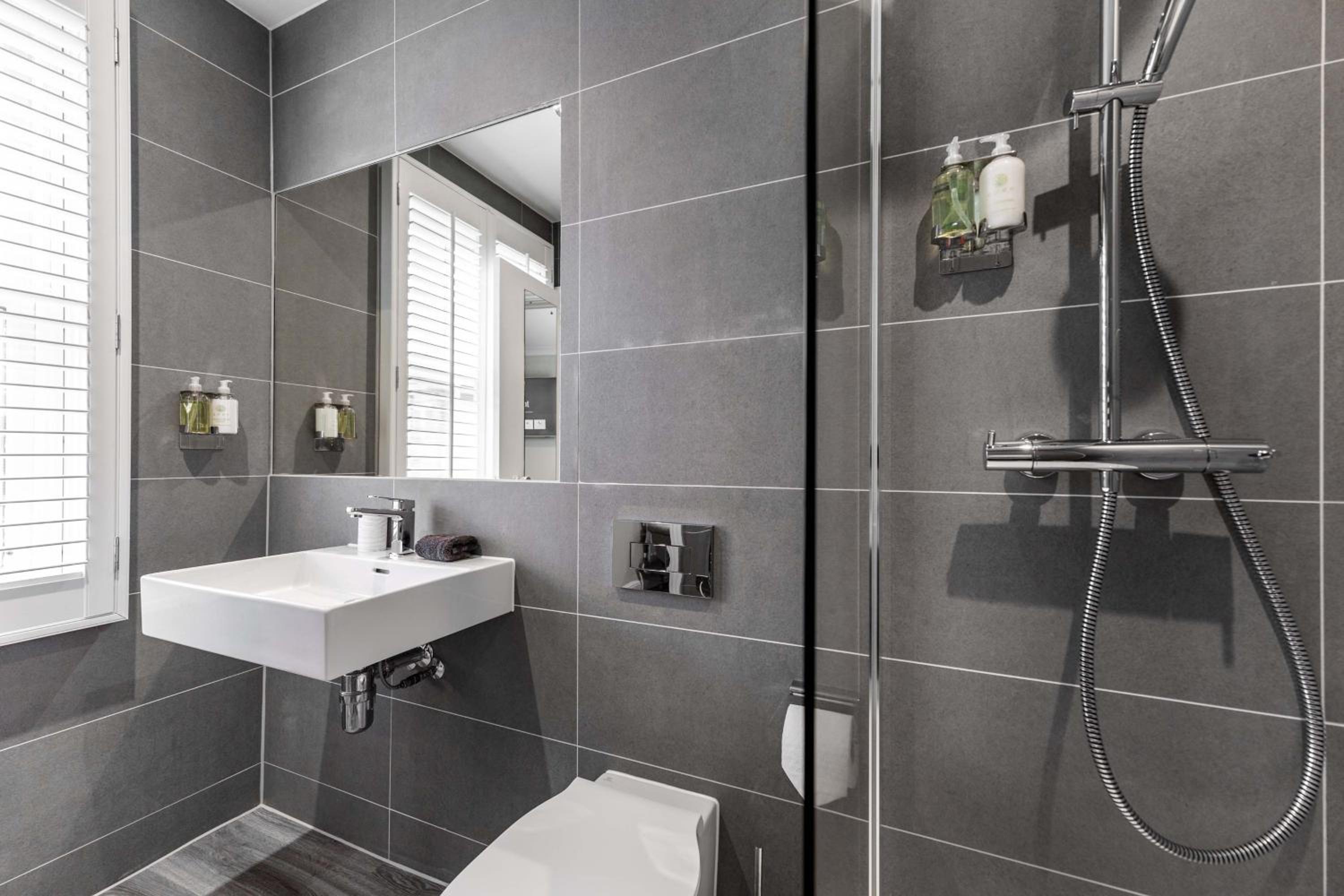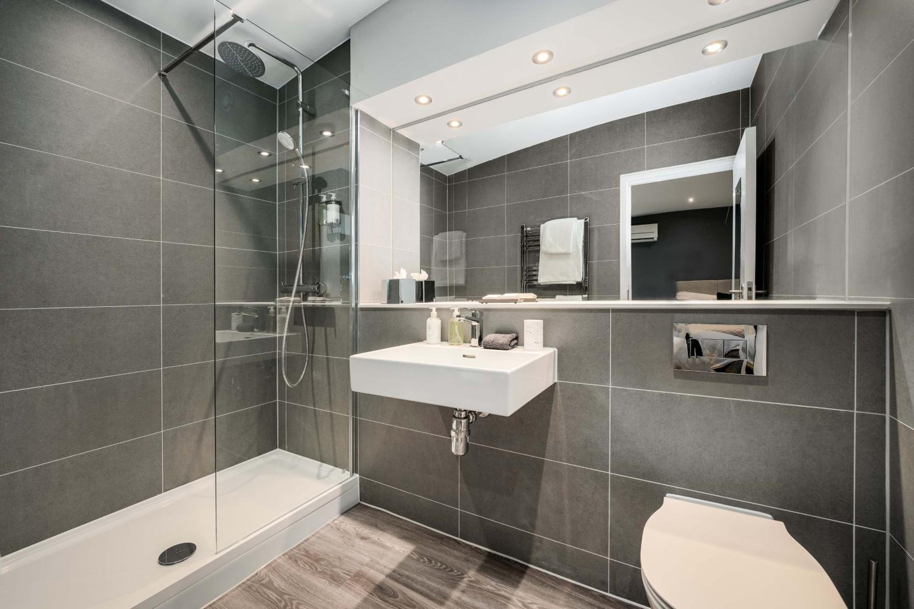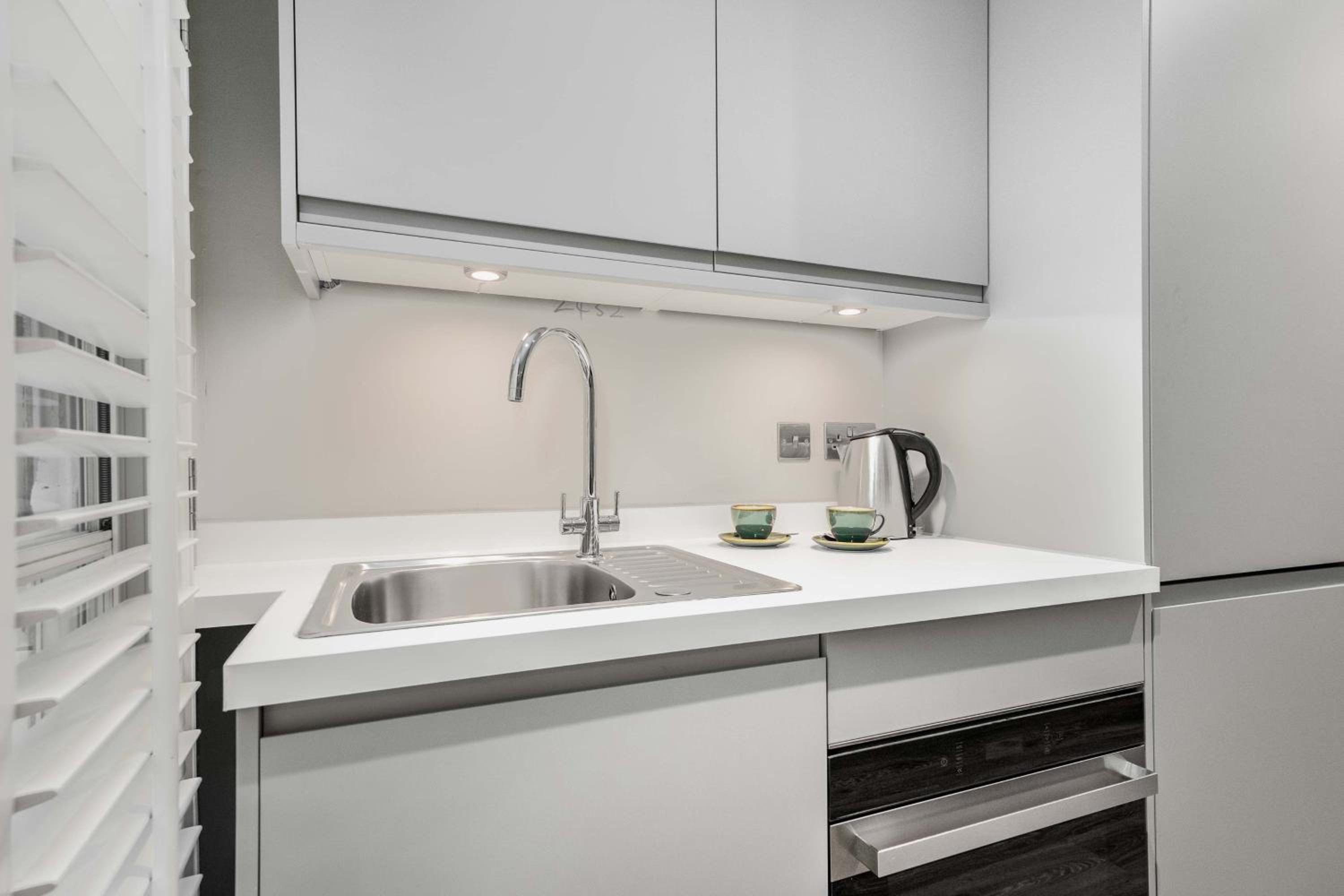 Enjoy the convenience of a sleek kitchenette with modern appliances, complimentary toiletries, WiFi access, and a rainfall showerhead for a relaxing experience.