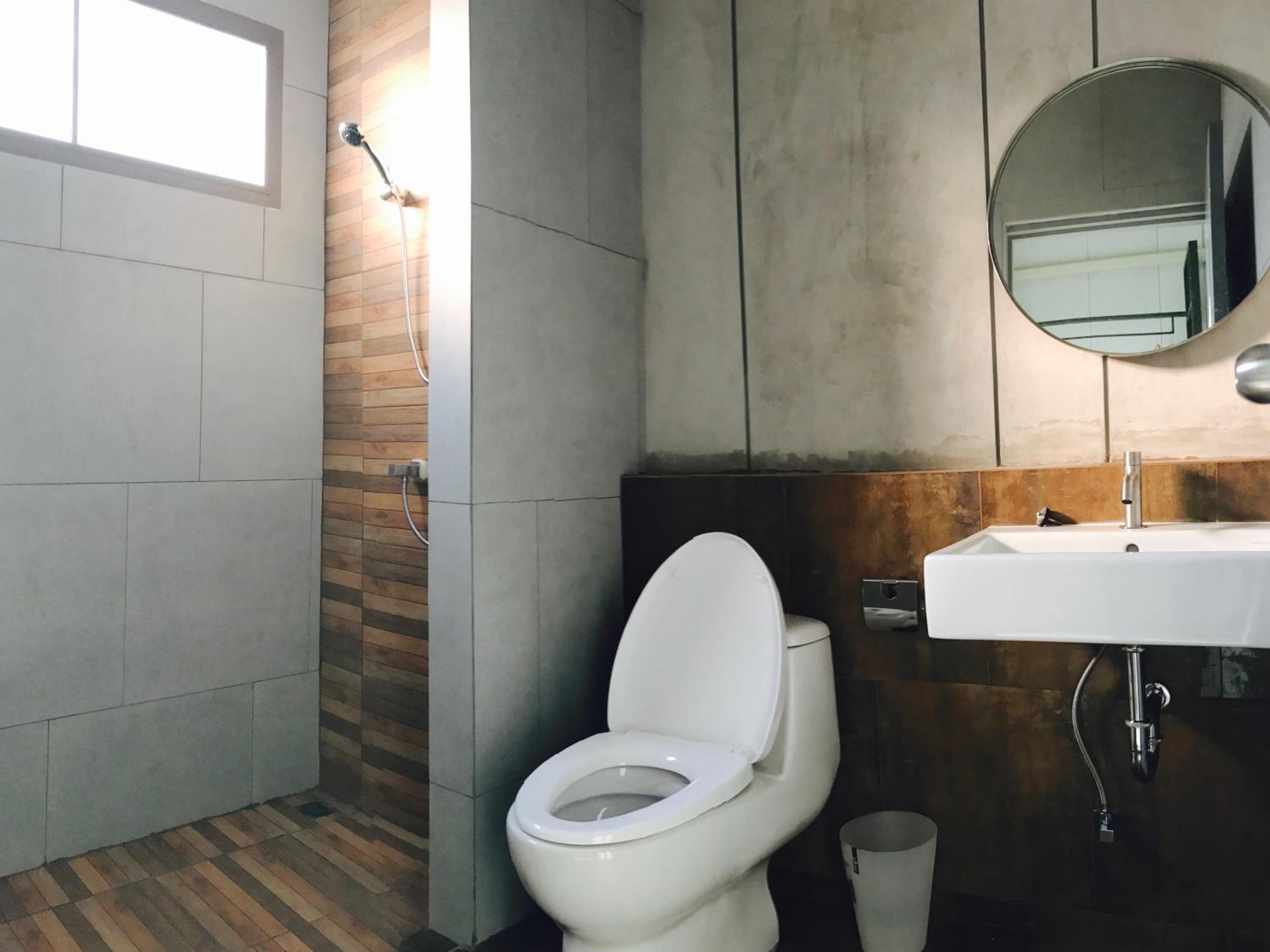 ในห้องน้ำ จัดชุดหมวก ไม่ครบ 2 ท่าน และควรหาภาาชนะวางให้เรียบร้อย เป็นหมวดหมู่ค่ะ ไม่ใช่วางหลังชักโครก