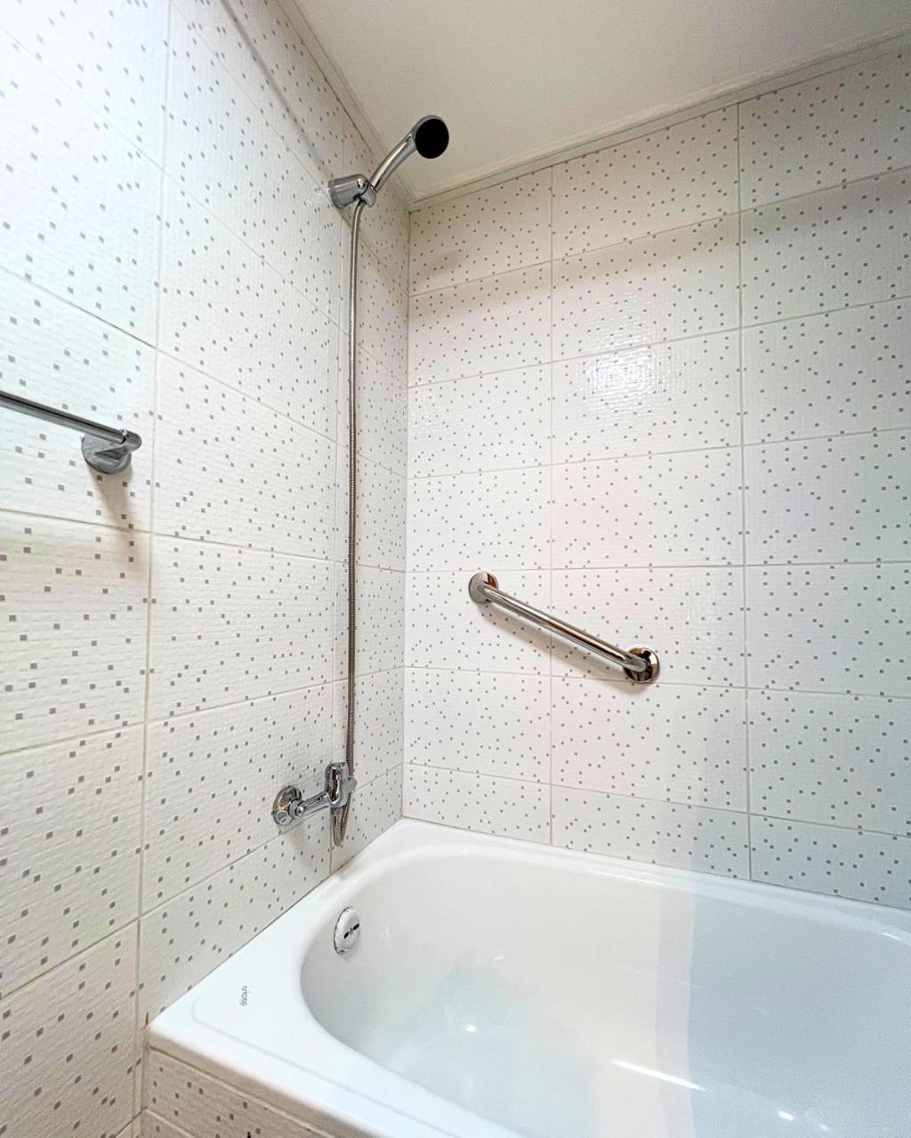 Chuveiro separado da banheira (risco de acidente).