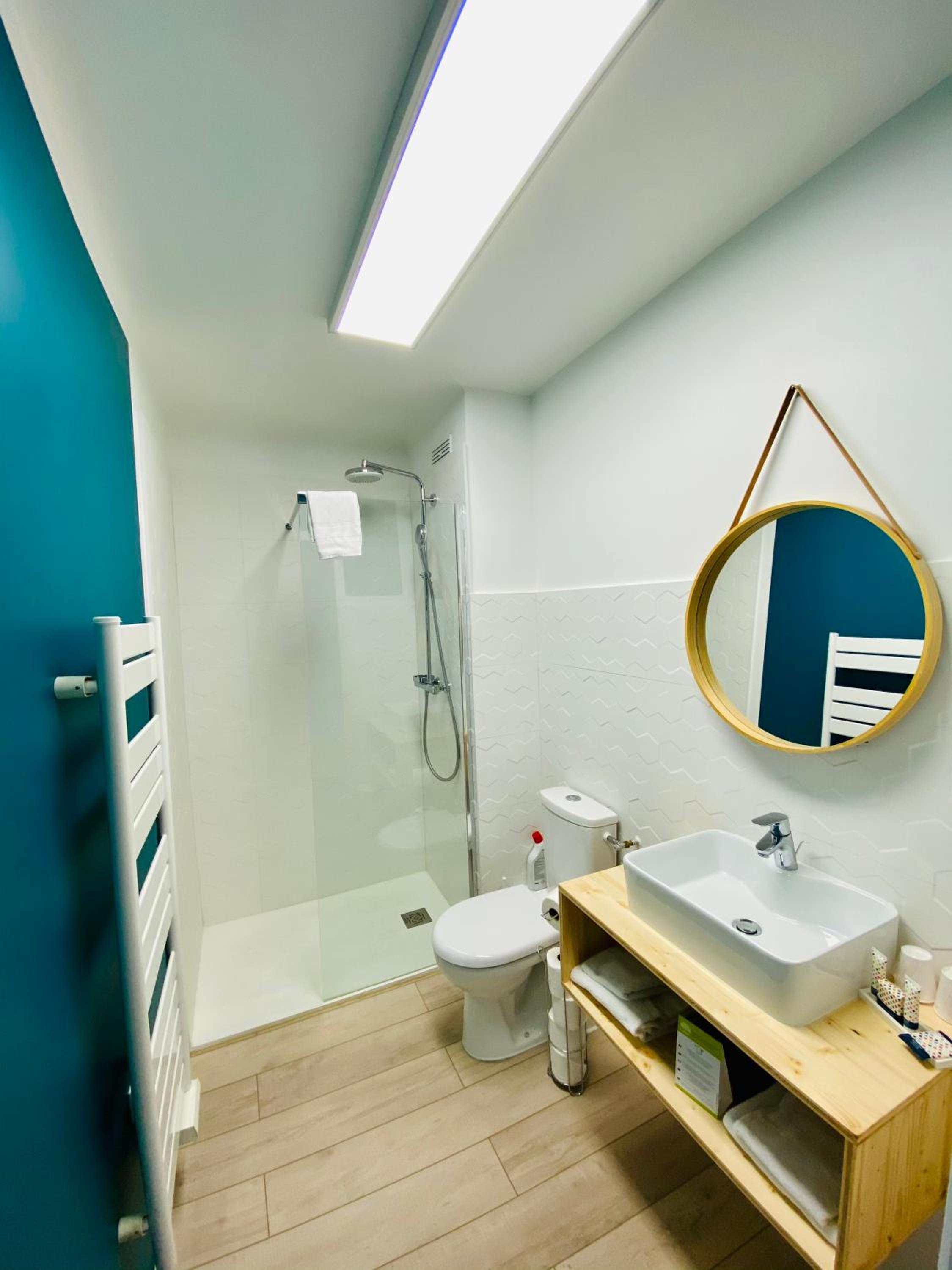 Chambre étroite et salle de bain non isolée du lit!