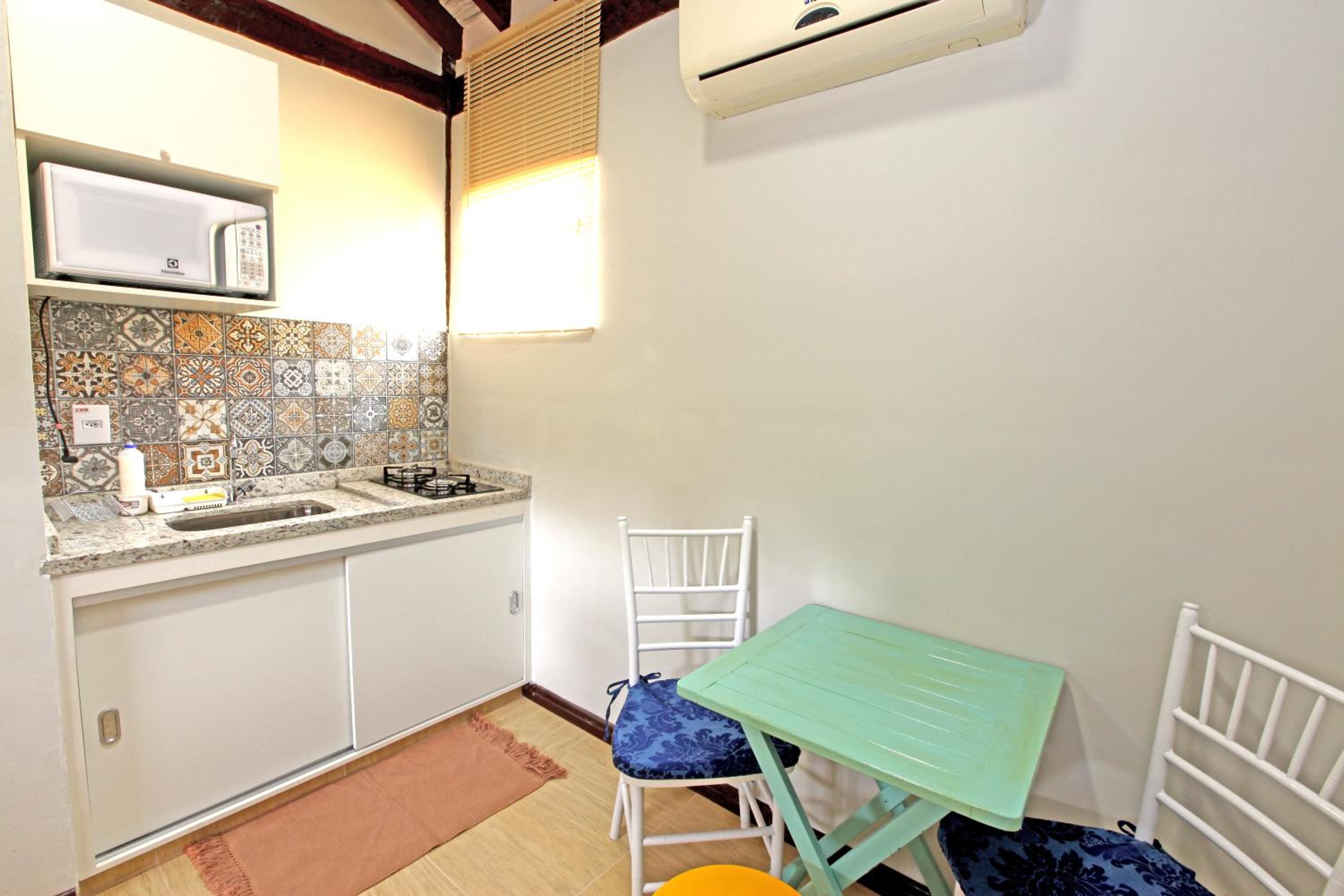 O quarto muito bom, com uma pequena cozinha com micro ondas e fogão. O necessário. Quarto bom tamanho e banheiro com chuveiro ótimo. Pega ado