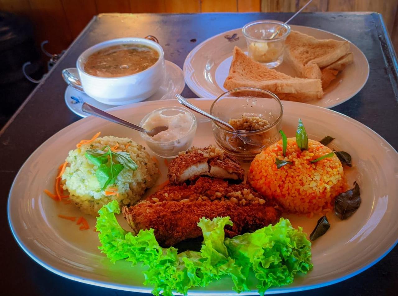 Breakfast was rich, self service. Once they clean the area around the hotel, put some extra plants, some benches, it will have a much better look.