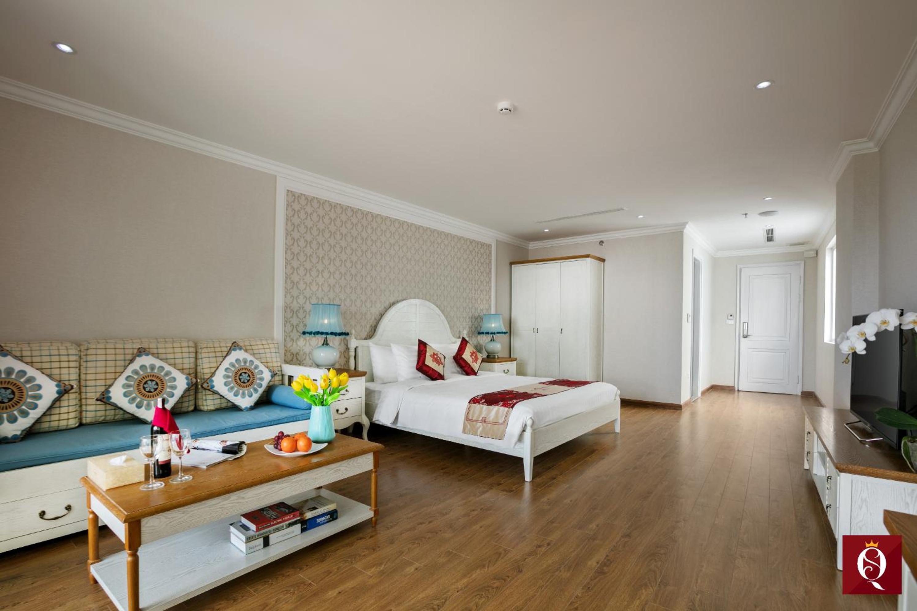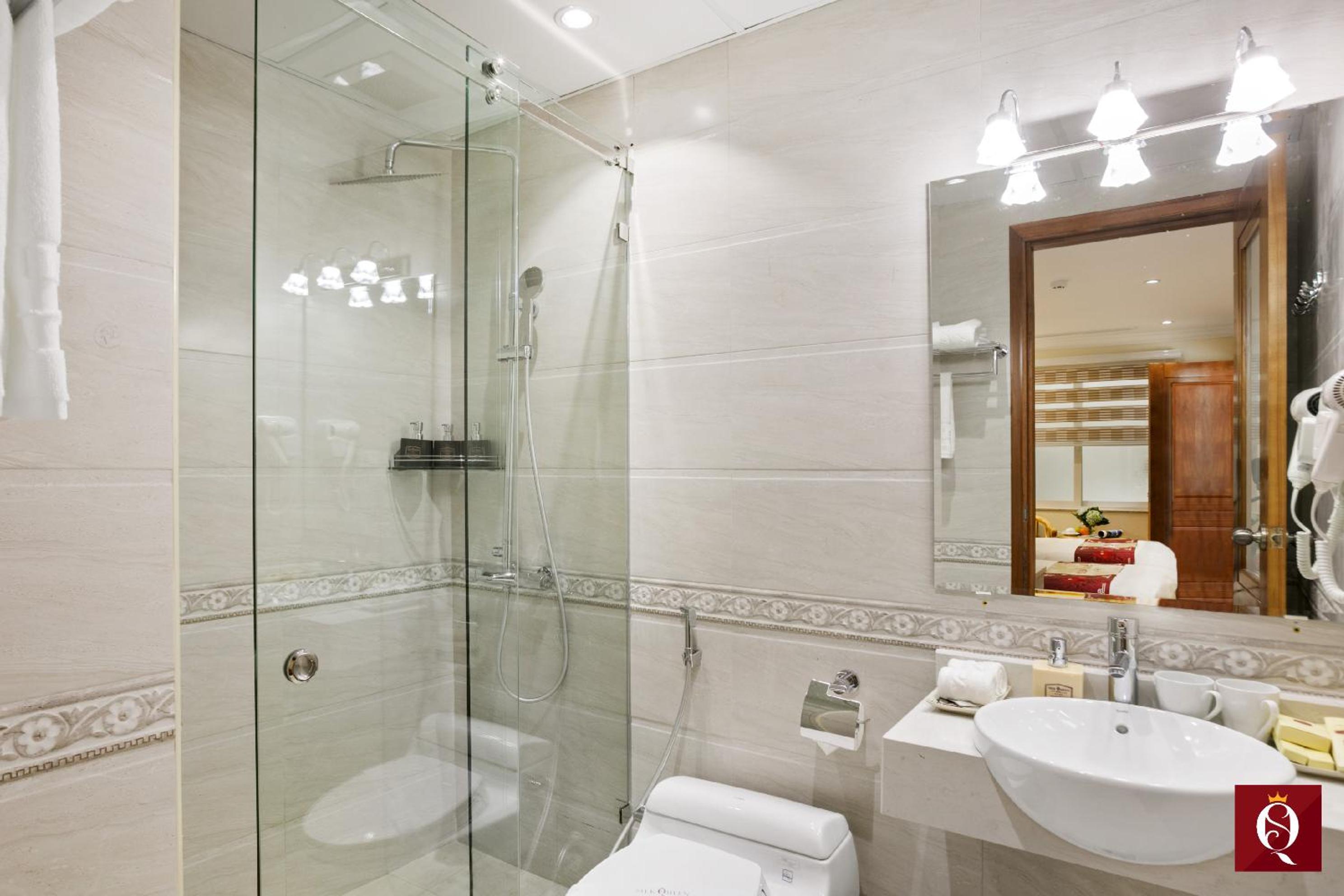 Silk Queen Grand Hotel in Hanoi offers spacious, air-conditioned rooms with modern amenities like flat-screen TVs, private bathrooms with a relaxing bath, and complimentary toiletries. Some rooms even have a cozy seating area and a private terrace or balcony for a touch of luxury.